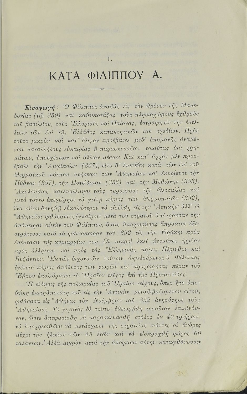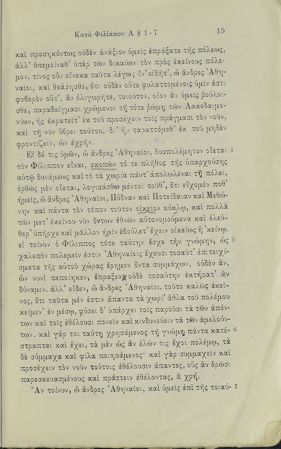 Σχολικό εγχειρίδιο Αρχαίων Ελληνικών Ε΄ Εξαταξίου Γυμνασίου που περιλαμβάνει τον Λόγο του Δημοσθένη Α΄ κατά Φιλίππου, εισαγωγή, ερμηνευτικά και γραμματικά σχόλια και παρατηρήσεις.