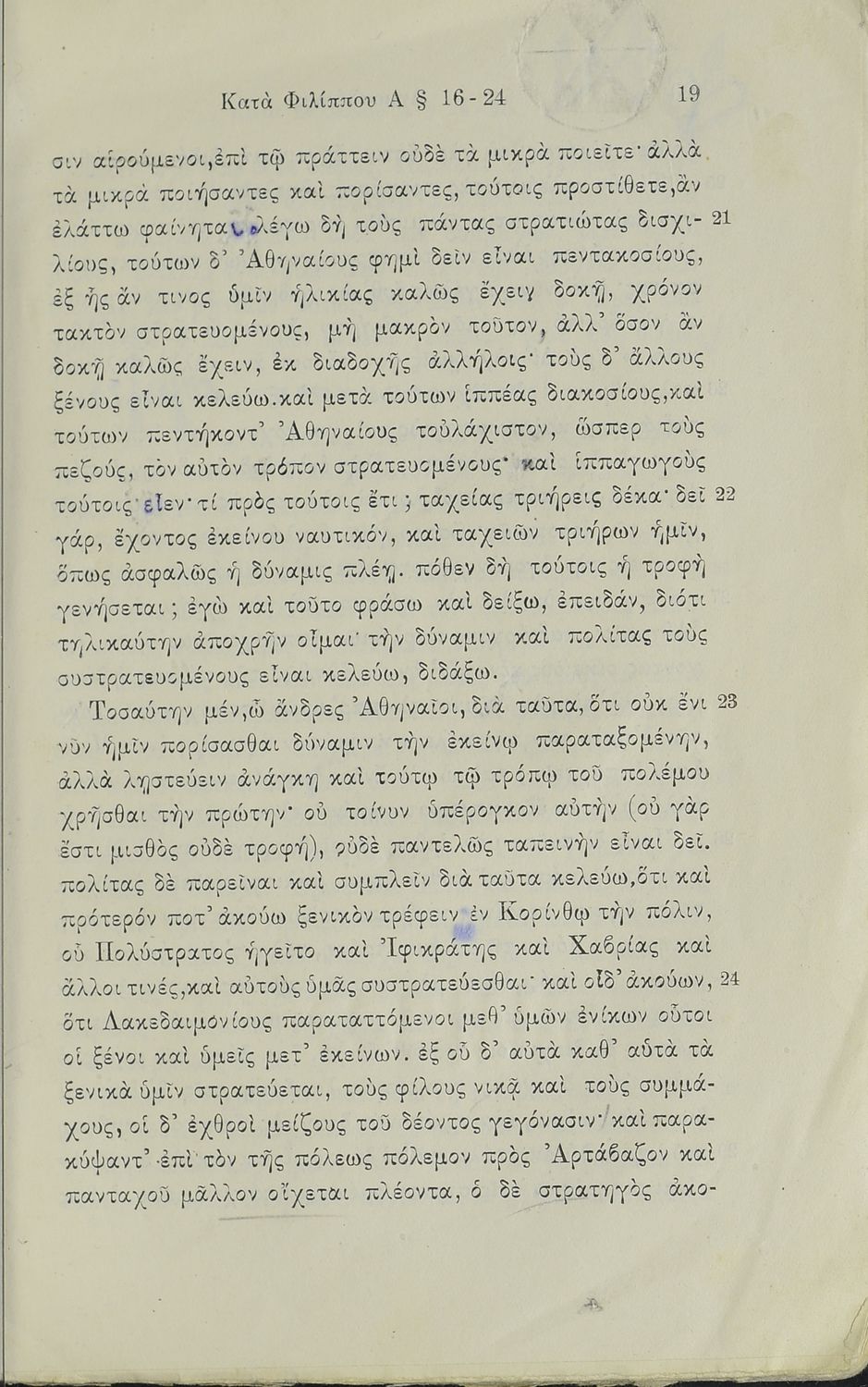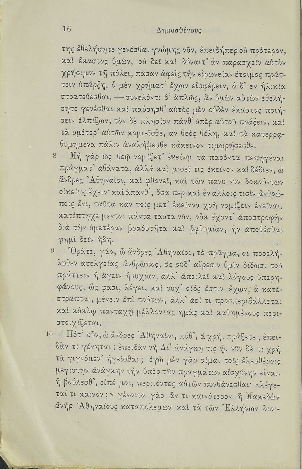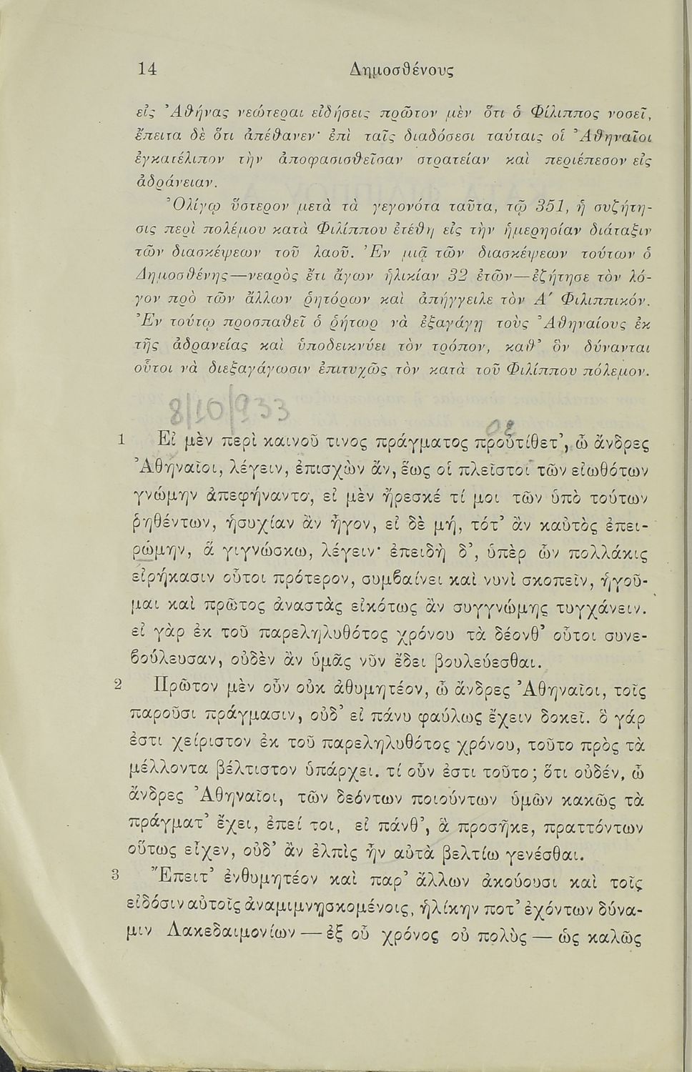 Σχολικό εγχειρίδιο Αρχαίων Ελληνικών Γ΄ Γυμνασίου που περιλαμβάνει τον Λόγο του Δημοσθένη Α΄ κατά Φιλίππου, εισαγωγικά σχόλια στο έργο και τη ζωή του, ερμηνευτικά και γραμματικά σχόλια και παρατηρήσεις.