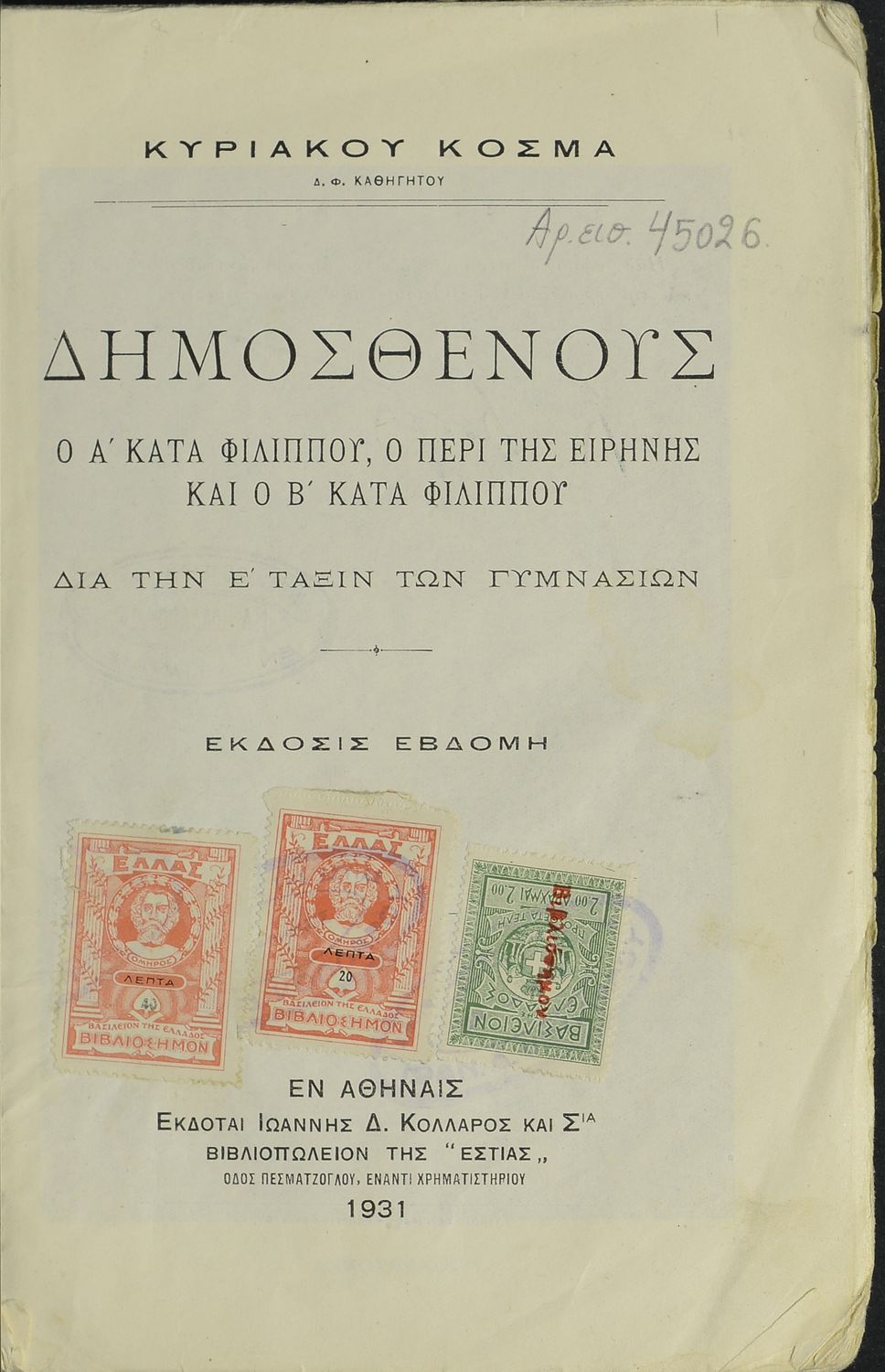 Τίτλος: Δημοσθένους ο A΄ κατά Φιλίππου, Ο περί ειρήνης και Β΄ κατά Φιλίππου. Δια την Ε΄ Τάξιν των Γυμνασίων