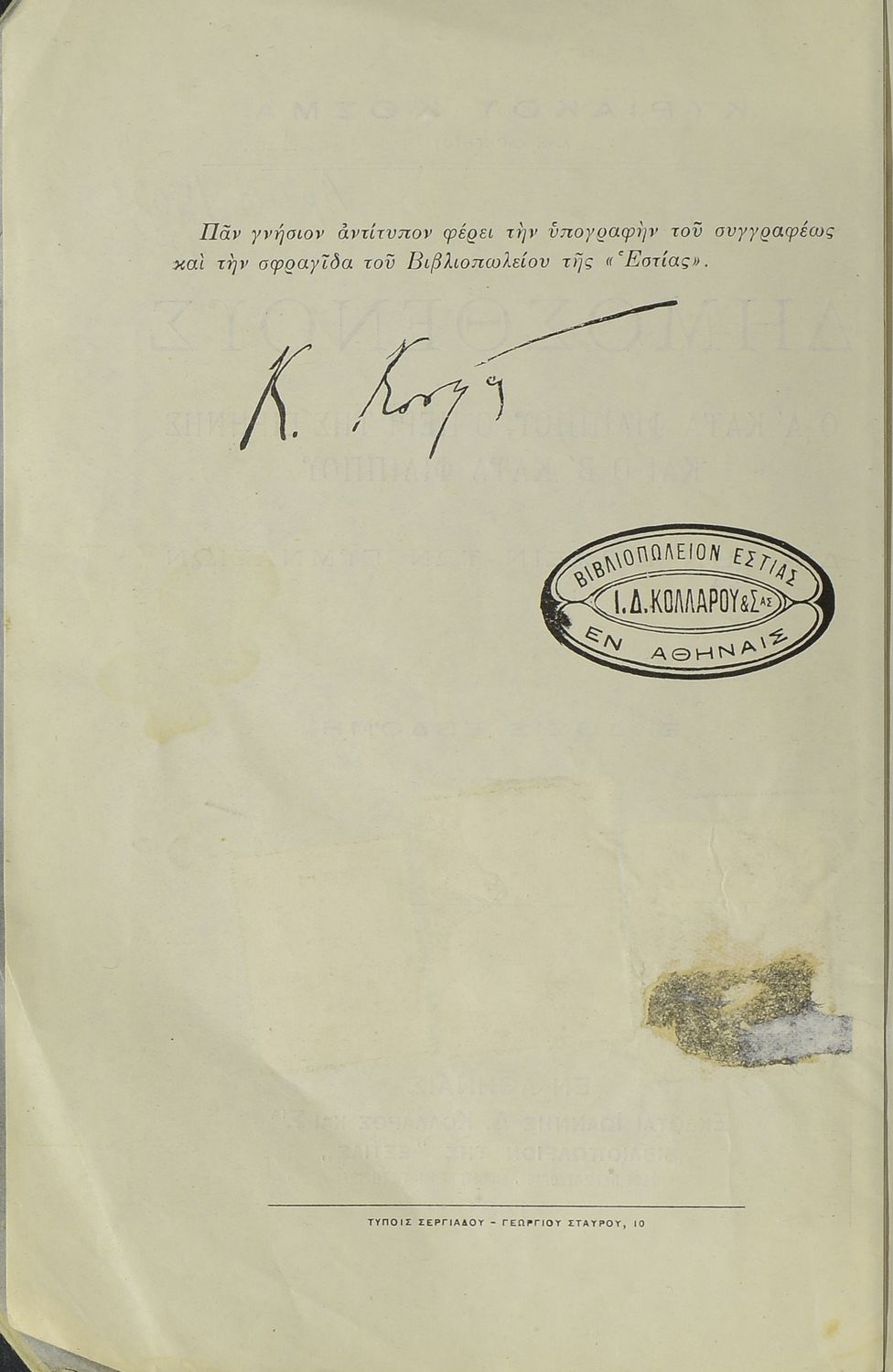 Εκδότης: Ιωάννης Δ. Κολλάρος και ΣΙΑ, Βιβλιοπωλείο της "Εστίας"