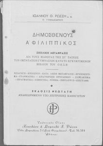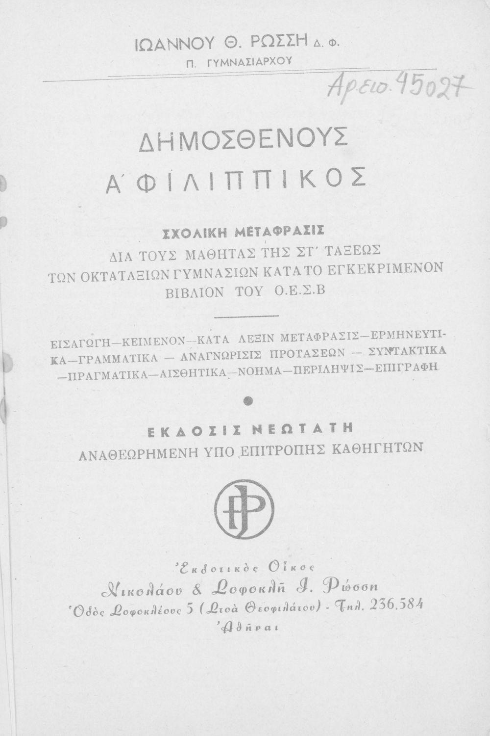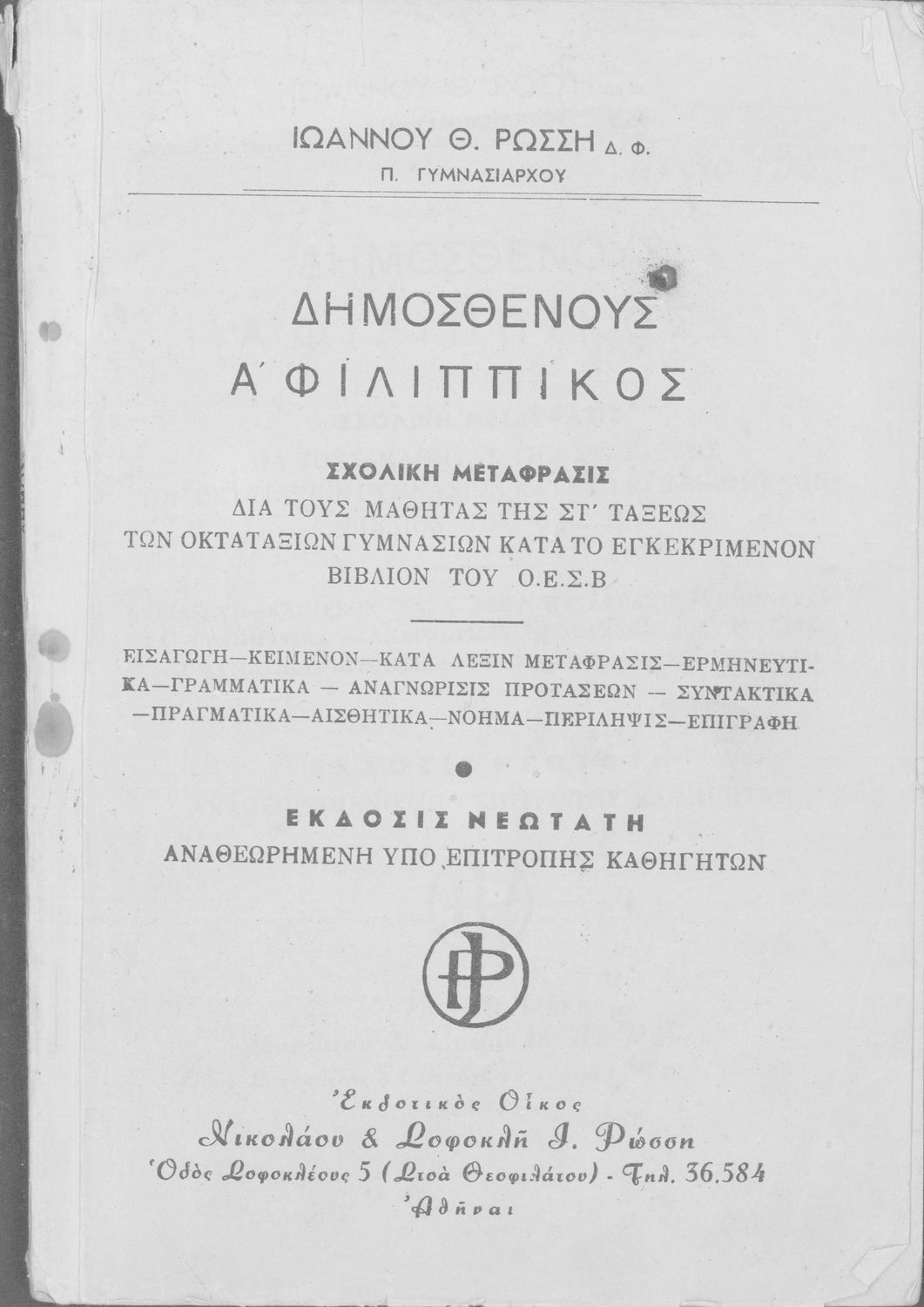 Τίτλος: Δημοσθένους Α΄ Φιλιππικός δια τους μαθητάς της ΣΤ΄ τάξεως των Οκταταξίων Γυμνασίων κατά το εγκεκριμένον βιβλίον του Ο.Ε.Σ.Β.