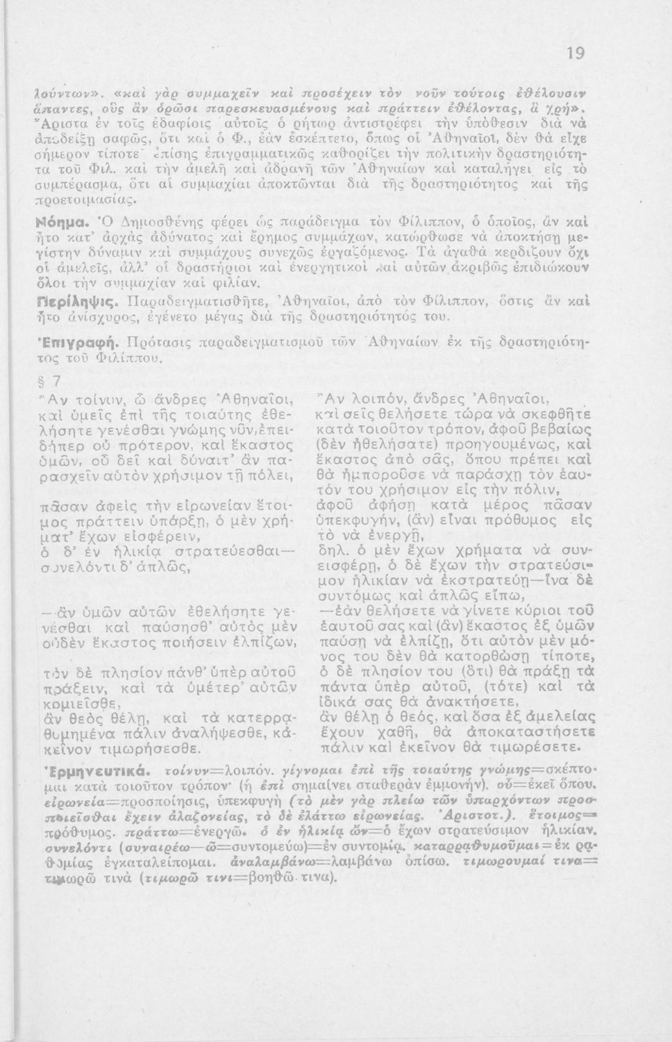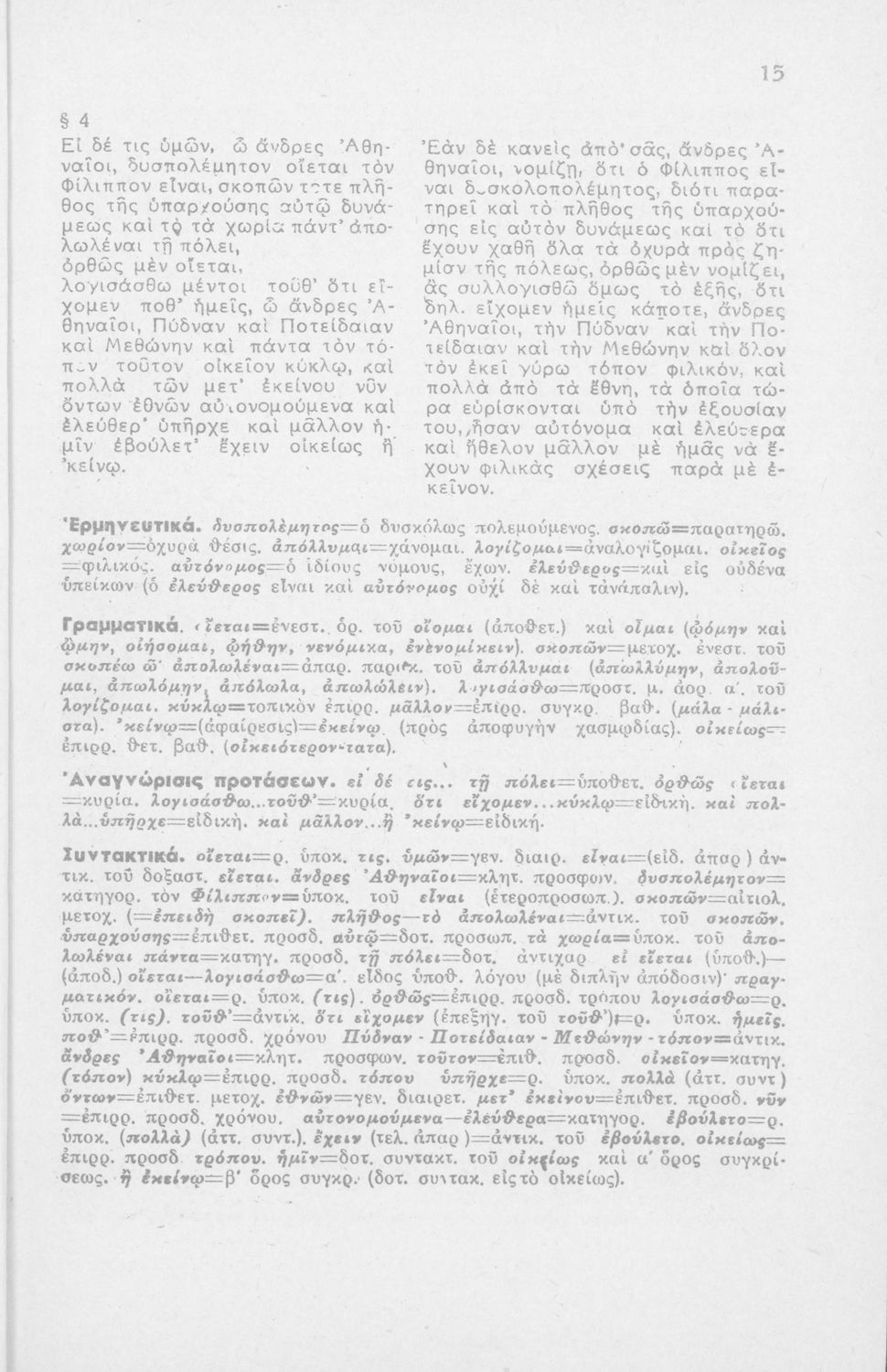 Μαθητικό βοήθημα Αρχαίων Ελληνικών Δ' Γυμνασίου που περιλαμβάνει τον Α΄ Φιλιππικό του Δημοσθένη, μετάφραση, γραμματικά, αισθητικά και σημασιολογικά σχόλια και αντικαταστάσεις ρημάτων.