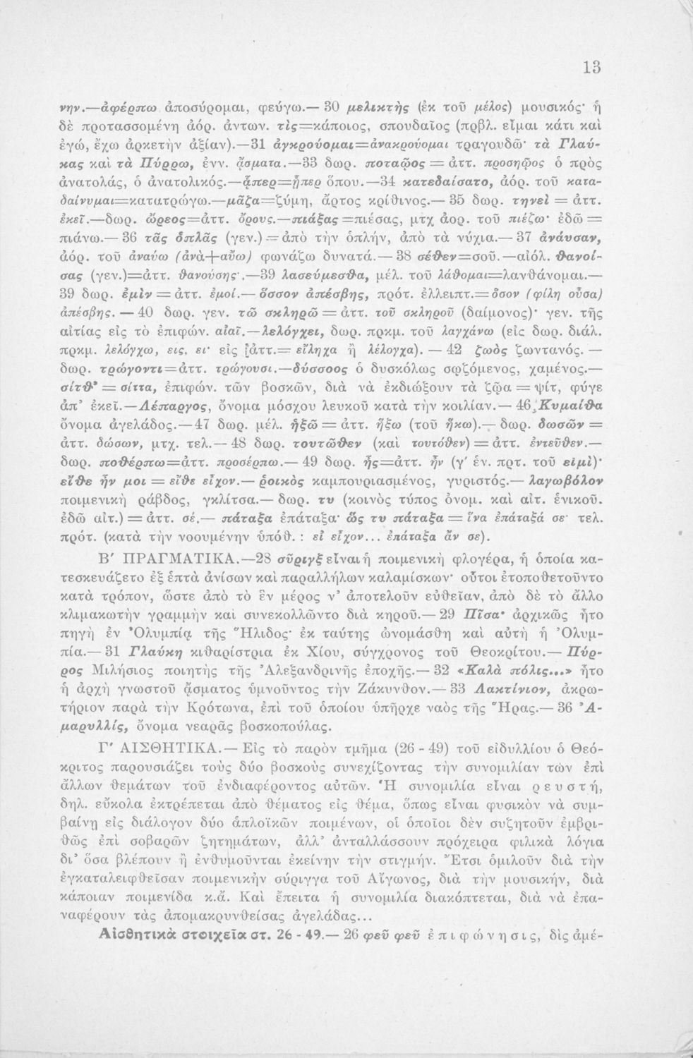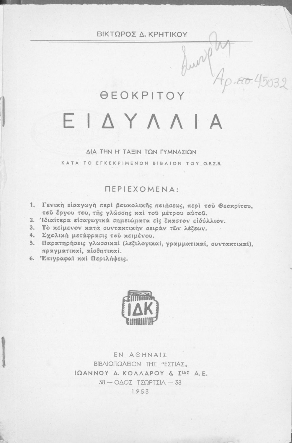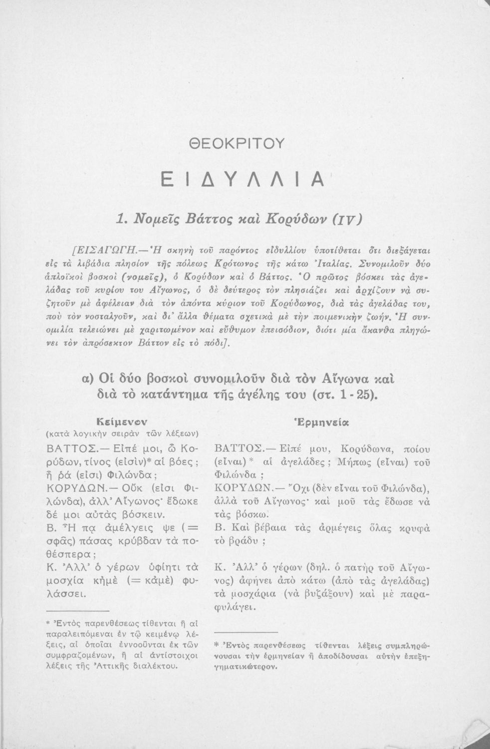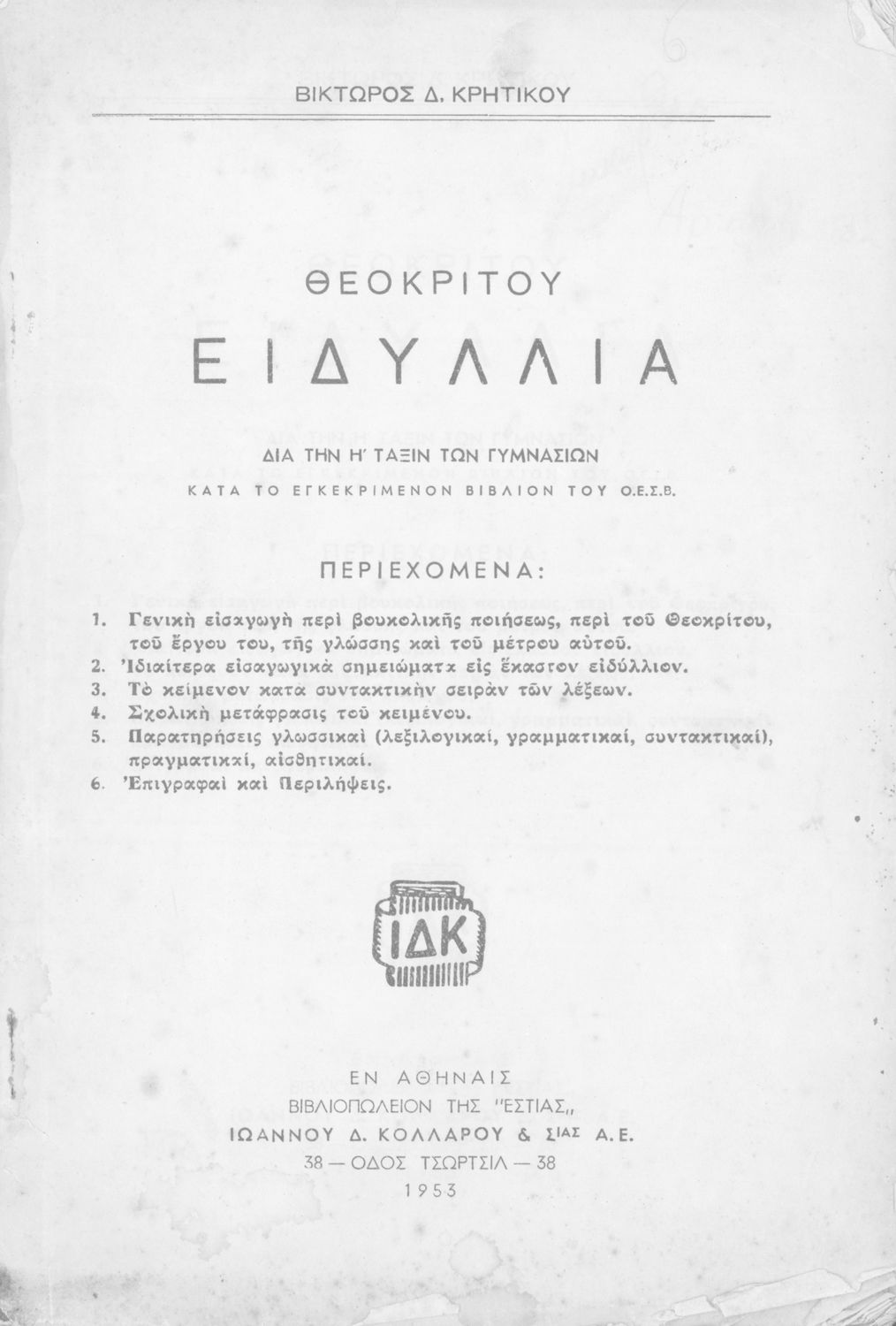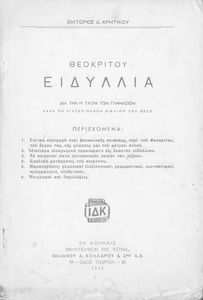 Μαθητικό βοήθημα Αρχαίων Ελληνικών Η' Γυμνασίου που περιέχει μετάφραση των Ειδυλλίων του Θεόκριτου, συντακτική ανάλυση και ερμηνευτικά σχόλια.