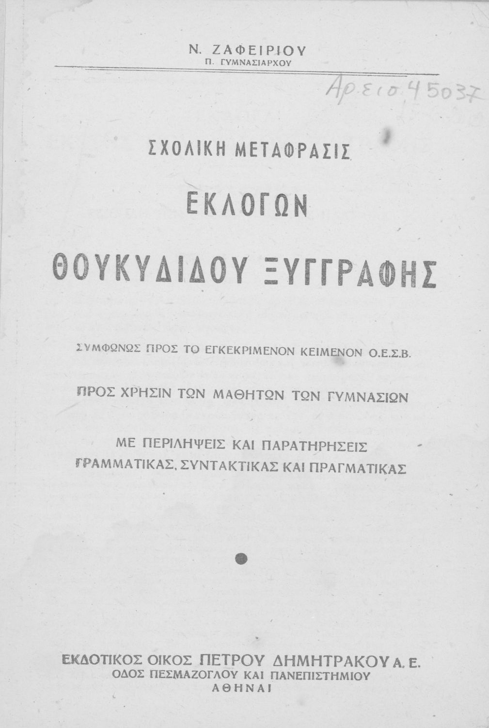 Τίτλος: Σχολική μετάφρασις Εκλογών Θουκυδίδου Ξυγγραφής προς χρήσιν των μαθητών των Γυμνασίων