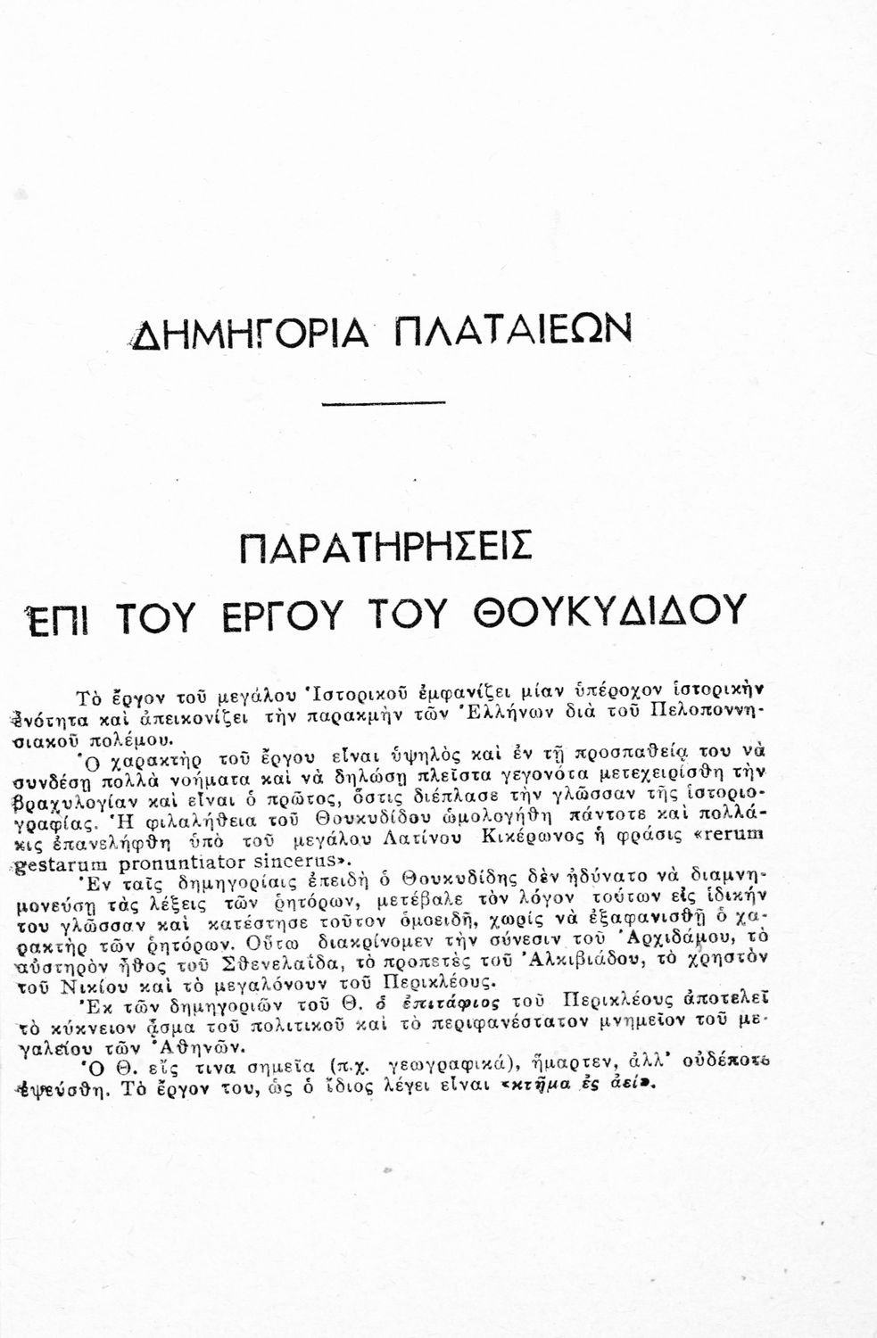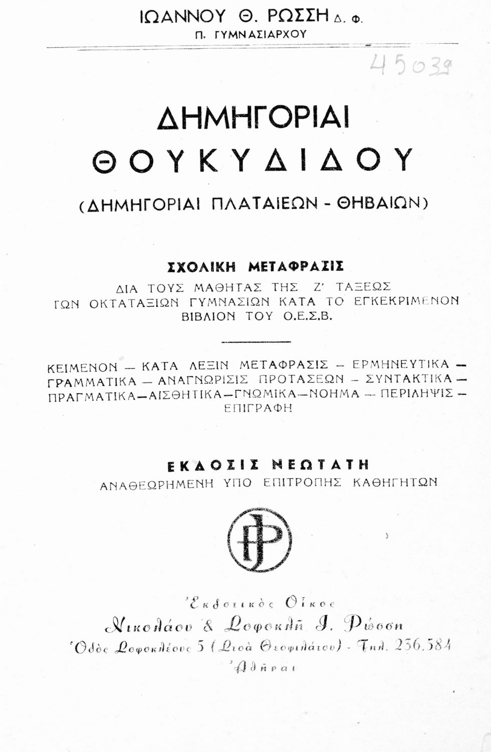 Κωδικός αναγνώρισης: 01-45039 Τίτλος: Δημηγορίαι Θουκυδίδου (Δημηγορίαι Πλαταίεων- Θηβαίων-Κλέωνος) δια τους μαθητάς της Ζ΄ τάξεως των Οκταταξίων Γυμνασίων κατά το εγκεκριμένον βιβλίον του Ο.Ε.Σ.Β. Συγγραφέας: Θουκυδίδης, Ιωάννης Ρώσσης (μετάφραση, σχόλια) Μέγεθος και υπόστρωμα: Μαθητικό βοήθημα, μαλακό εξώφυλλο, 112 σελίδες. |