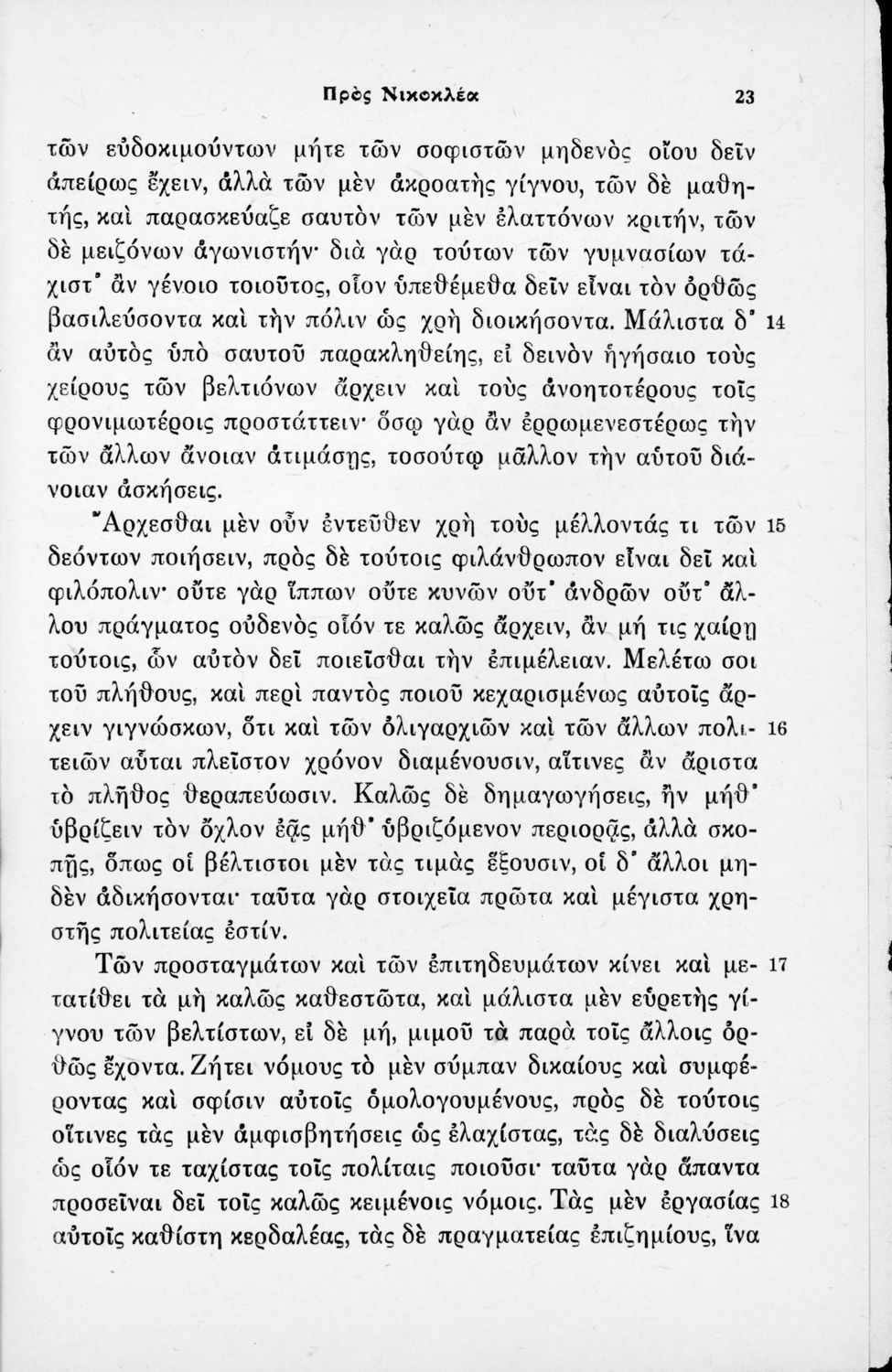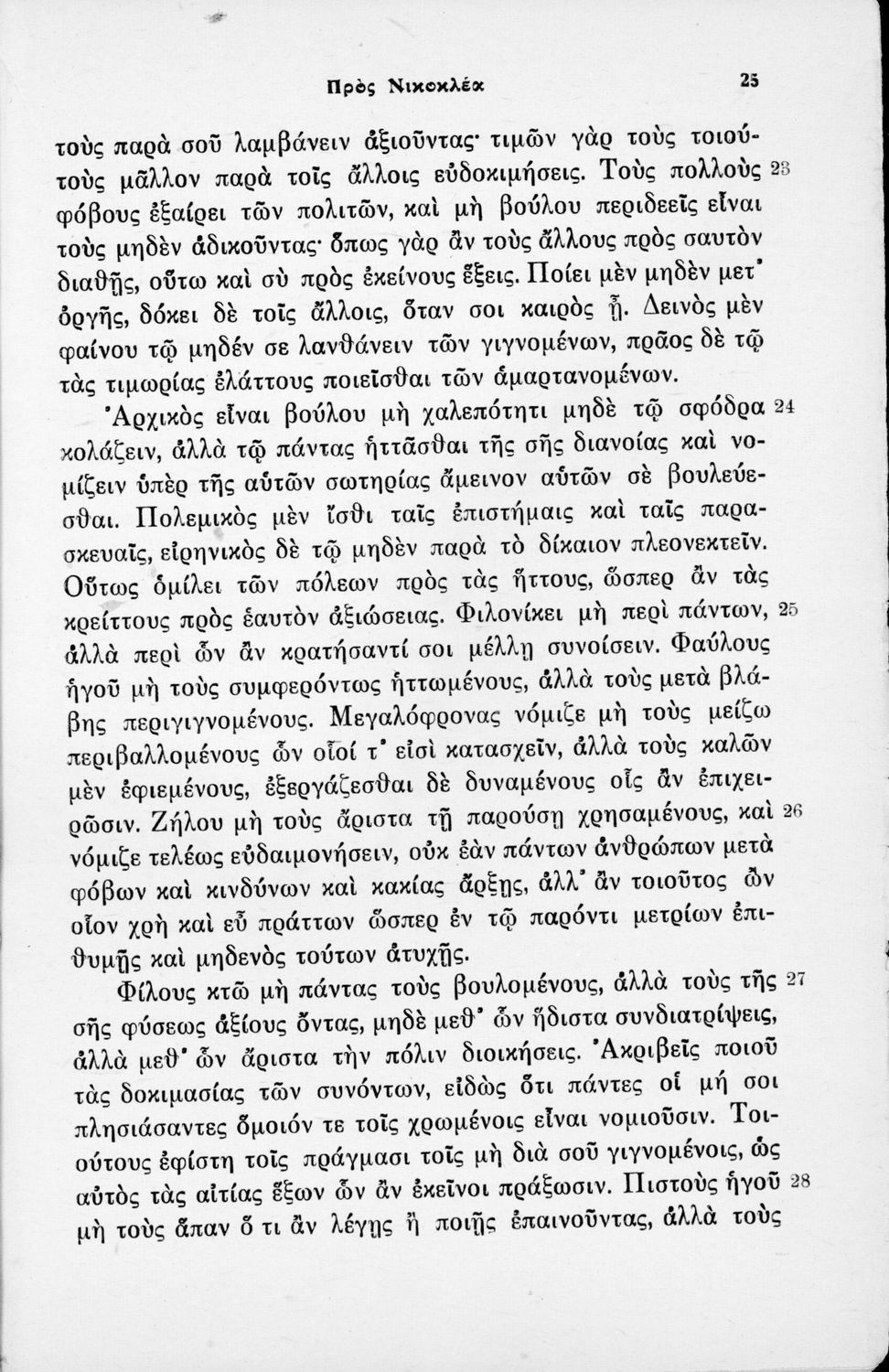 Σχολικό εγχειρίδιο Αρχαίων Ελληνικών που περιλαμβάνει εισαγωγή στη ζωή και το έργο του Ισοκράτη,τους Λόγους του Προς Δημόνικον, Προς Νικοκλέα και Ευαγόρας, και ερμηνευτικές σημειώσεις.