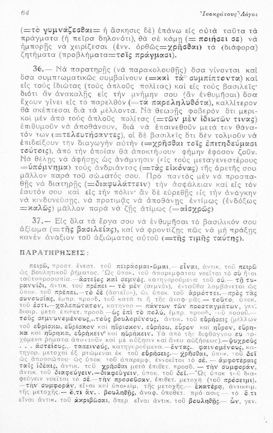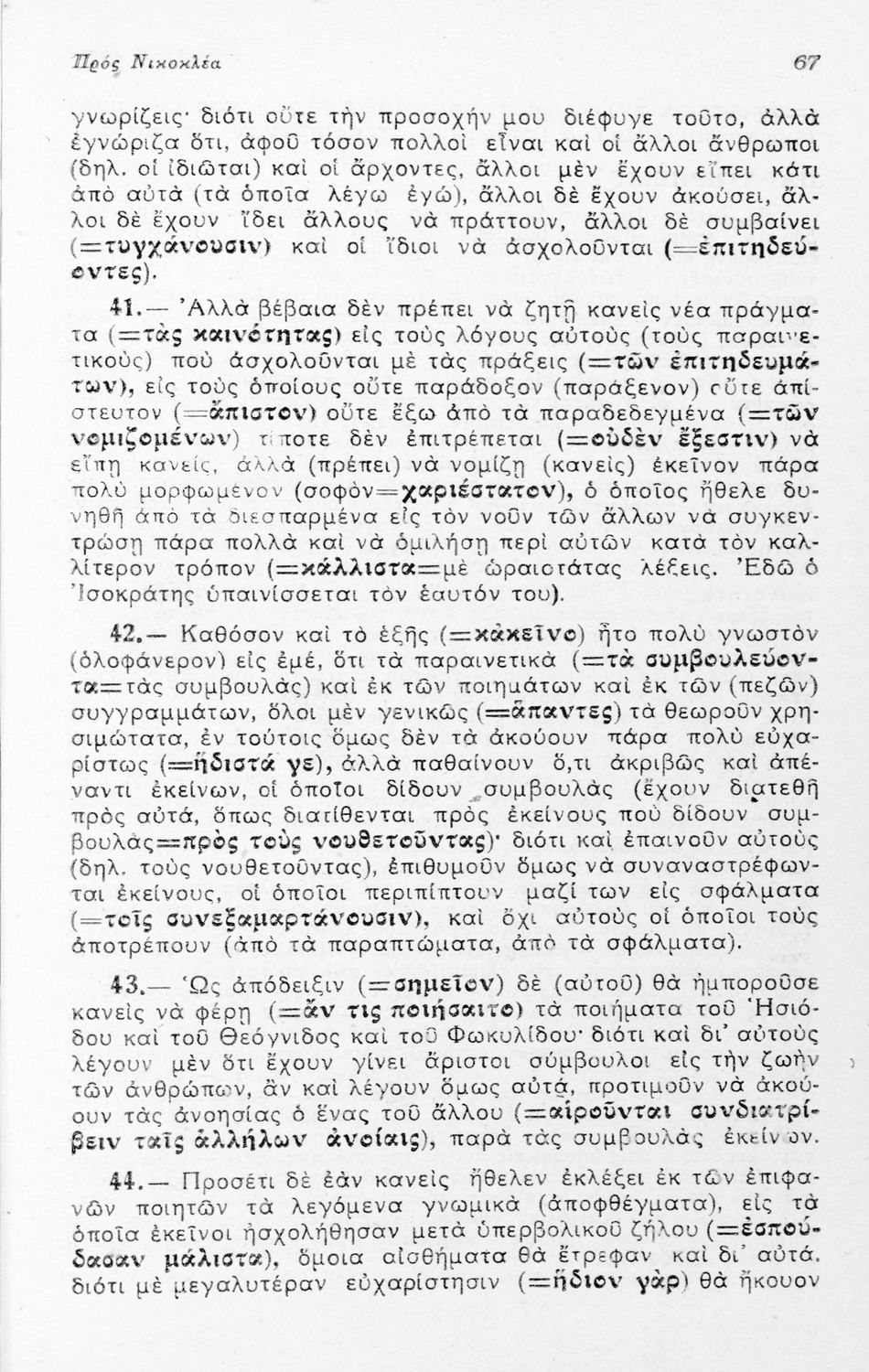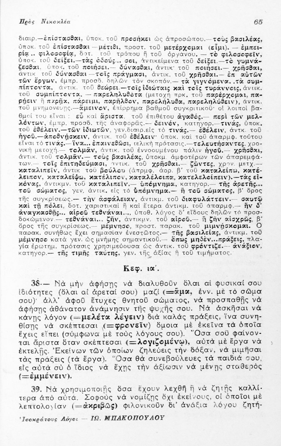Μαθητικό βοήθημα Αρχαίων Ελληνικών για τους μαθητές της Ε΄ Οκταταξίου Γυμνασίου που περιλαμβάνει τους Λόγους του Ισοκράτη Προς Δημόνικον και Προς Νικοκλέα, μετάφραση, γραμματικά και συντακτικά σχόλια και ...