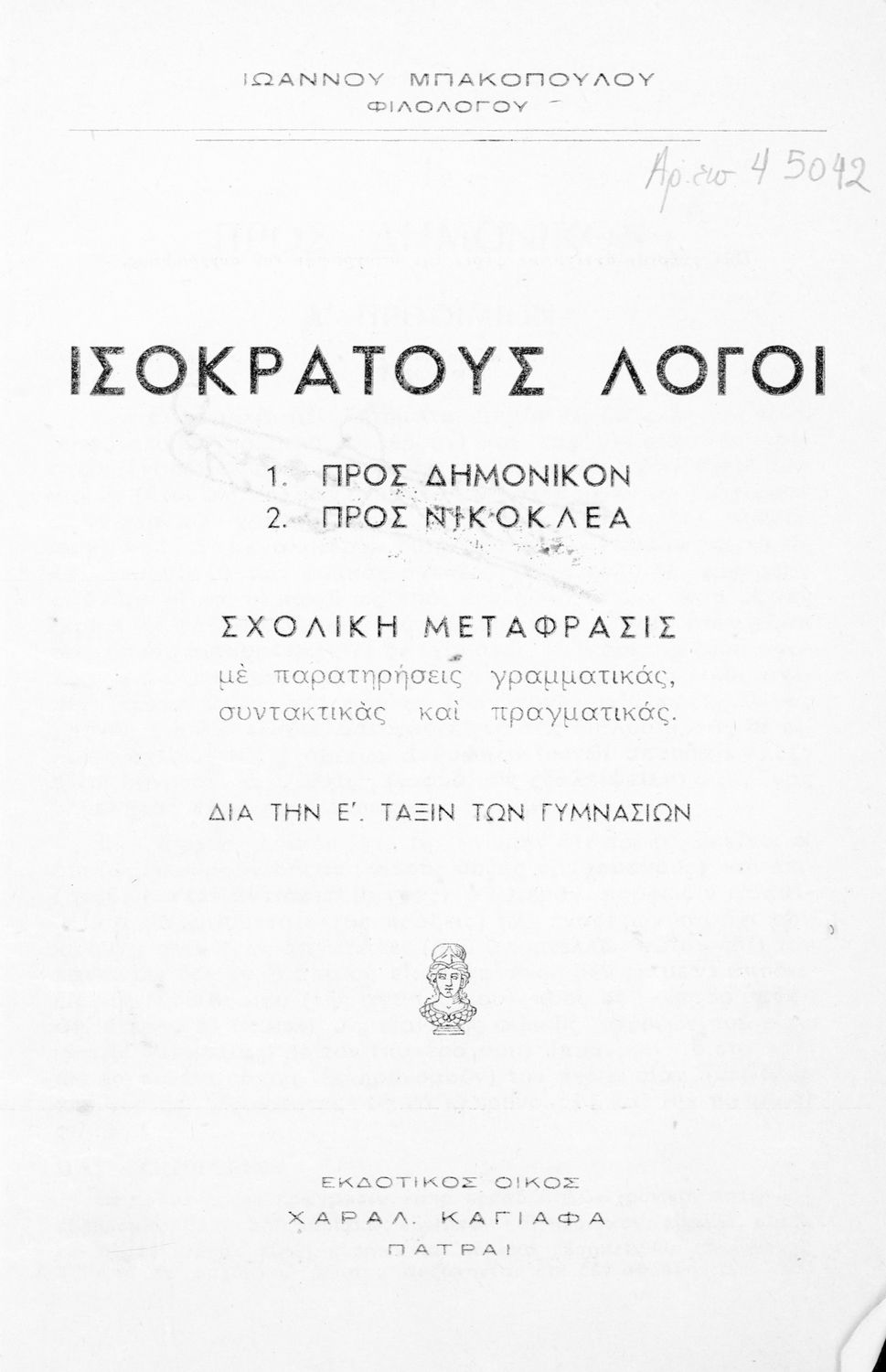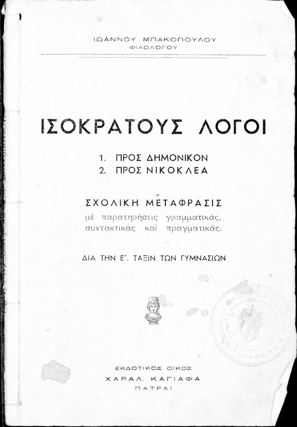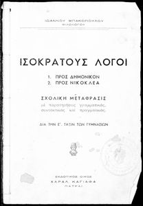 Τίτλος: Ισοκράτους Λόγοι 1. προς Δημόνικον 2. προς Νικοκλέα δια την Ε΄ τάξιν των Γυμνασίων