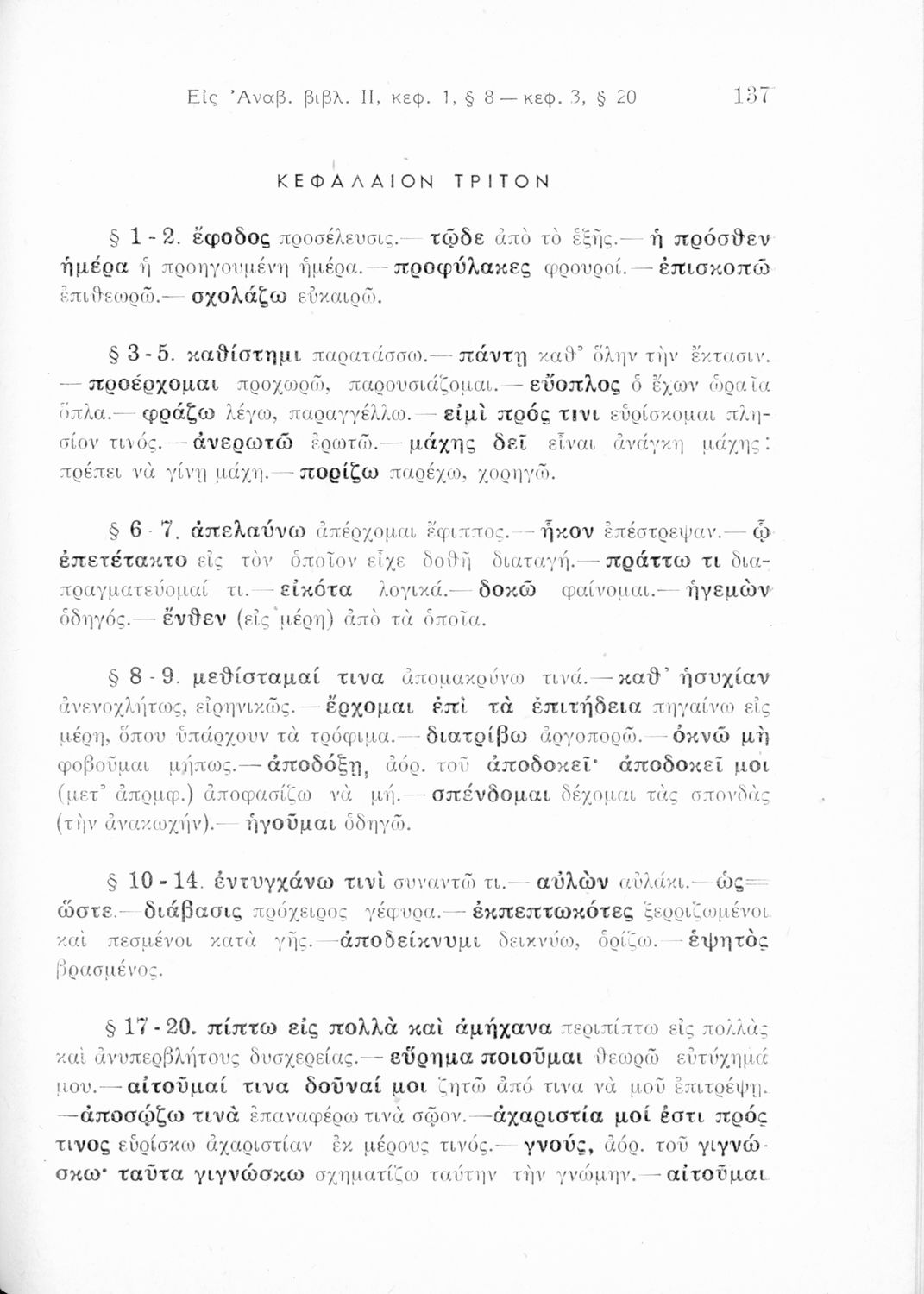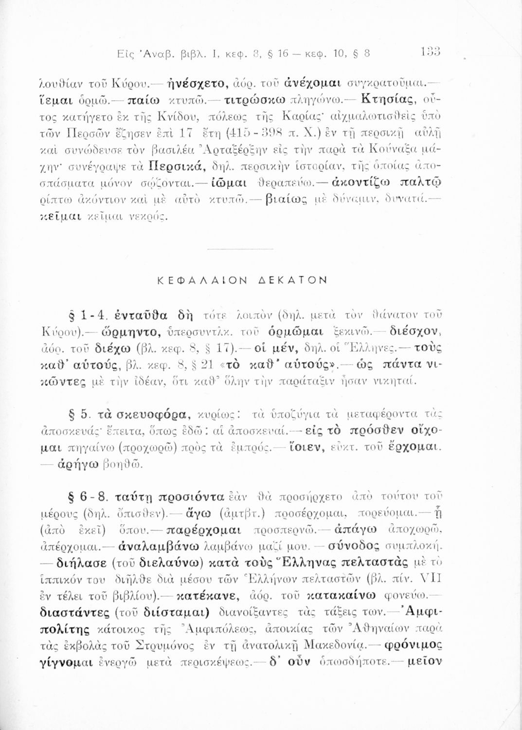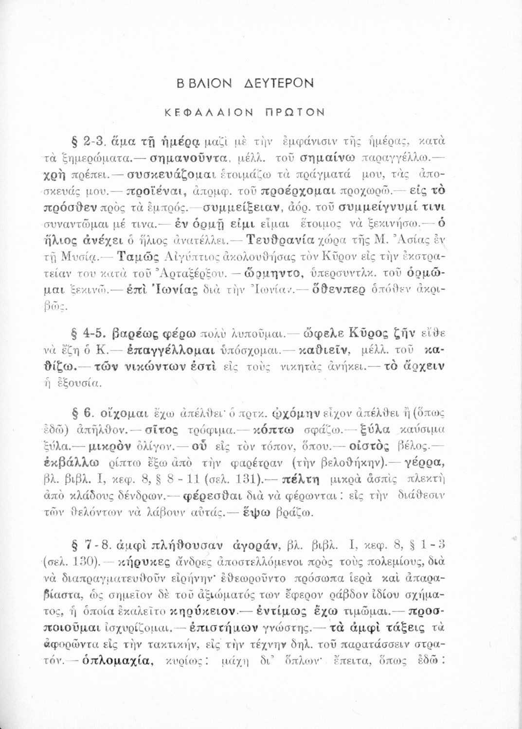 Σχολικό εγχειρίδιο της Γ' Ελληνικού Σχολείου και Αστικών Σχολείων για το μάθημα των Αρχαίων Ελληνικών. Το σύγγραμμα περιλαμβάνει κείμενα κατ΄ επιλογή από τα τέσσερα τελευταία βιβλία του έργου Κύρου Ανάβασις. ...