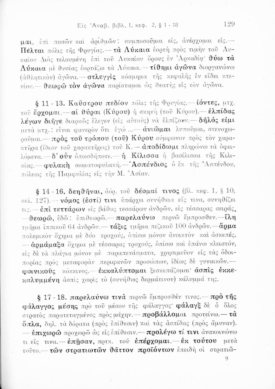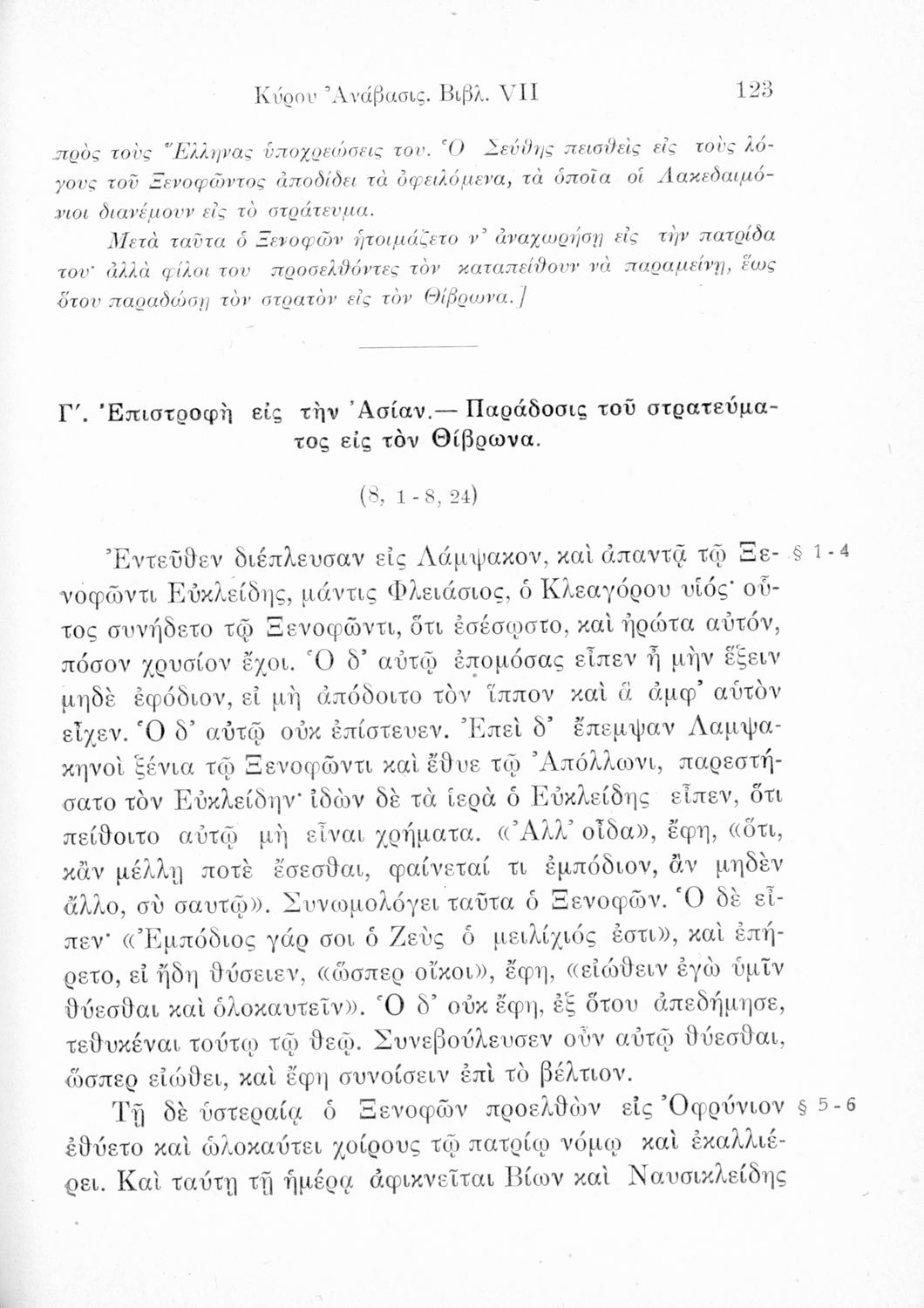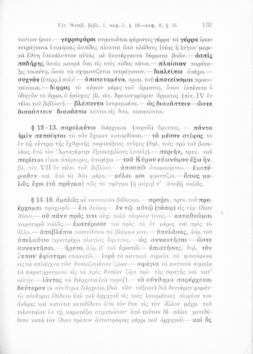 Σχολικό εγχειρίδιο της Γ' Ελληνικού Σχολείου και Αστικών Σχολείων για το μάθημα των Αρχαίων Ελληνικών. Το σύγγραμμα περιλαμβάνει κείμενα κατ΄ επιλογή από τα τέσσερα τελευταία βιβλία του έργου Κύρου Ανάβασις. ...