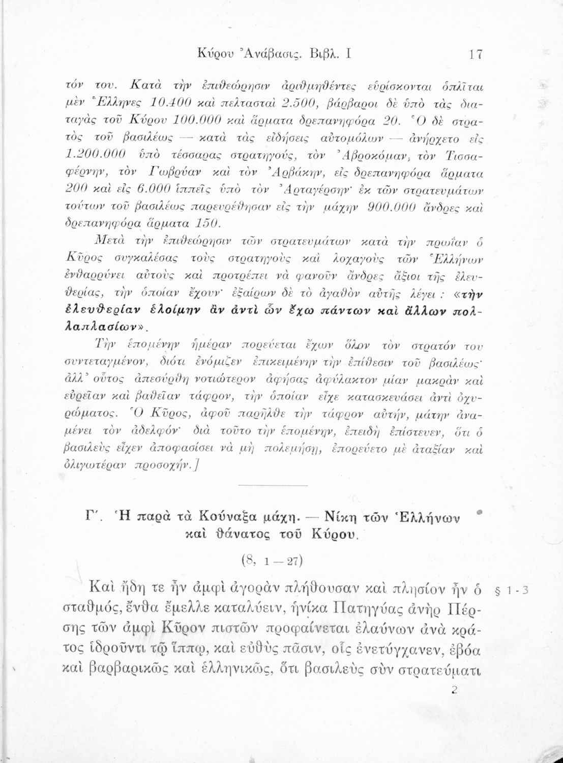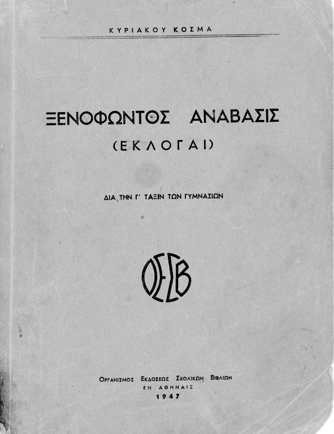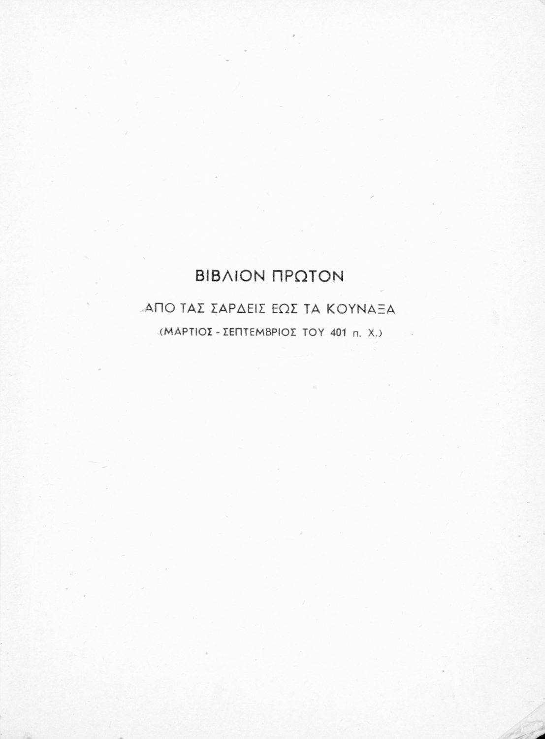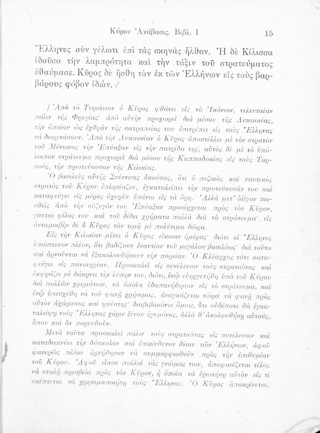 Σχολικό εγχειρίδιο της Γ' Ελληνικού Σχολείου και Αστικών Σχολείων για το μάθημα των Αρχαίων Ελληνικών. Το σύγγραμμα περιλαμβάνει κείμενα κατ΄ επιλογή από τα τέσσερα τελευταία βιβλία του έργου Κύρου Ανάβασις. ...