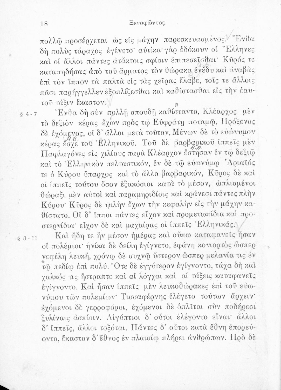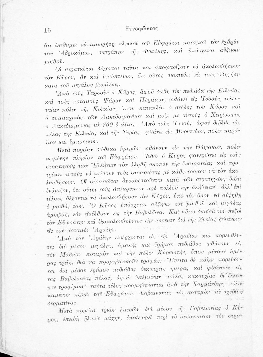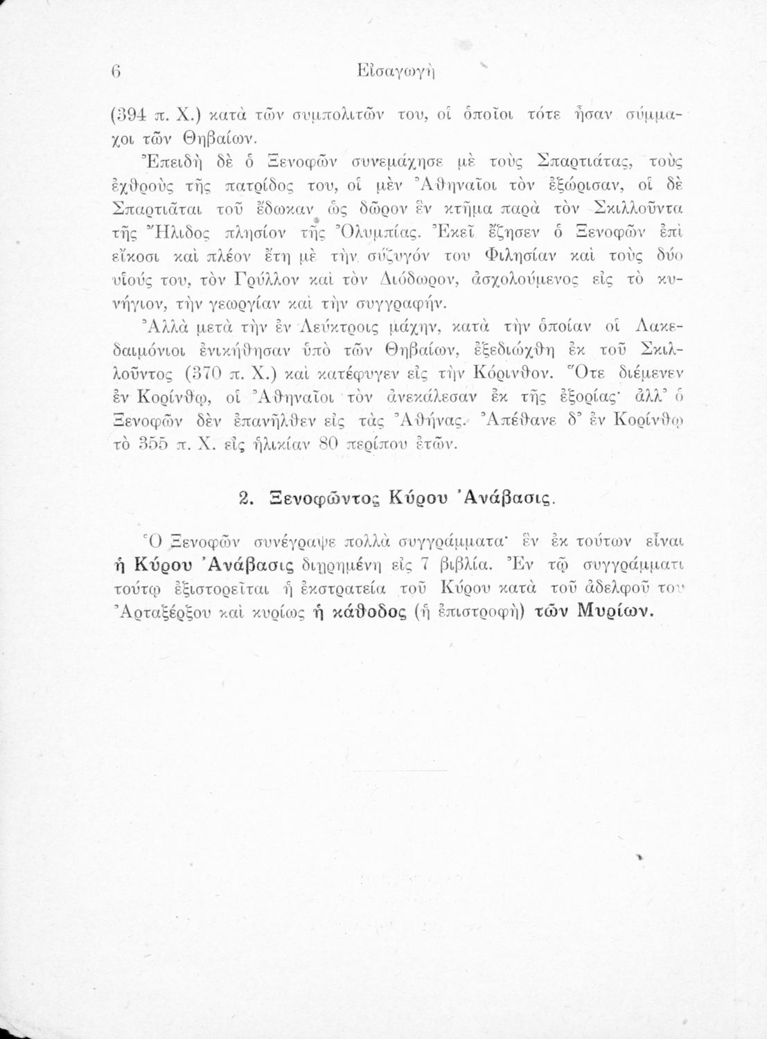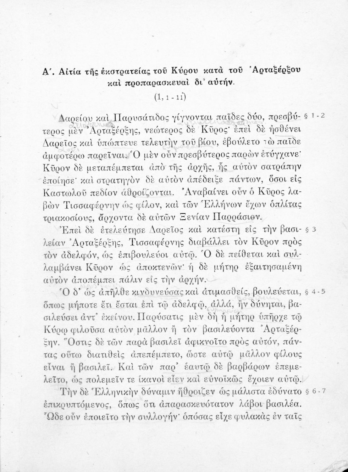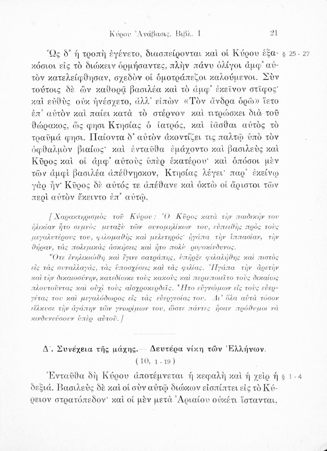 Σχολικό εγχειρίδιο της Γ' Ελληνικού Σχολείου και Αστικών Σχολείων για το μάθημα των Αρχαίων Ελληνικών. Το σύγγραμμα περιλαμβάνει κείμενα κατ΄ επιλογή από τα τέσσερα τελευταία βιβλία του έργου Κύρου Ανάβασις. ...
