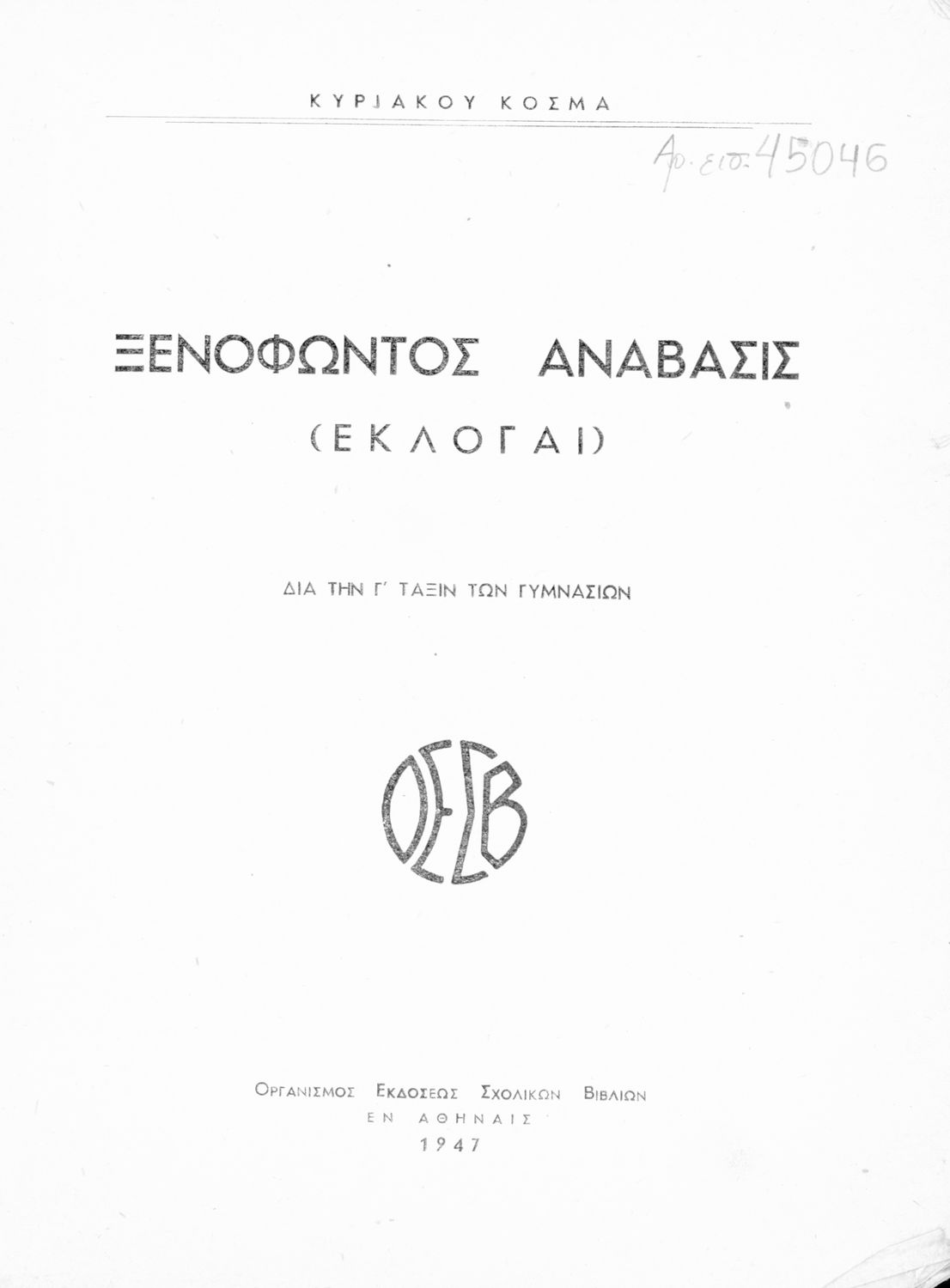 Τίτλος: Ξενοφώντος Ανάβασις (εκλογαί). Δια την Γ΄ Τάξιν των Γυμνασίων
