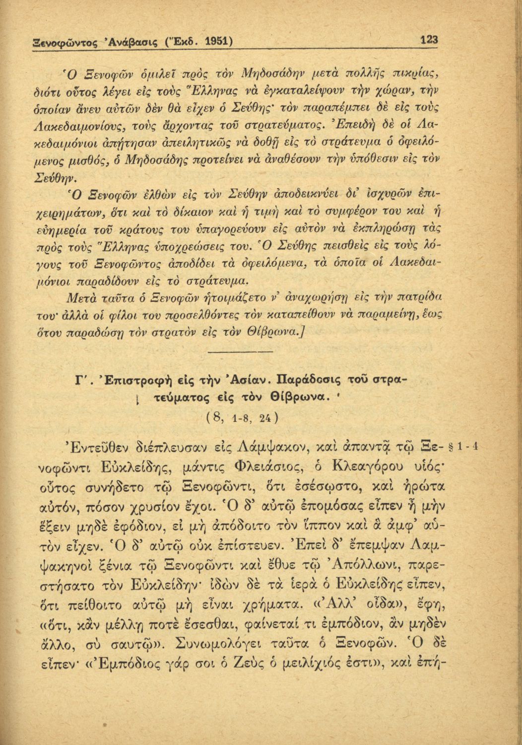 Σχολικό εγχειρίδιο της Γ΄ Γυμνασίου για το μάθημα των Αρχαίων. Περιέχει αποσπάσματα από το έργο του Ξενοφώντα, ερμηνευτικά και πραγματολογικά σχόλια και λεξιλογικές παρατηρήσεις.