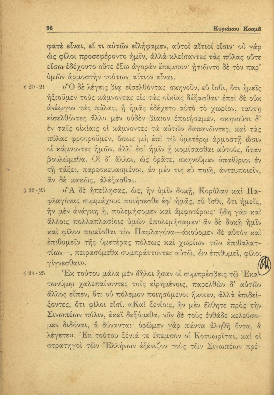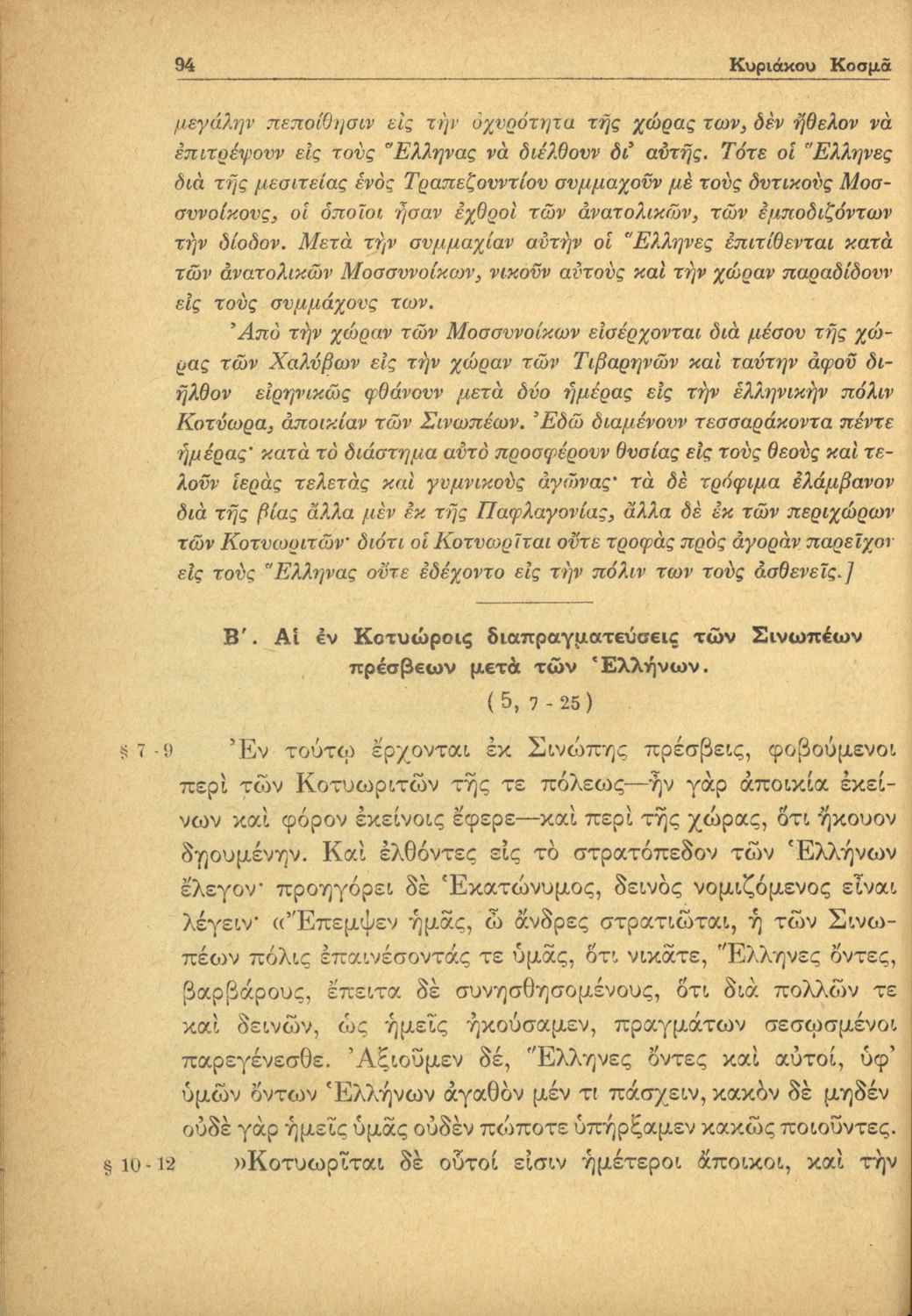 Βαθμίδα εκπαίδευσης: Δευτεροβάθμια Τάξη: Β' Γυμνασίου Μάθημα: Αρχαία Ελληνικά Γλώσσα: Απλή καθαρεύουσα Παρουσίαση περιεχομένου: Σχολικό εγχειρίδιο της Β΄ Γυμνασίου για το μάθημα των Αρχαίων Ελληνικών. Περιέχει το αρχαίο κείμενο από το έργο Ανάβασις του Ξενοφώντα. Επίσης, περιλαμβάνει λεξιλογικές παρατηρήσεις, ερμηνευτικά, πραγματολογικά σχόλια και γραμματικές παρατηρήσεις του συγγραφέα. |