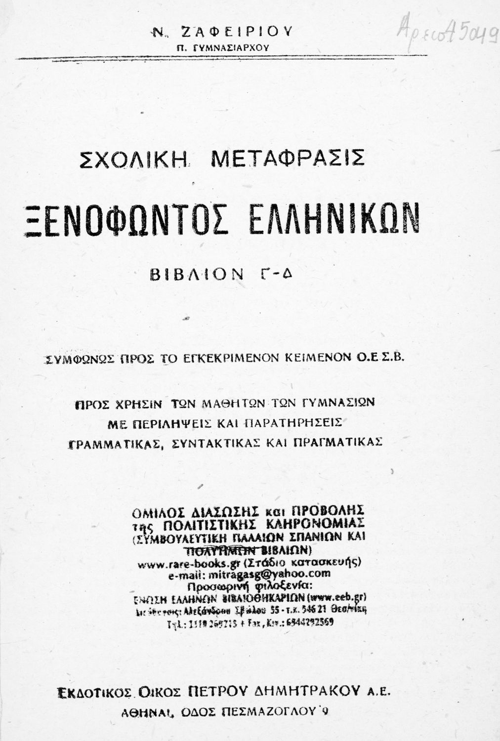 Τίτλος: Σχολική μετάφρασις Ξενοφώντος Ελληνικών βιβλίον Γ- Δ, προς χρήσιν των μαθητών των Γυμνασίων με περιλήψεις και παρατηρήσεις γραμματικάς, συντακτικάς και πραγματικάς
