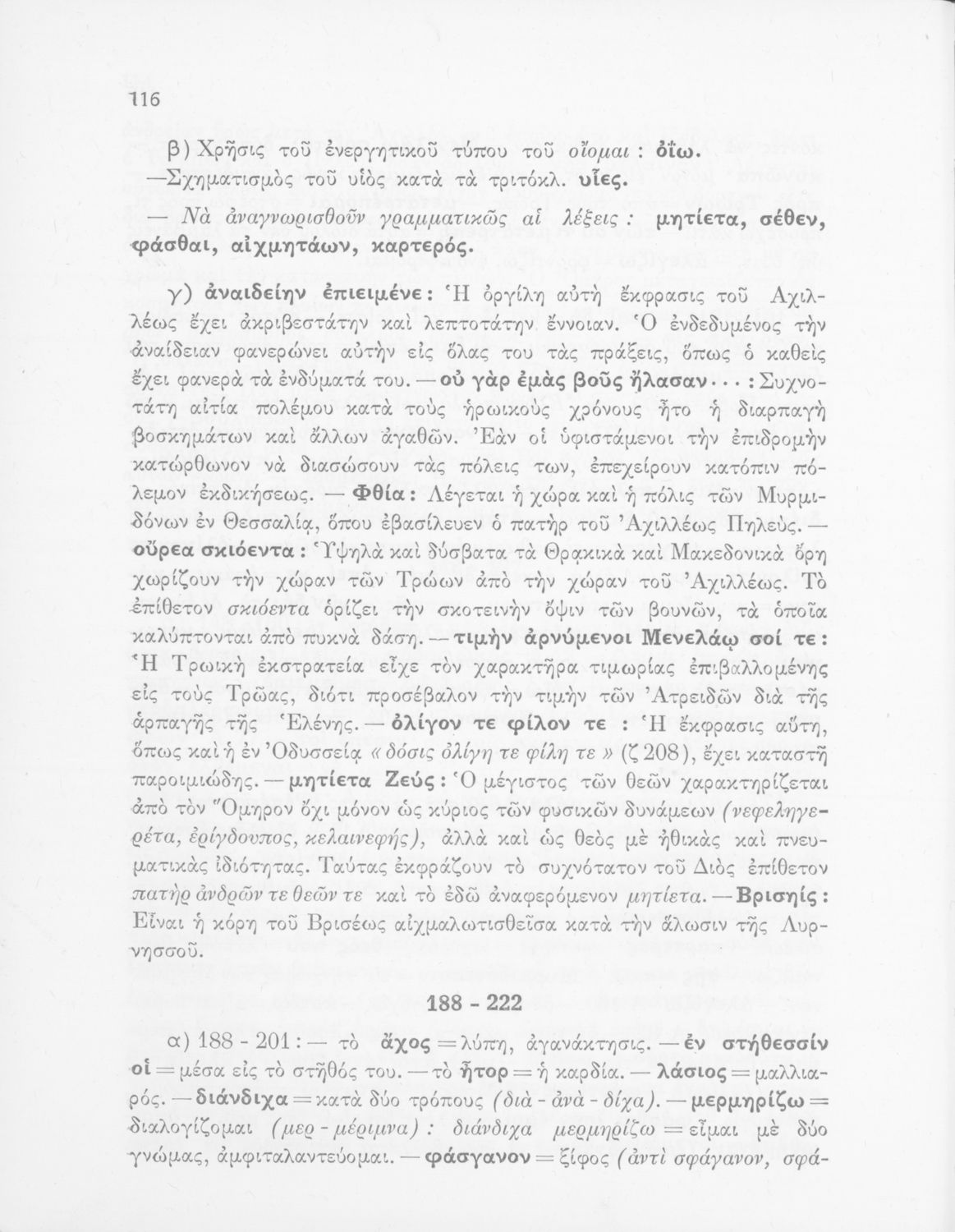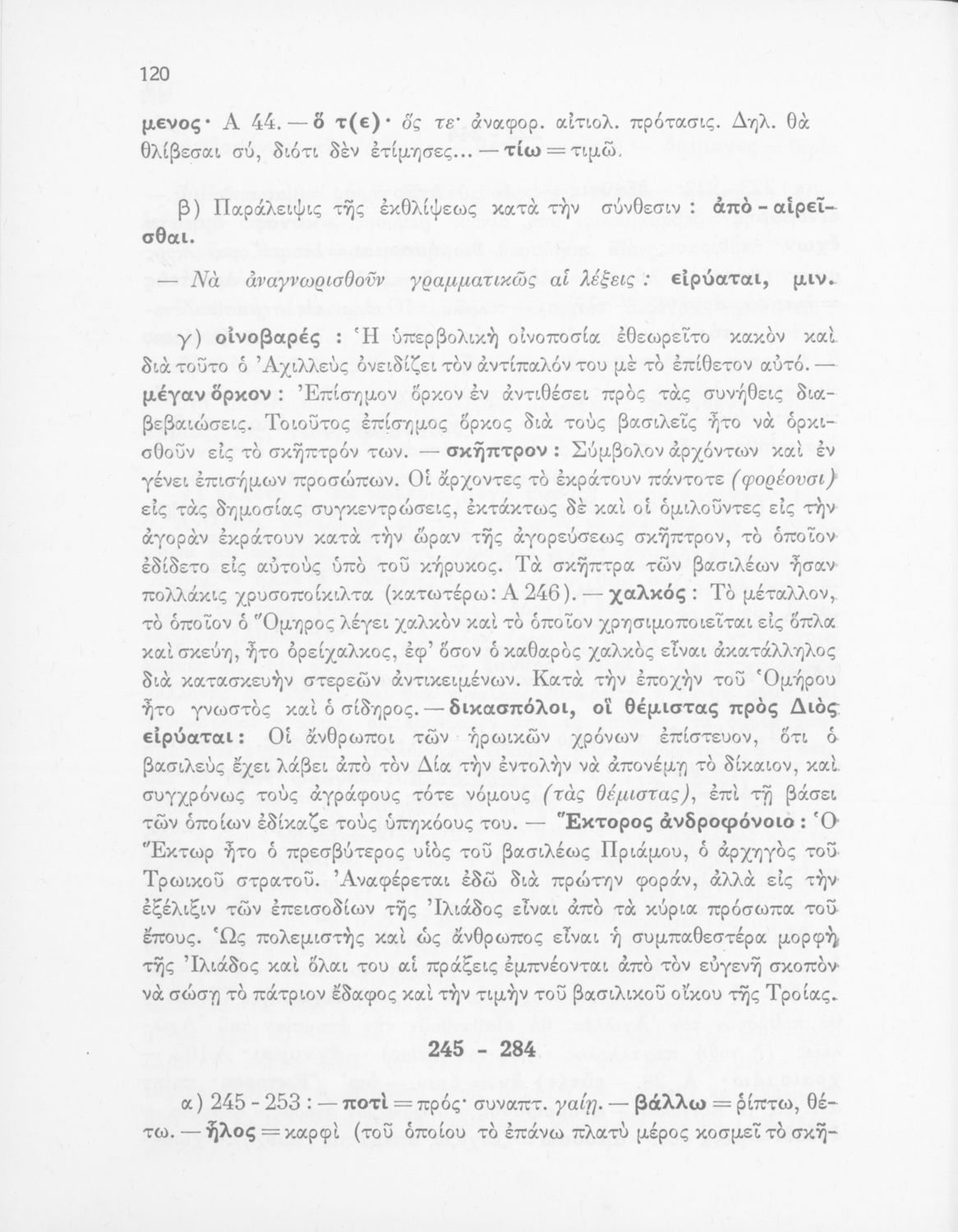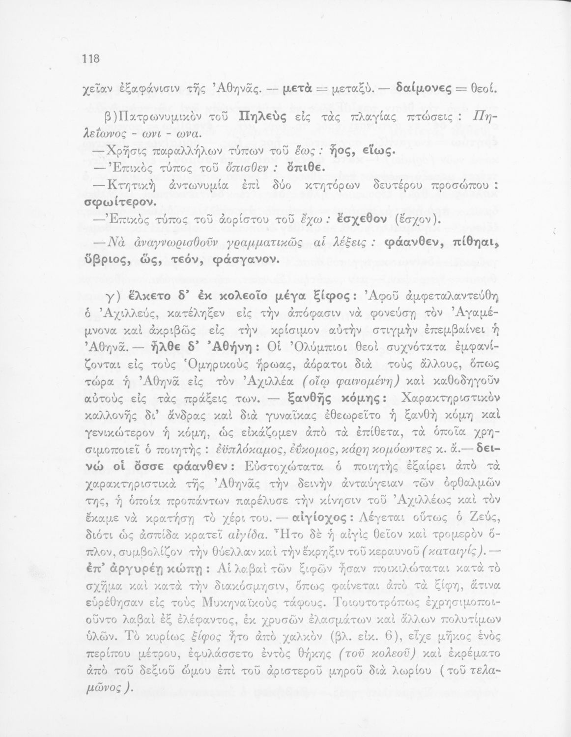 Μαθητικό βοήθημα του Ελληνικού Σχολείου, των Παρθεναγωγείων και του Γυμνασίου για το μάθημα των Αρχαίων Ελληνικών. Περιέχει τις ραψωδίες Ο, Π, Ρ, Σ, Τ, Χ, ψ, Ω από το πρωτότυπο με σχόλια και ερμηνευτικές ...
