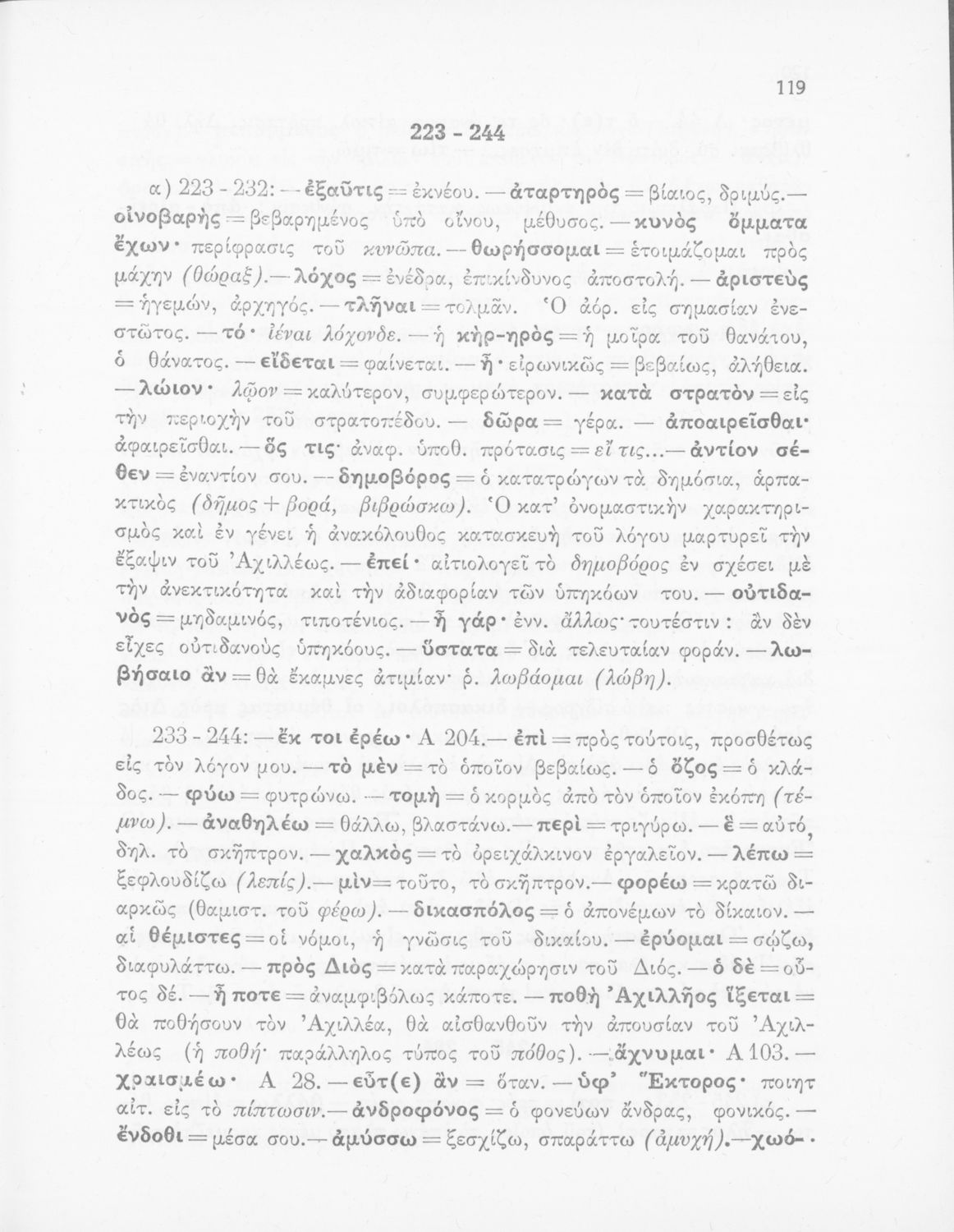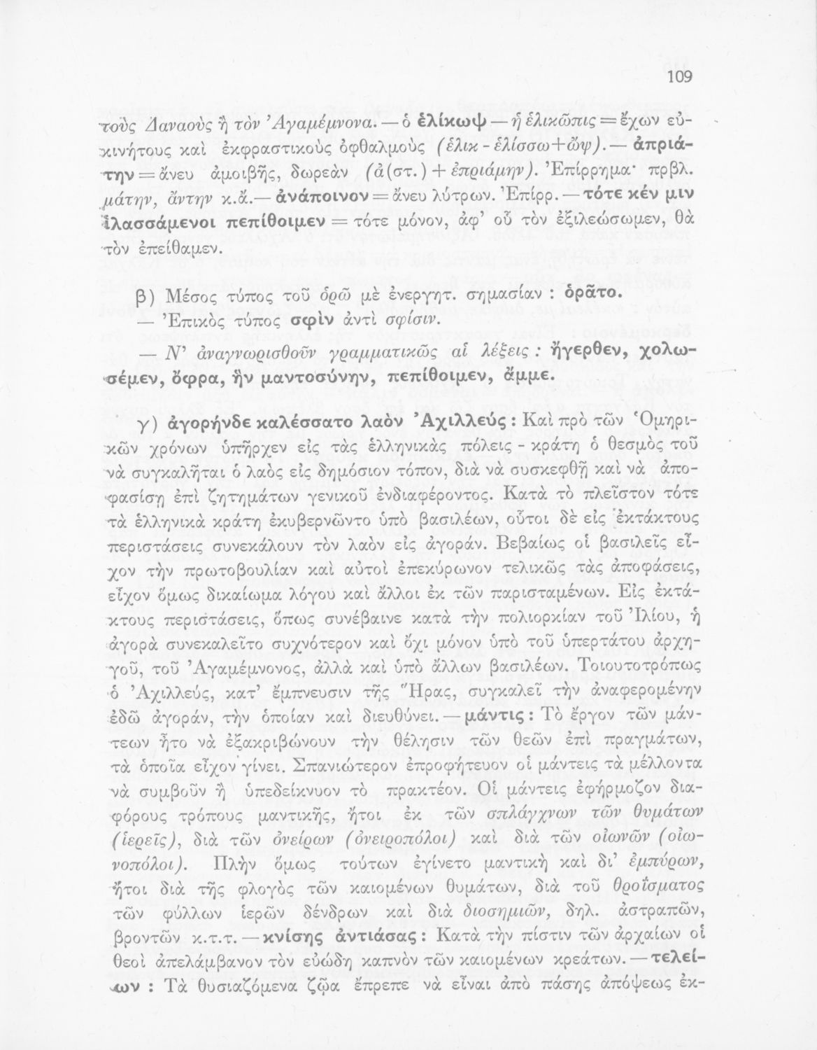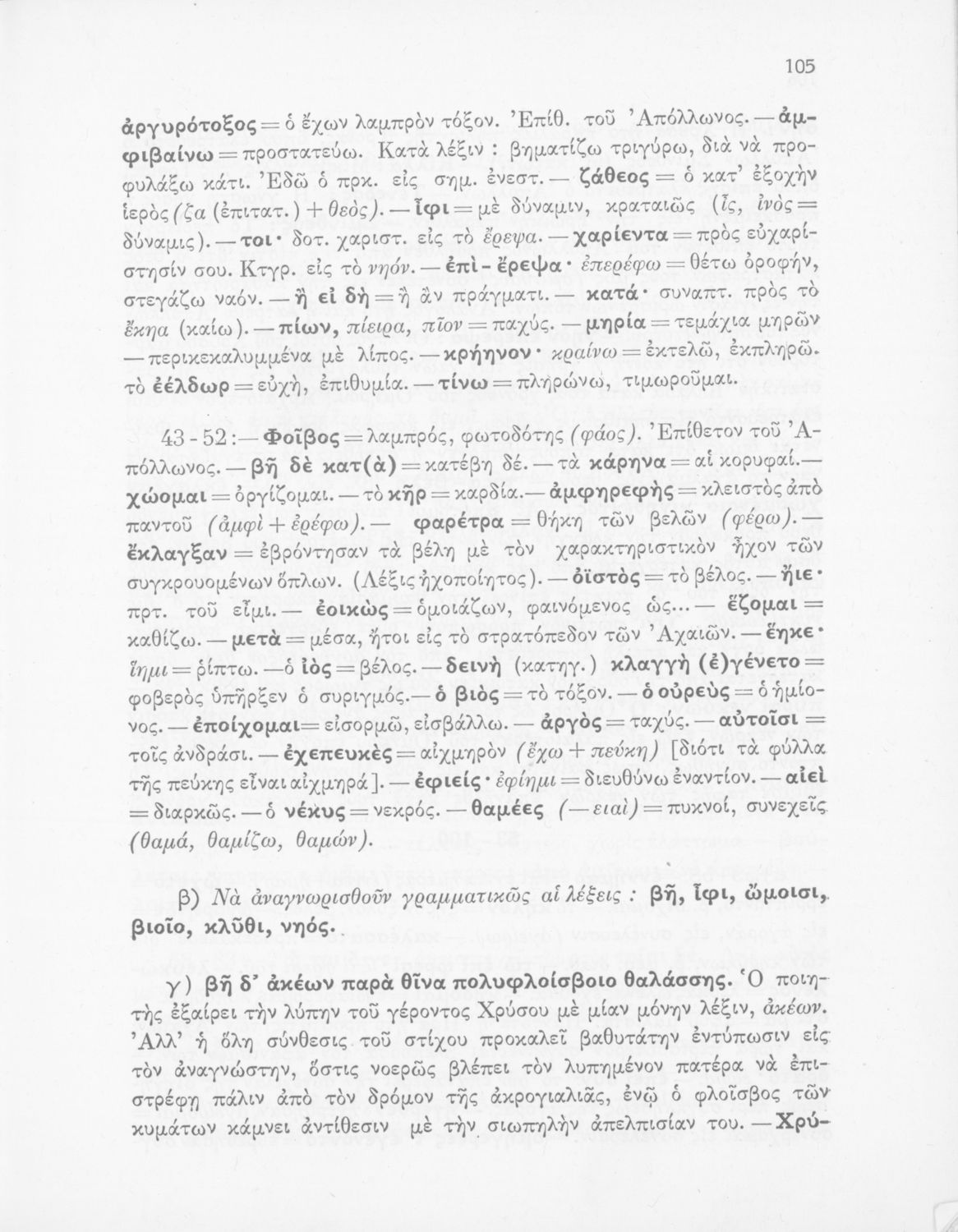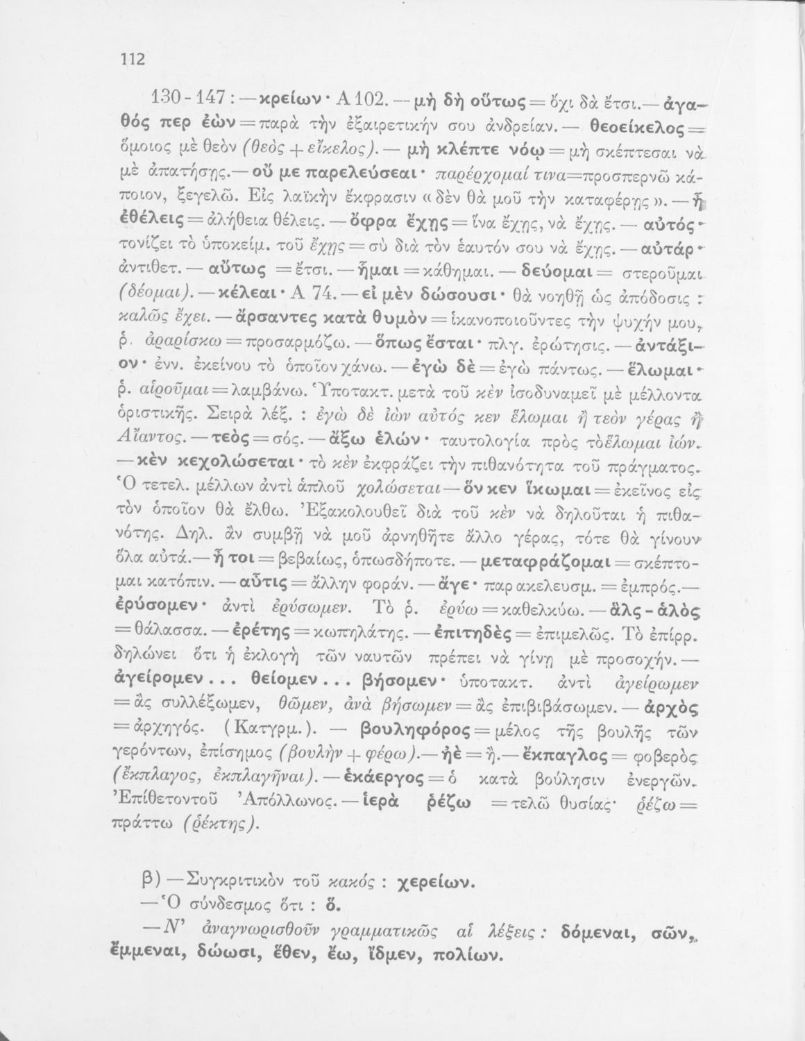Μαθητικό βοήθημα του Ελληνικού Σχολείου, των Παρθεναγωγείων και του Γυμνασίου για το μάθημα των Αρχαίων Ελληνικών. Περιέχει τις ραψωδίες Ο, Π, Ρ, Σ, Τ, Χ, ψ, Ω από το πρωτότυπο με σχόλια και ερμηνευτικές ...