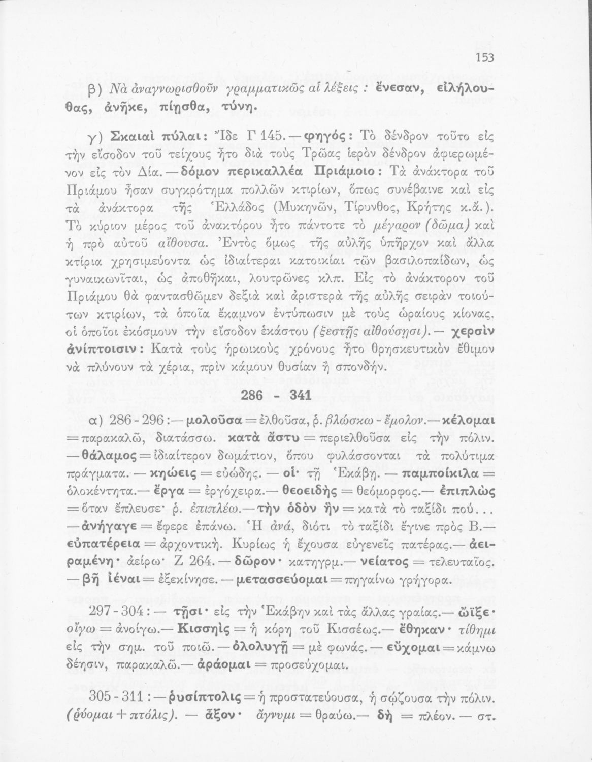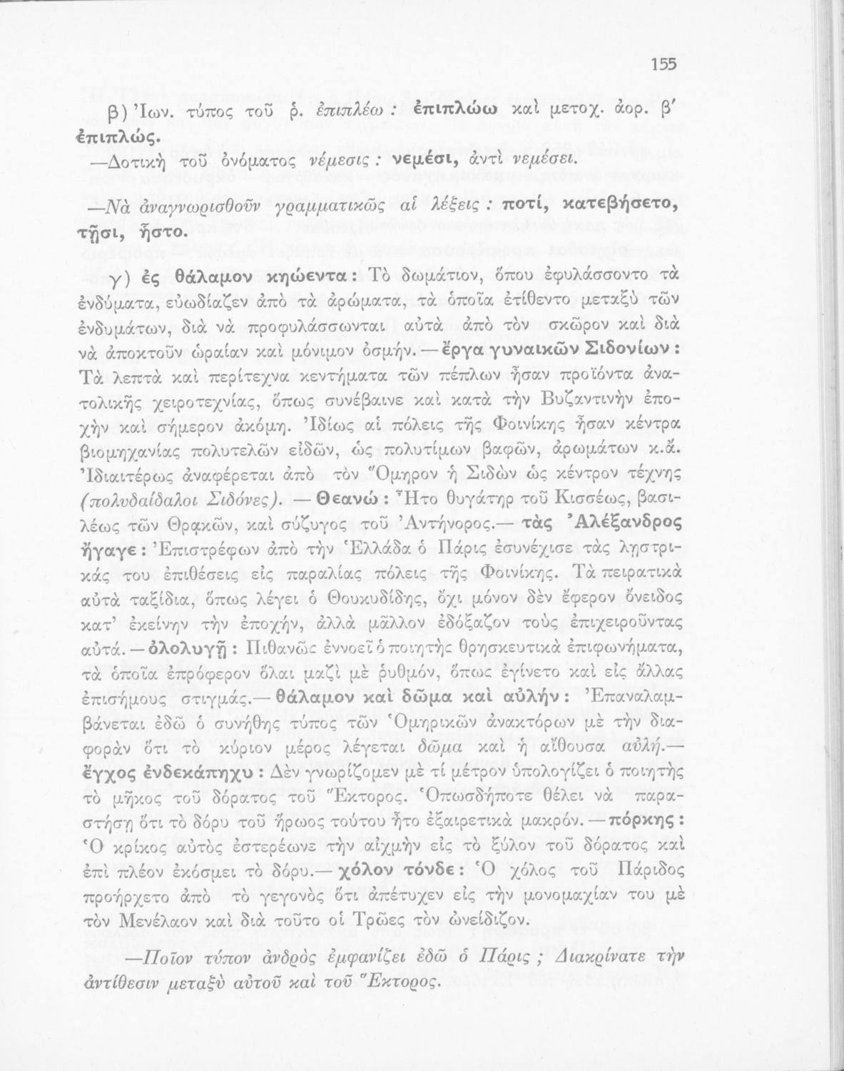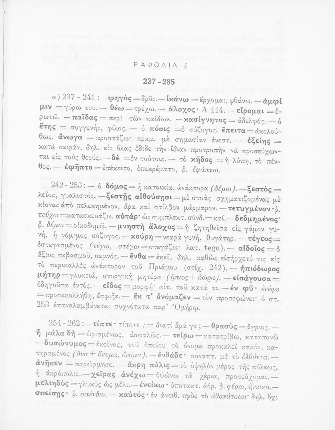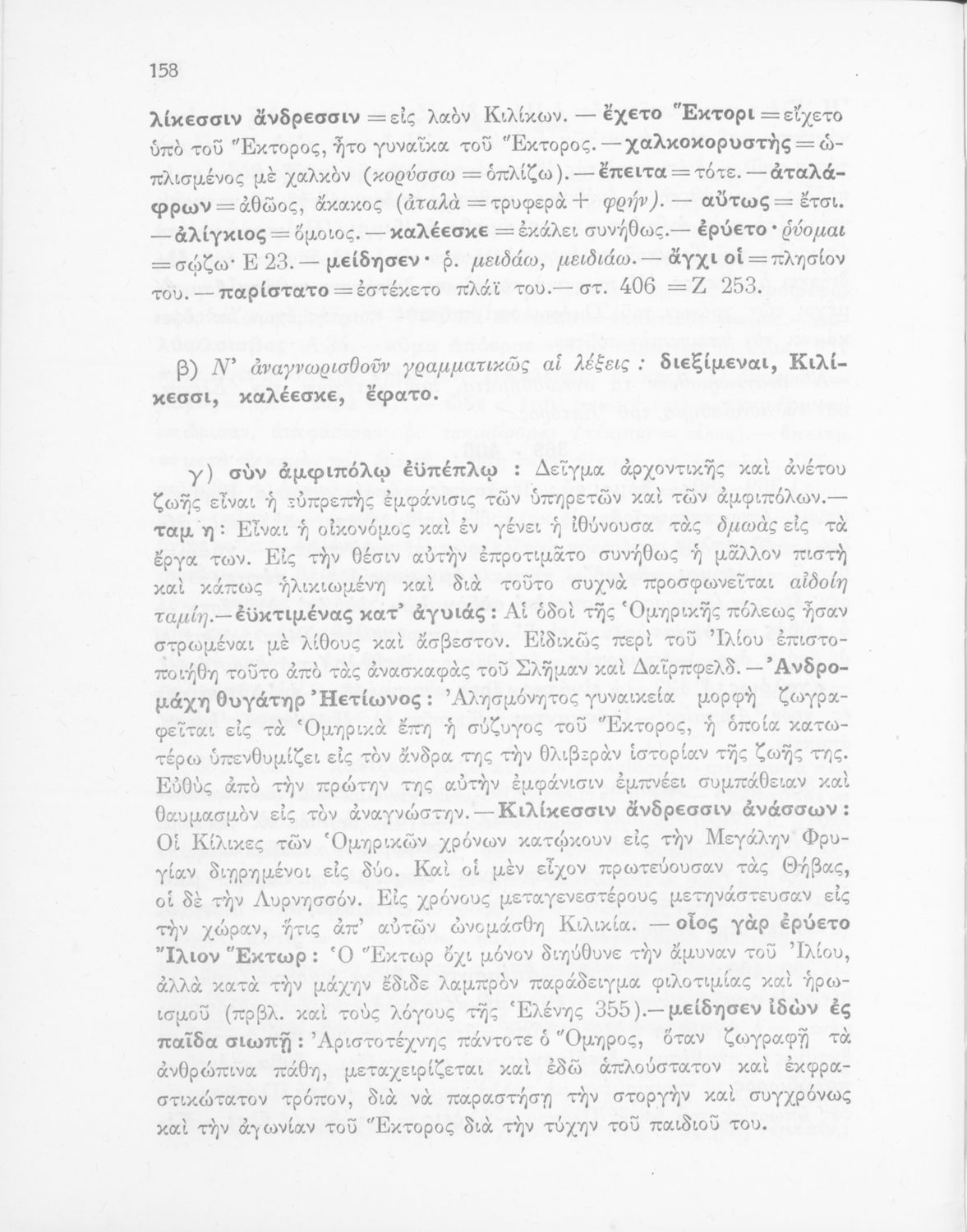 Μαθητικό βοήθημα του Ελληνικού Σχολείου, των Παρθεναγωγείων και του Γυμνασίου για το μάθημα των Αρχαίων Ελληνικών. Περιέχει τις ραψωδίες Ο, Π, Ρ, Σ, Τ, Χ, ψ, Ω από το πρωτότυπο με σχόλια και ερμηνευτικές ...