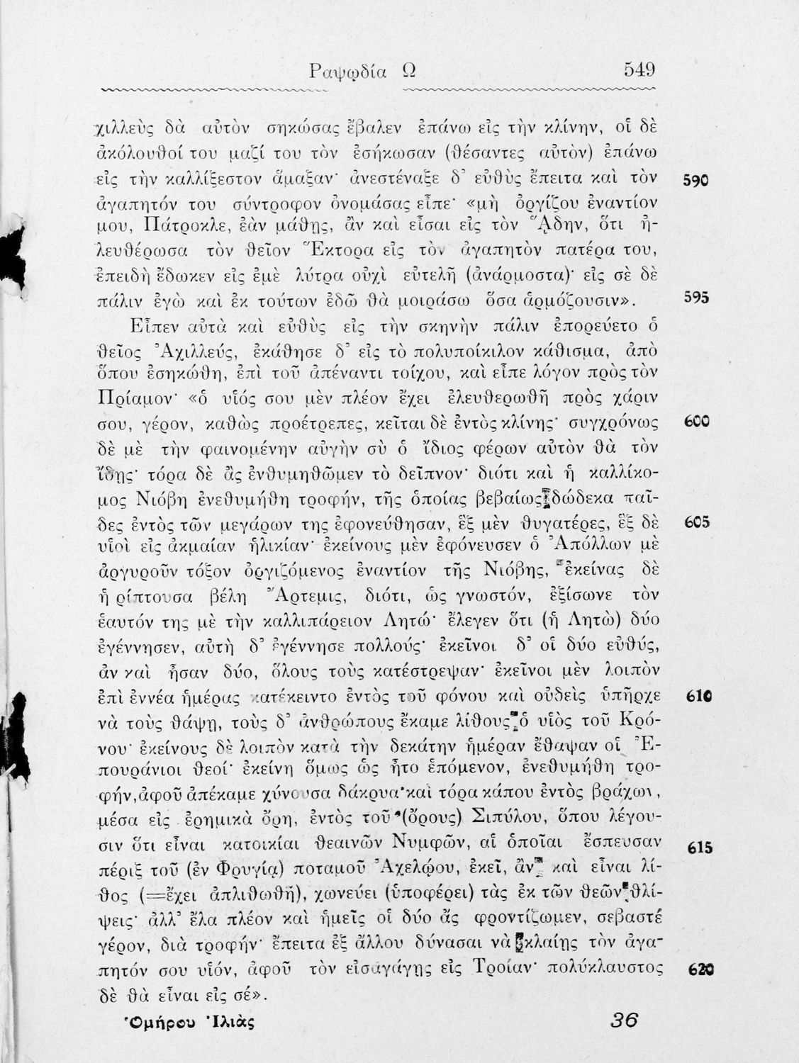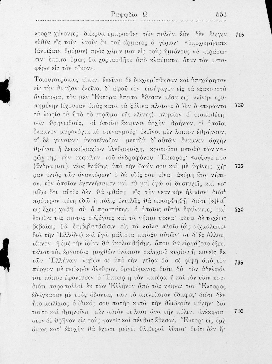 Μαθητικό βοήθημα του Ελληνικού Σχολείου, των Παρθεναγωγείων και του Γυμνασίου για το μάθημα των Αρχαίων Ελληνικών. Περιέχει τις ραψωδίες Ο, Π, Ρ, Σ, Τ, Χ, ψ, Ω από το πρωτότυπο με σχόλια και ερμηνευτικές ...
