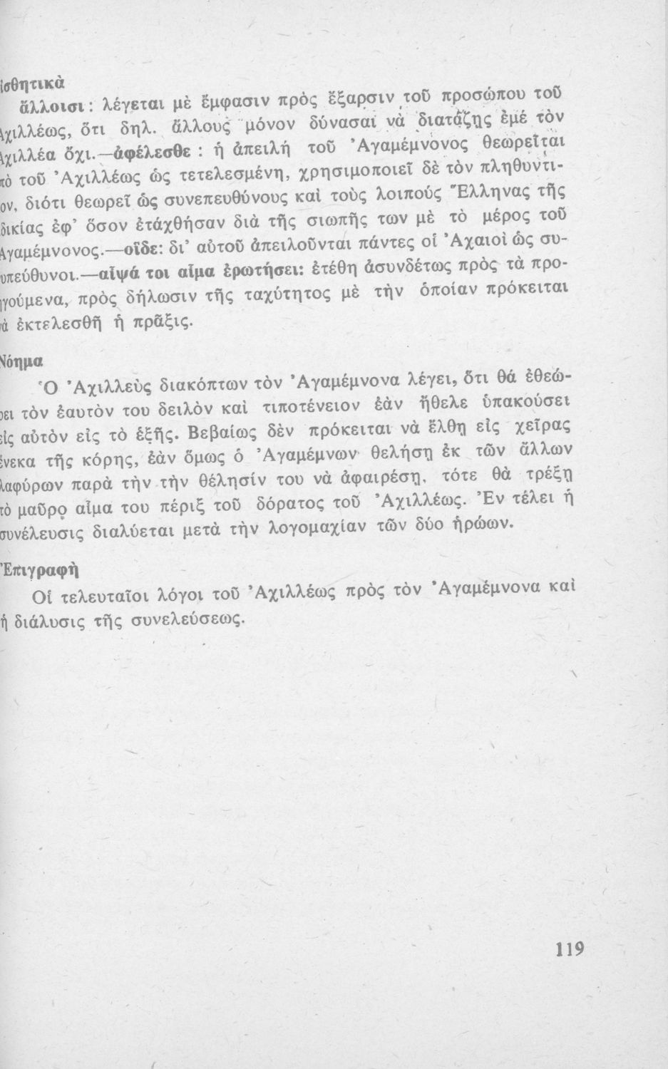 Μαθητικό βοήθημα Αρχαίων Ελληνικών της Γ΄ τάξης των τετρατάξιων Γυμνασίων το οποίο περιέχει σε μετάφραση τη ραψωδία Α΄ από την 'Ιλιάδα' του Ομήρου.