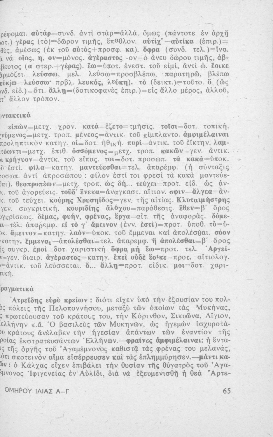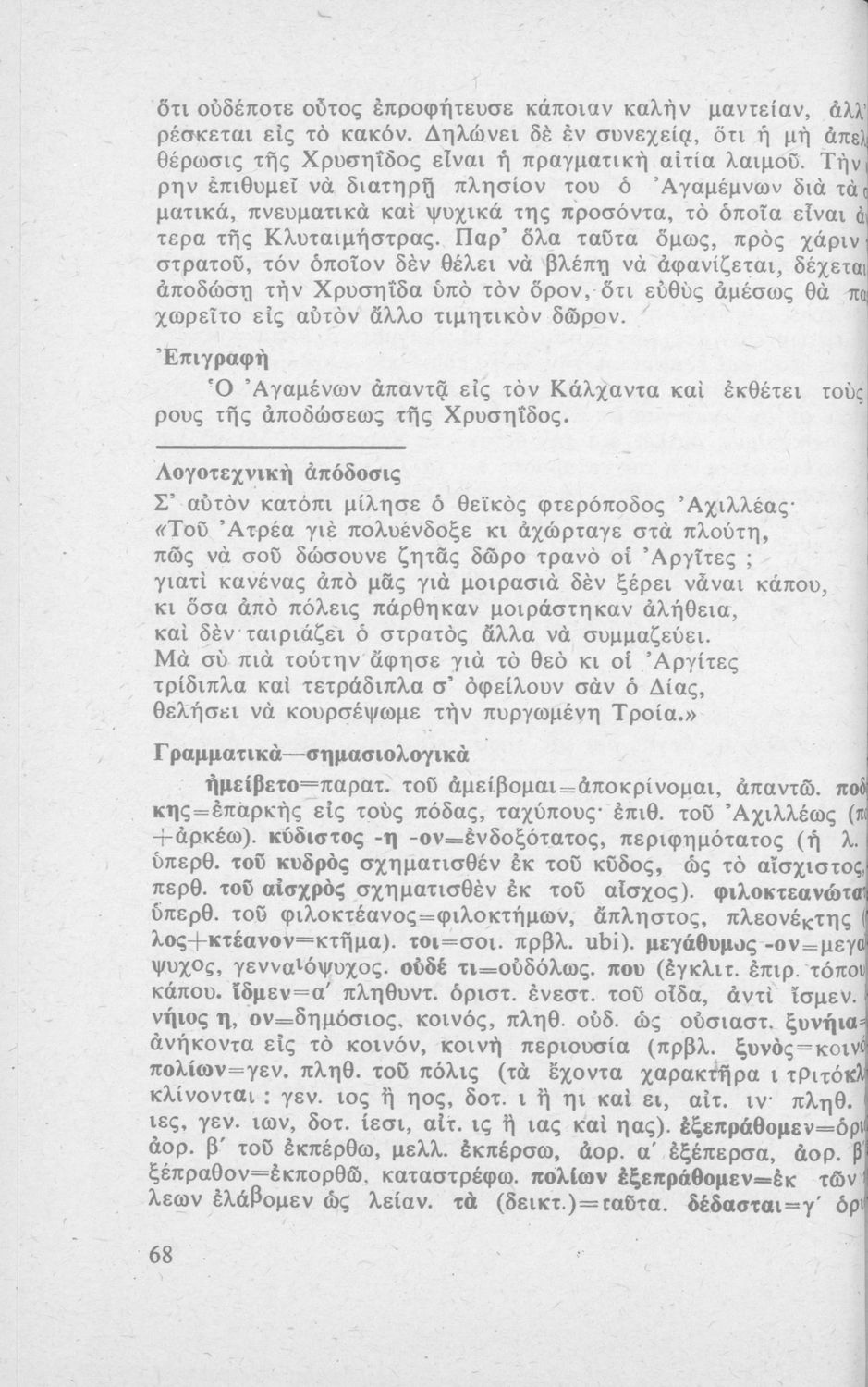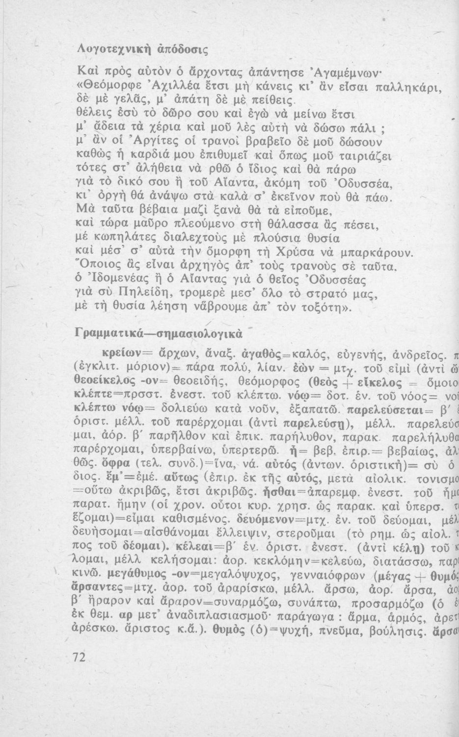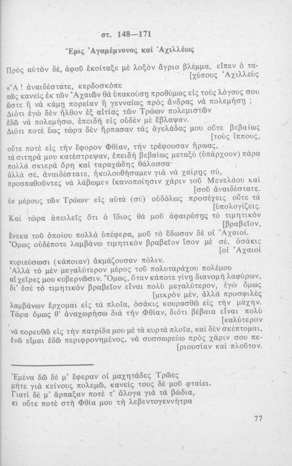 Μαθητικό βοήθημα Αρχαίων Ελληνικών της Γ΄ τάξης των τετρατάξιων Γυμνασίων το οποίο περιέχει σε μετάφραση τη ραψωδία Α΄ από την 'Ιλιάδα' του Ομήρου.