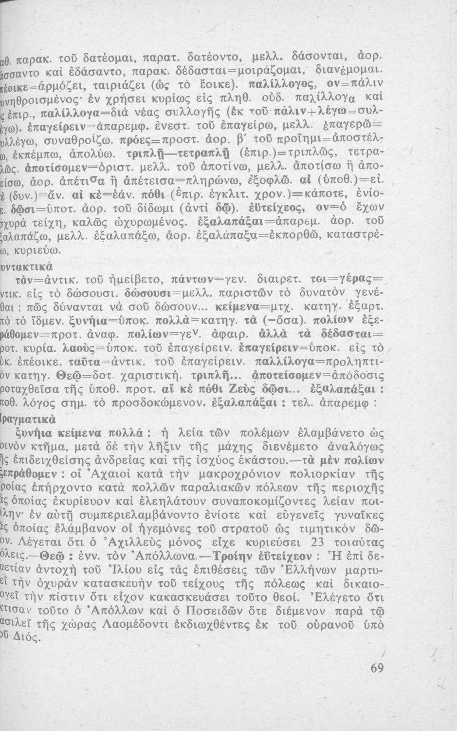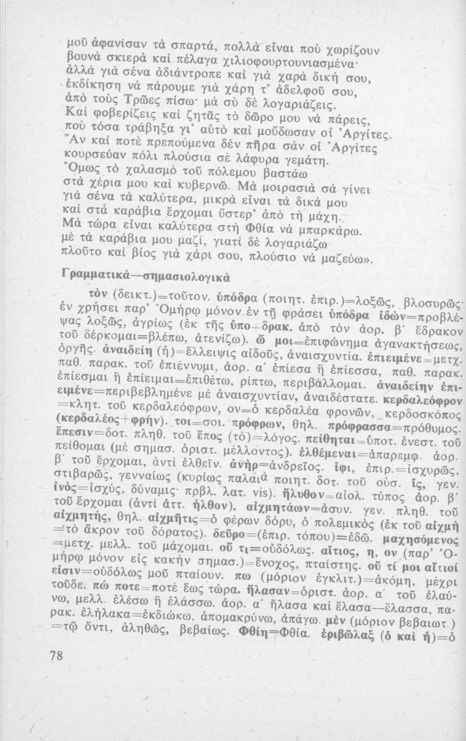 Μαθητικό βοήθημα Αρχαίων Ελληνικών για τη Δευτεροβάθμια Εκπαίδευση. Περιλαμβάνει λογοτεχνική απόδοση, σημασιολογικά και γραμματικά σχόλια καθώς και εισαγωγή στην επική ποίηση.