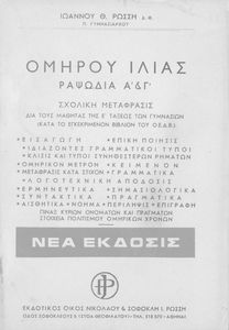 Κωδικός αναγνώρισης: 01-45054 Τίτλος: Ομήρου Ιλιάς, Ραψωδία Α' και Γ' δια τους μαθητάς της Ε΄ τάξεως των Γυμνασίων Συγγραφέας: Ιωάννης Θ. Ρώσσης Μέγεθος και υπόστρωμα: Μαθητικό βοήθημα, 20εκ., μαλακό εξώφυλλο, 178 σελίδες. |