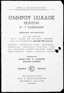 Κωδικός αναγνώρισης: 01-45055 Τίτλος: Ομήρου Ιλιάδα, Εκλογαί Α-Γ ραψωδιών δια τους μαθητάς της Ε΄ τάξεως των εξατάξιων Γυμνασίων Συγγραφέας: Ευθ. Δ. Χριστόπουλος (μετάφραση, σχόλια) Μέγεθος και υπόστρωμα: Μαθητικό βοήθημα, μαλακό εξώφυλλο, 142 σελίδες. |