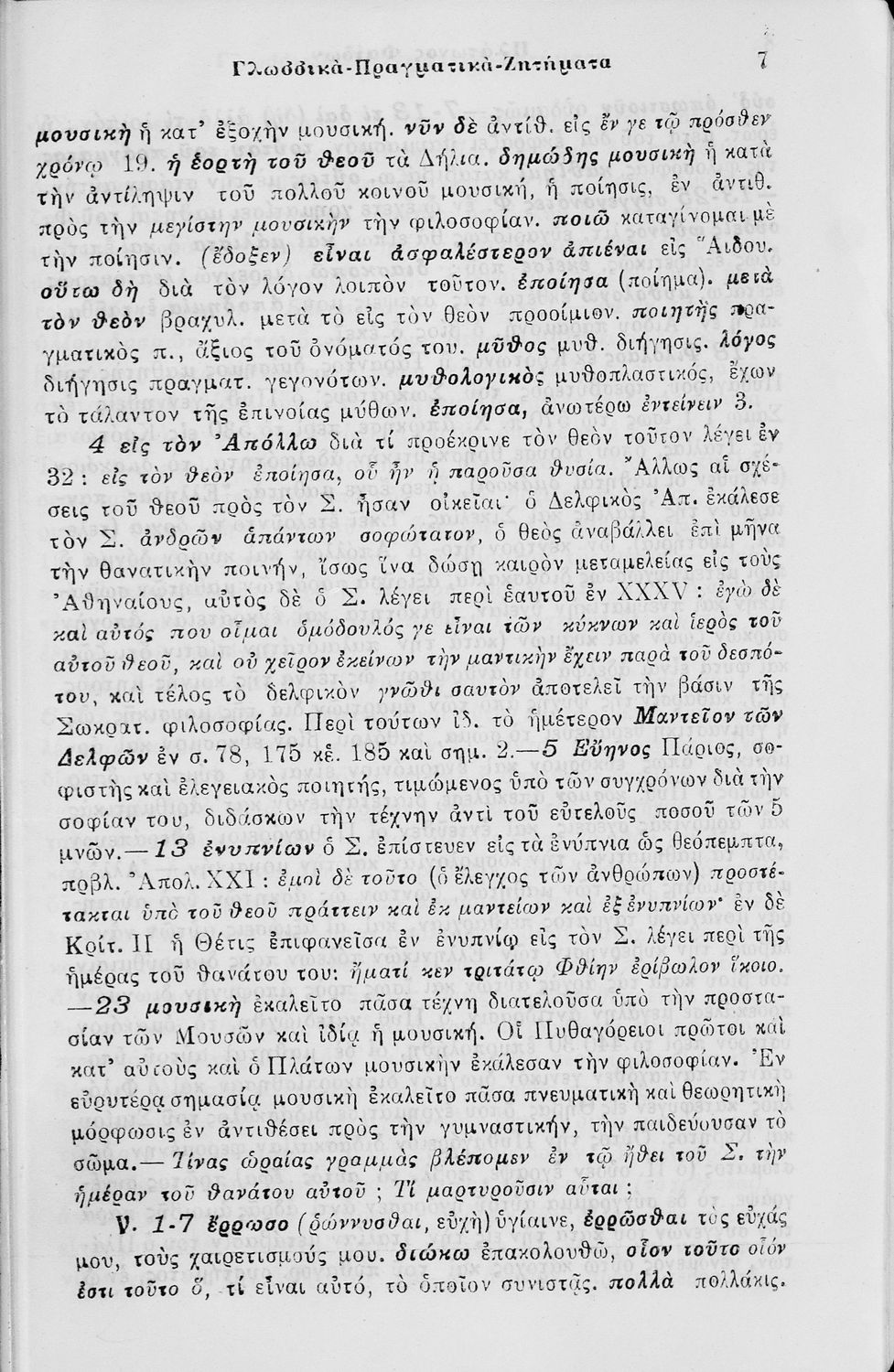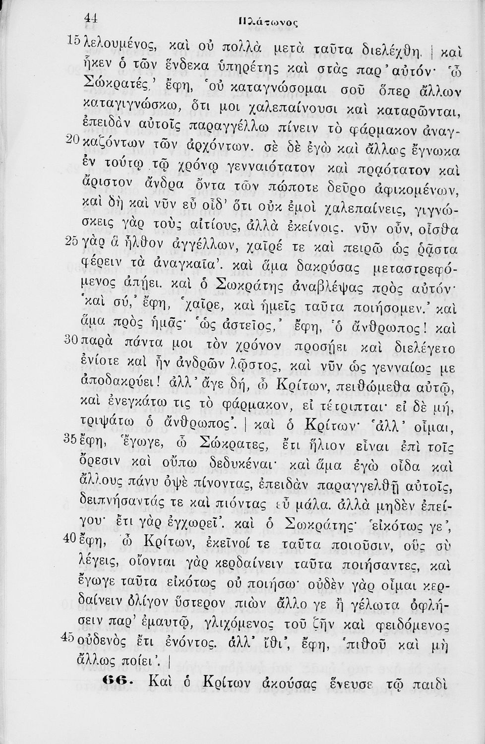 Σχολικό εγχειρίδιο Αρχαίων Ελληνικών Γυμνασίου που περιλαμβάνει αποσπάσματα από τους διαλόγους του Πλάτωνα, ερμηνευτικά και πραγματολογικά σχόλια και λεξιλογικές παρατηρήσεις.