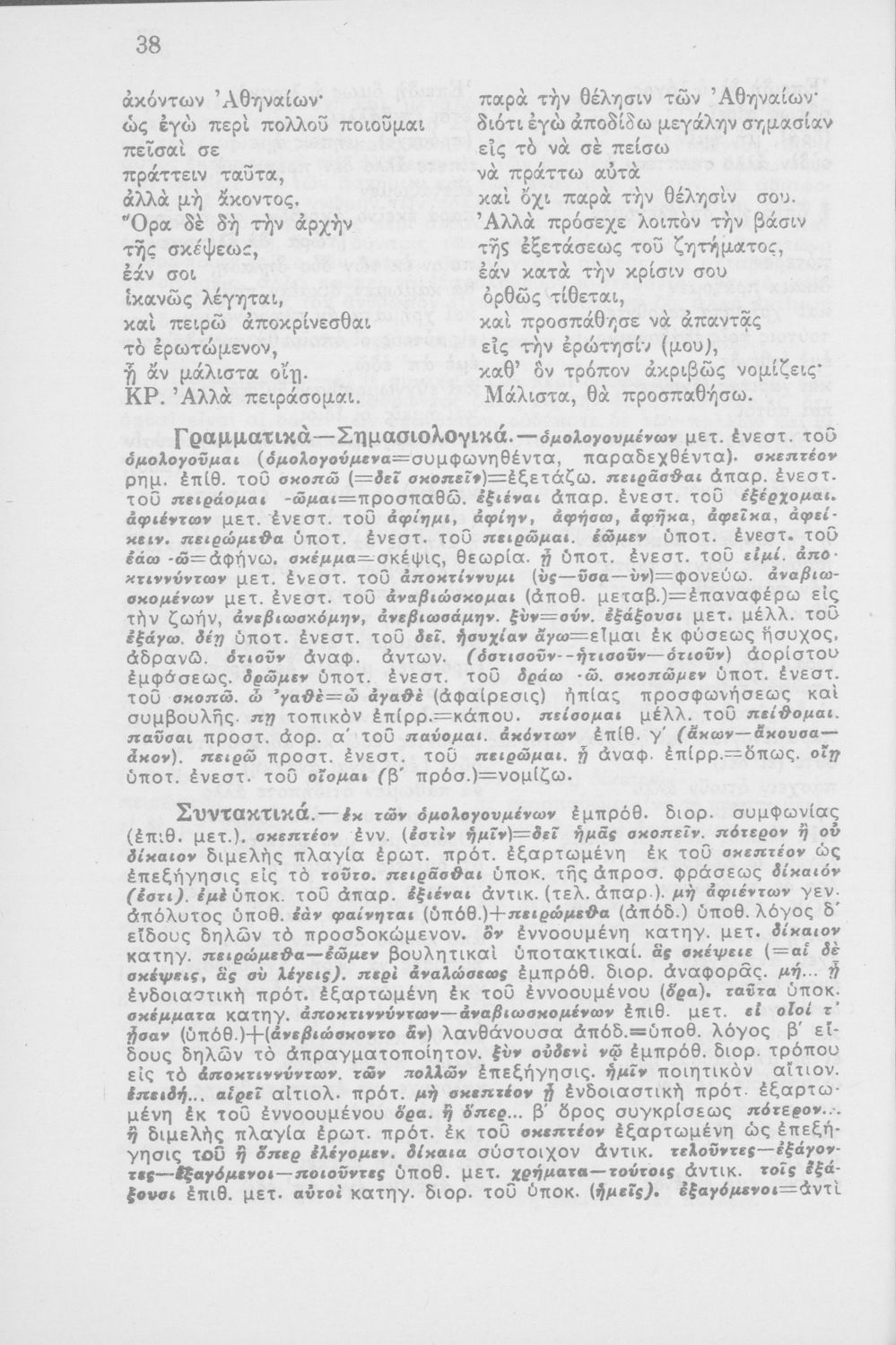 Μαθητικό βοήθημα Αρχαίων Ελληνικών για τους μαθητές της Ε' τάξης των οκταταξίων Γυμνασίων. Περιέχει το κείμενο, την μετάφραση, γραμματικά και συντακτικά σχόλια.