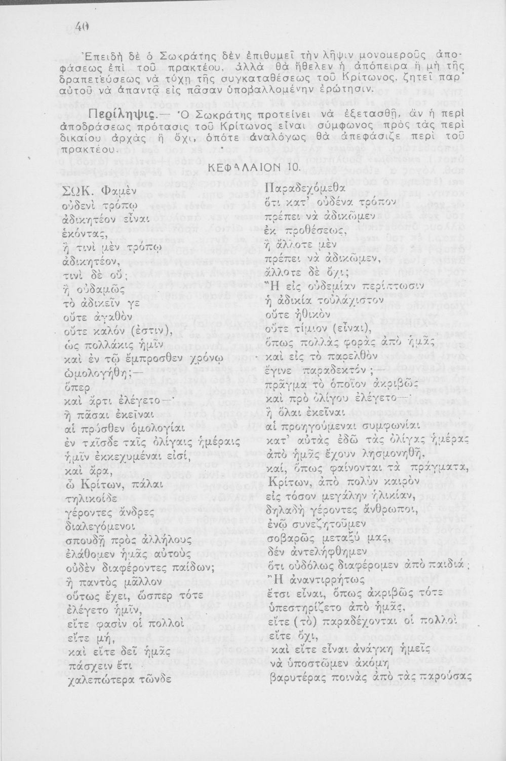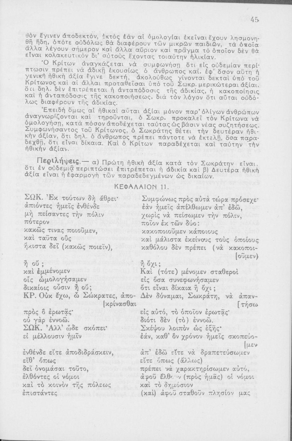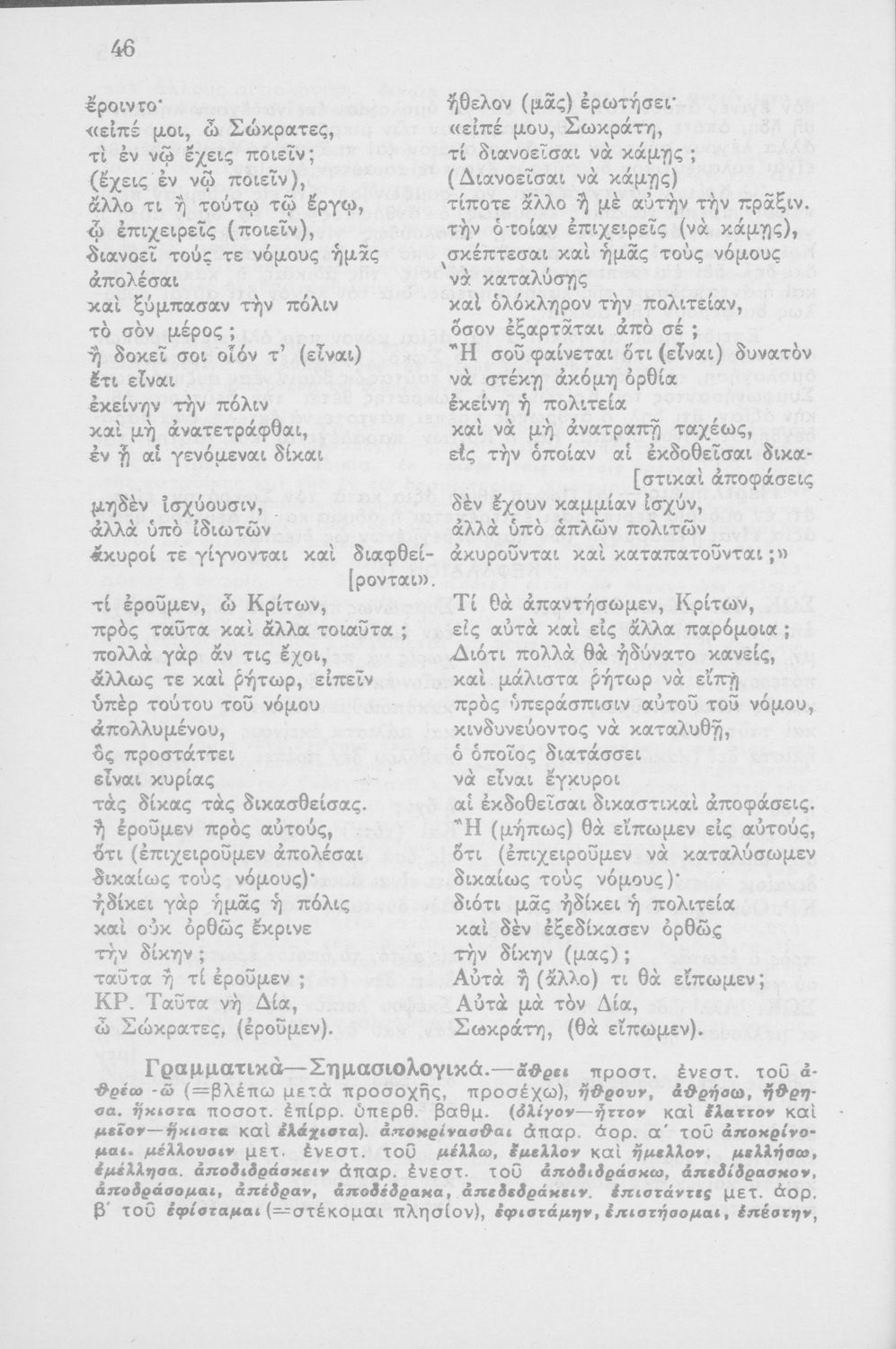 Σχολικό εγχειρίδιο Αρχαίων Ελληνικών Γ΄ Γυμνασίου που περιλαμβάνει το έργο του Πλάτωνα Κρίτων, εισαγωγή, μετάφραση και ερμηνευτικές παρατηρήσεις.