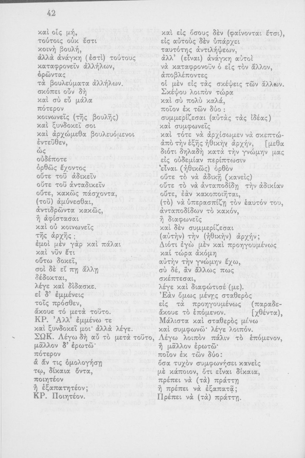 Σχολικό εγχειρίδιο Αρχαίων Ελληνικών για τη Β΄ Λυκείου που περιλαμβάνει έργα του Πλάτωνα με ερμηνευτικά σχόλια του συγγραφέα στη καθαρεύουσα. Το κείμενο είναι πρωτότυπο.