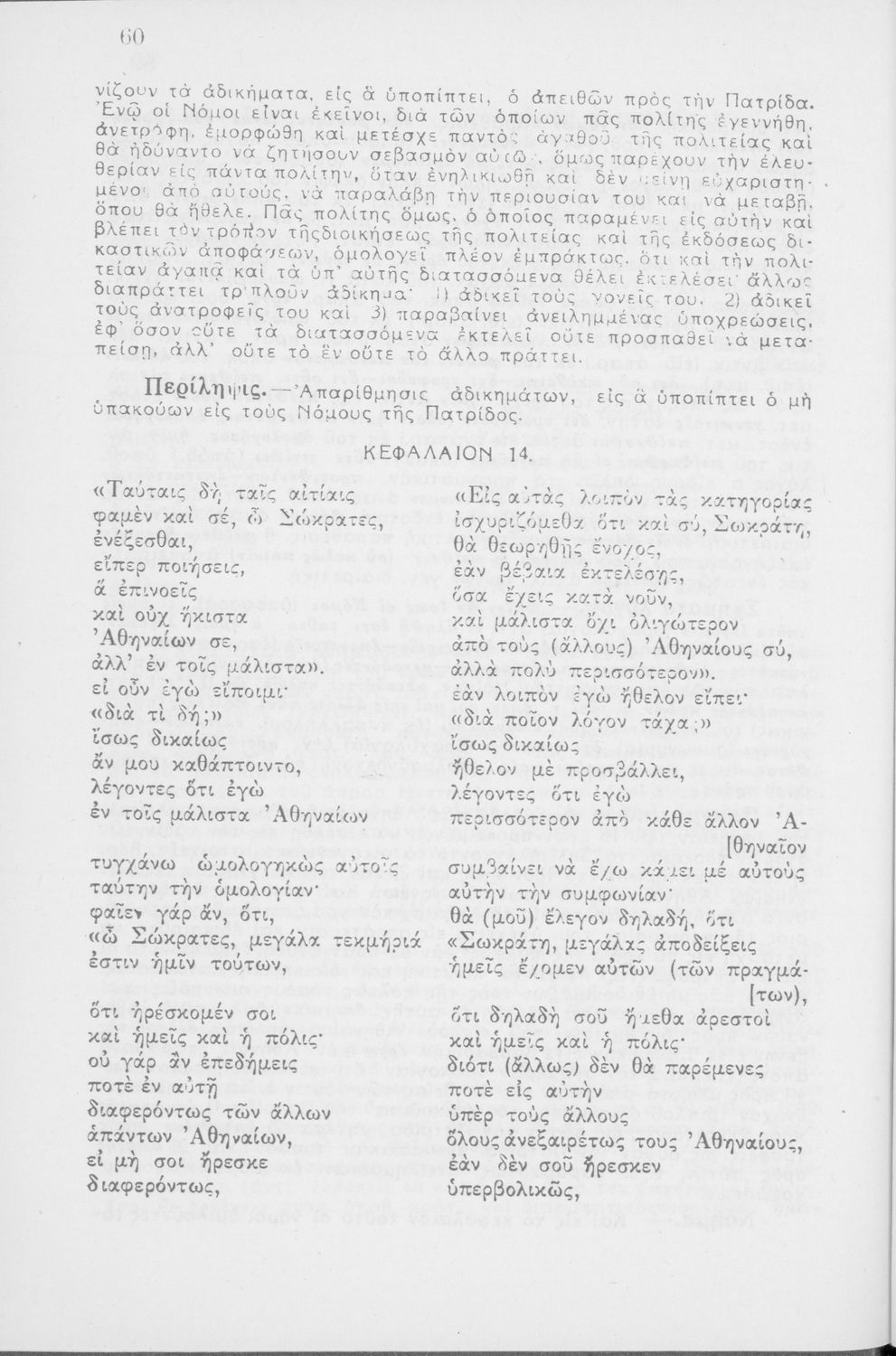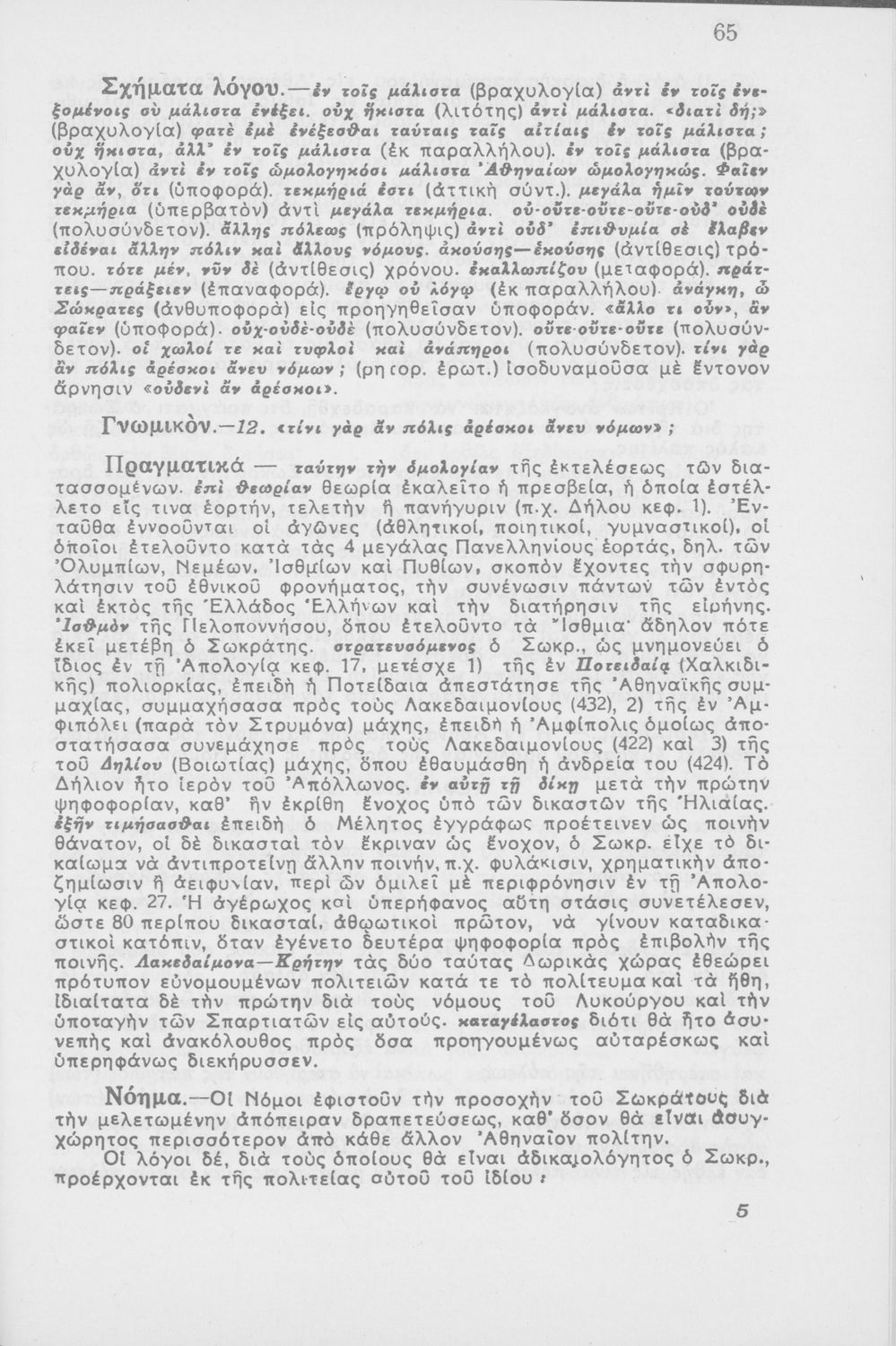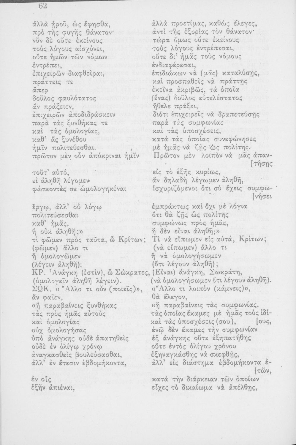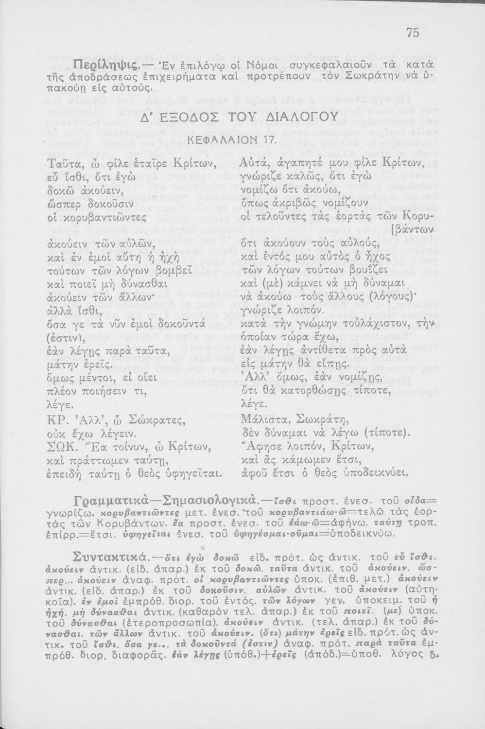 Σχολικό εγχειρίδιο Αρχαίων Ελληνικών για την Ε΄ Γυμνασίου. Περιέχει το πρωτότυπο κείμενο και περιλαμβάνει το διάλογο του Σωκράτη και του Κρίτωνα. Έχει εισαγωγές και ερμηνευτικά σχόλια. Φέρει το σύμβολο της ...