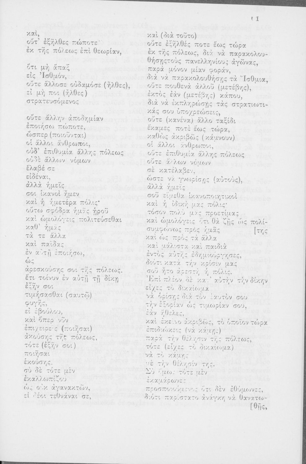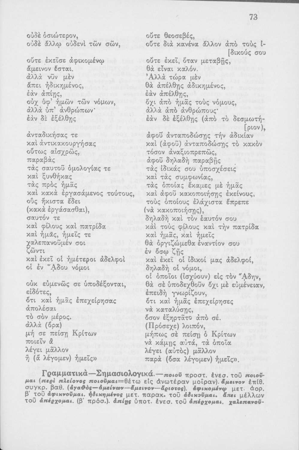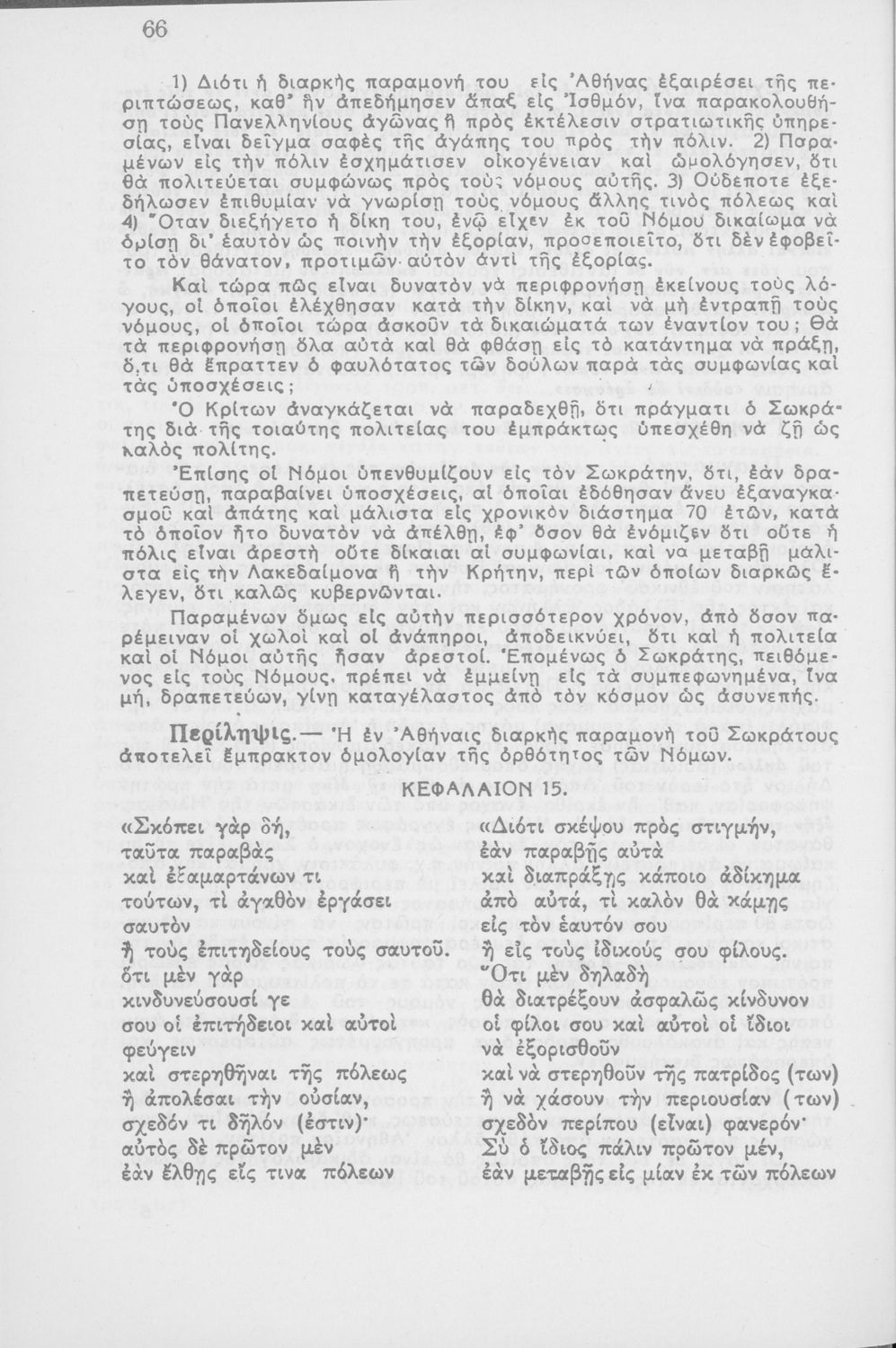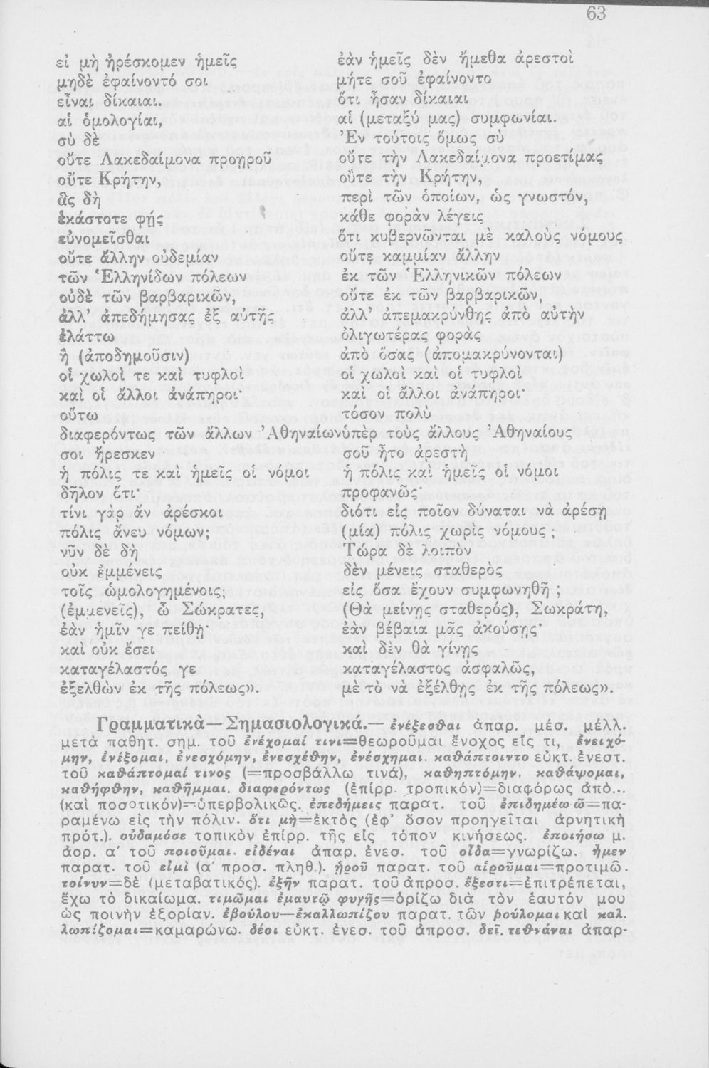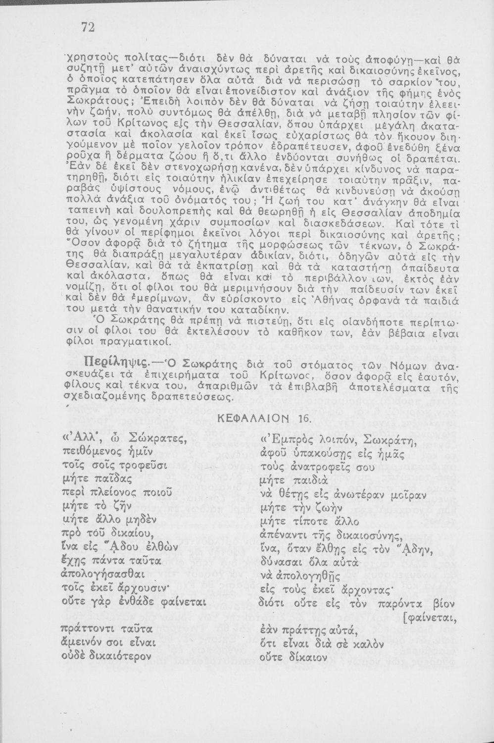 Σχολικό εγχειρίδιο Αρχαίων Ελληνικών για την Ε΄ Γυμνασίου. Περιέχει το πρωτότυπο κείμενο και περιλαμβάνει το διάλογο του Σωκράτη και του Κρίτωνα. Έχει εισαγωγές και ερμηνευτικά σχόλια. Φέρει το σύμβολο της ...