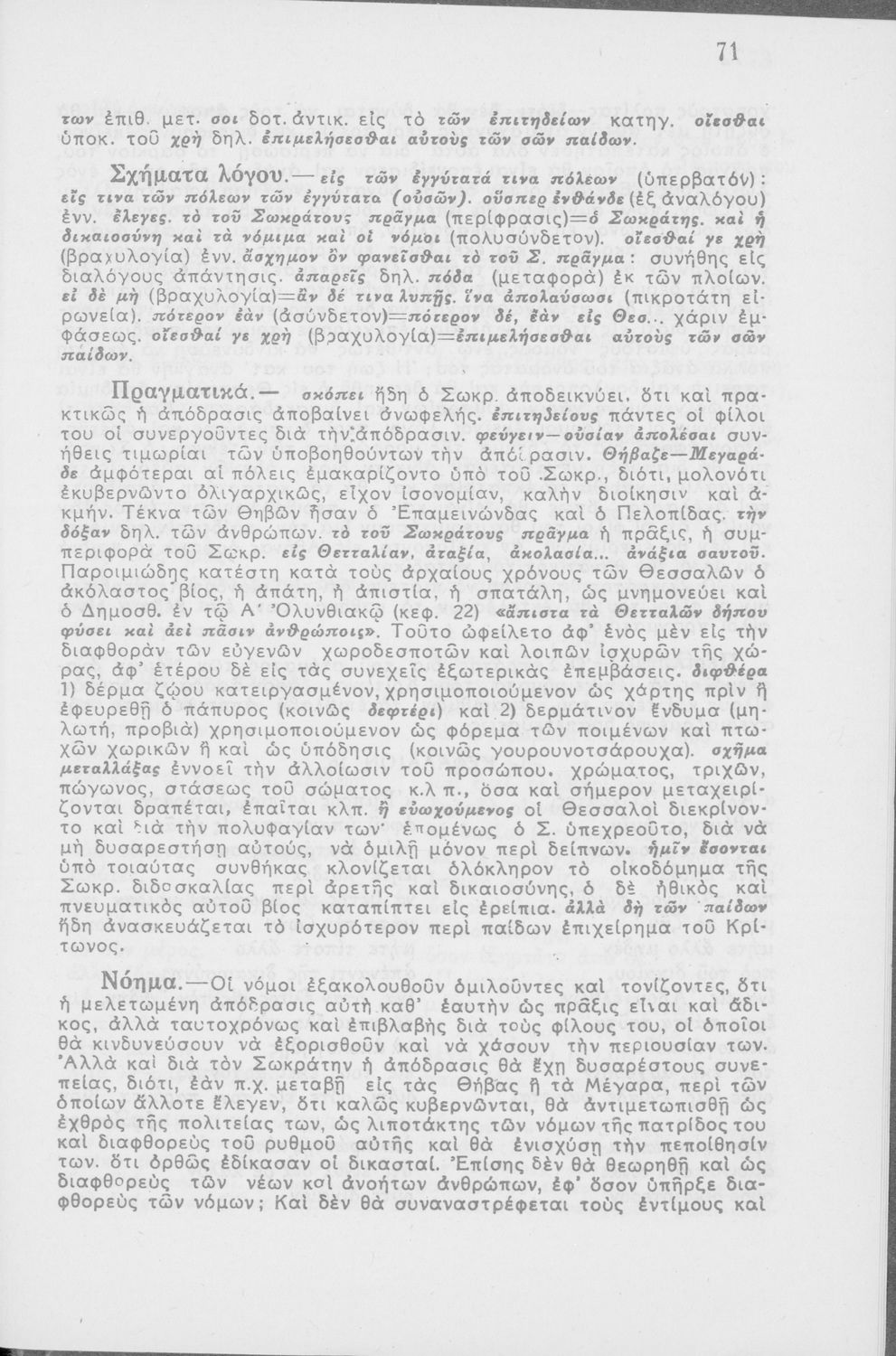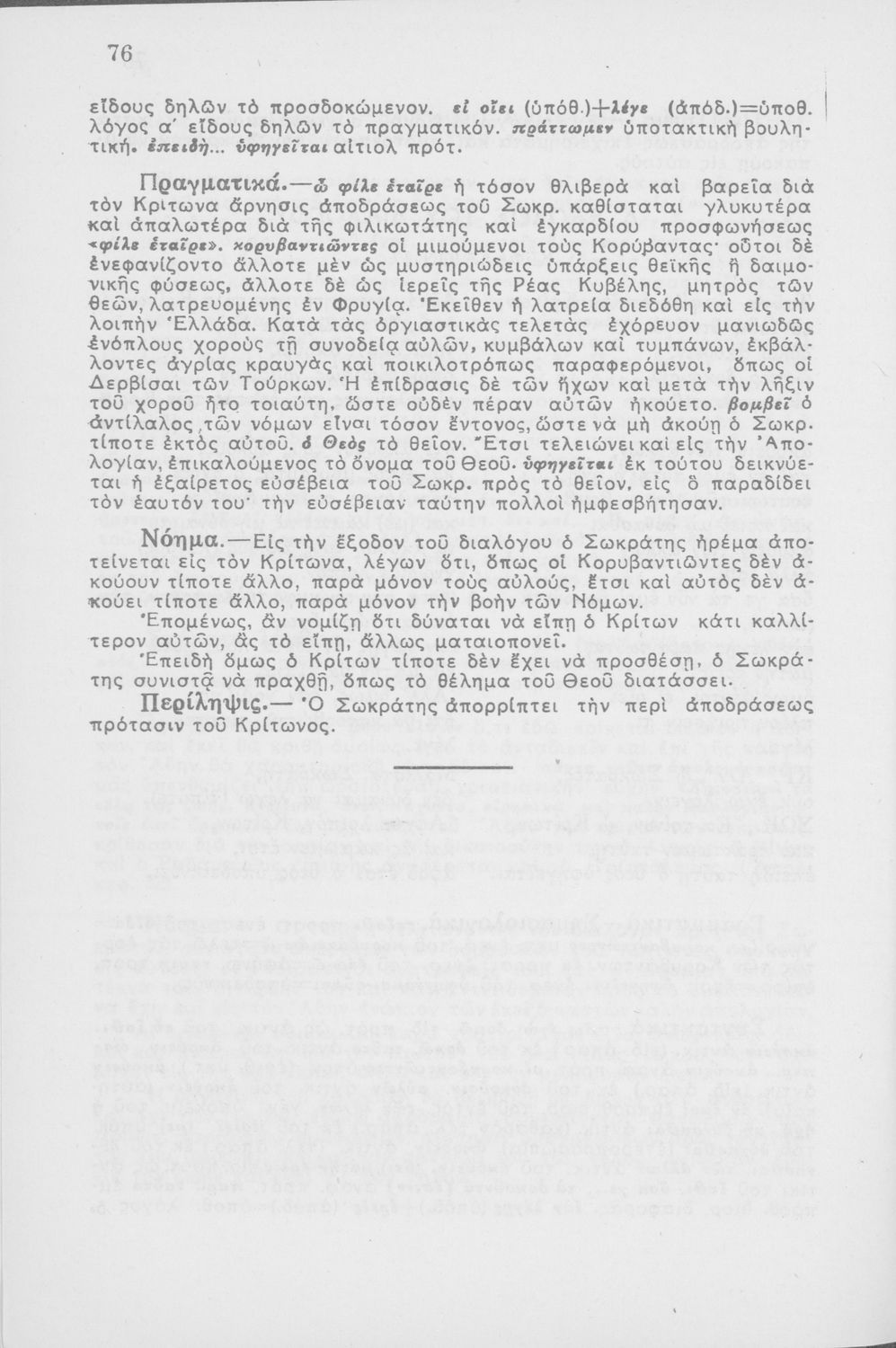 Σχολικό εγχειρίδιο Αρχαίων Ελληνικών από το κείμενο του Πλάτωνα. Περιέχονται ερμηνευτικά σχόλια του συγγραφέα στη καθαρεύουσα. Απεικονίζεται το σύμβολο της Επταετίας.