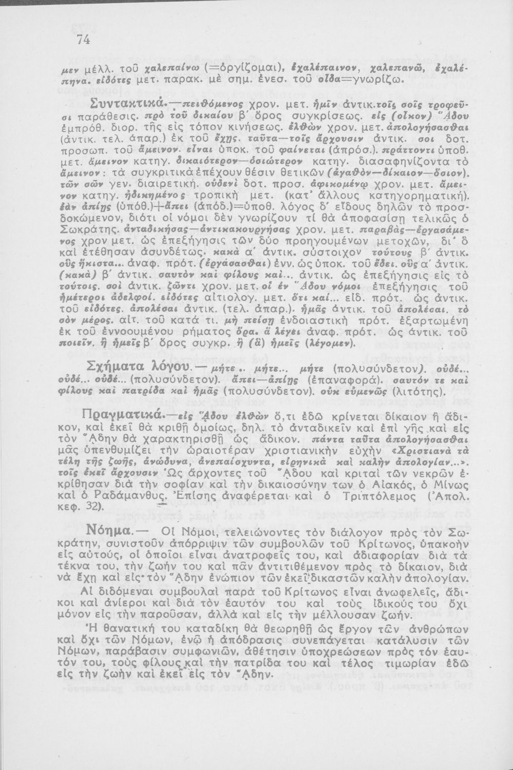 Σχολικό εγχειρίδιο της Ε΄ Γυμνασίου για το μάθημα των Αρχαίων Ελληνικών. Περιέχει το πρωτότυπο κείμενο του Πλάτωνα από την απολογία του Κρίτωνα με ερμηνευτικά, πραγματολογικά σχόλια και λεξιλογικές ...