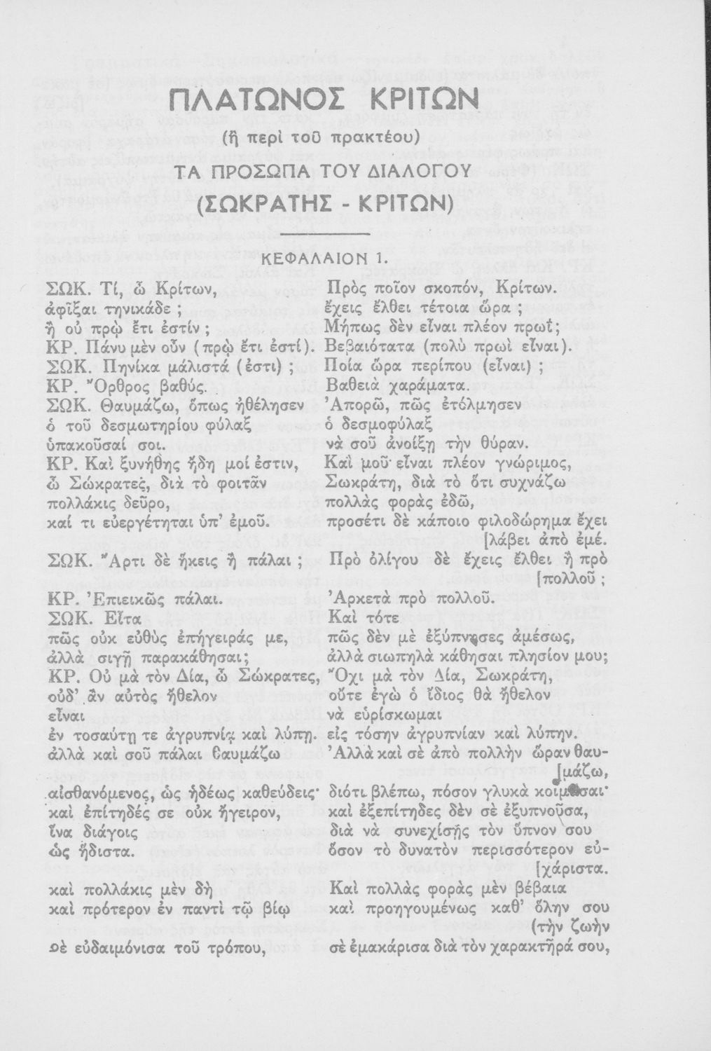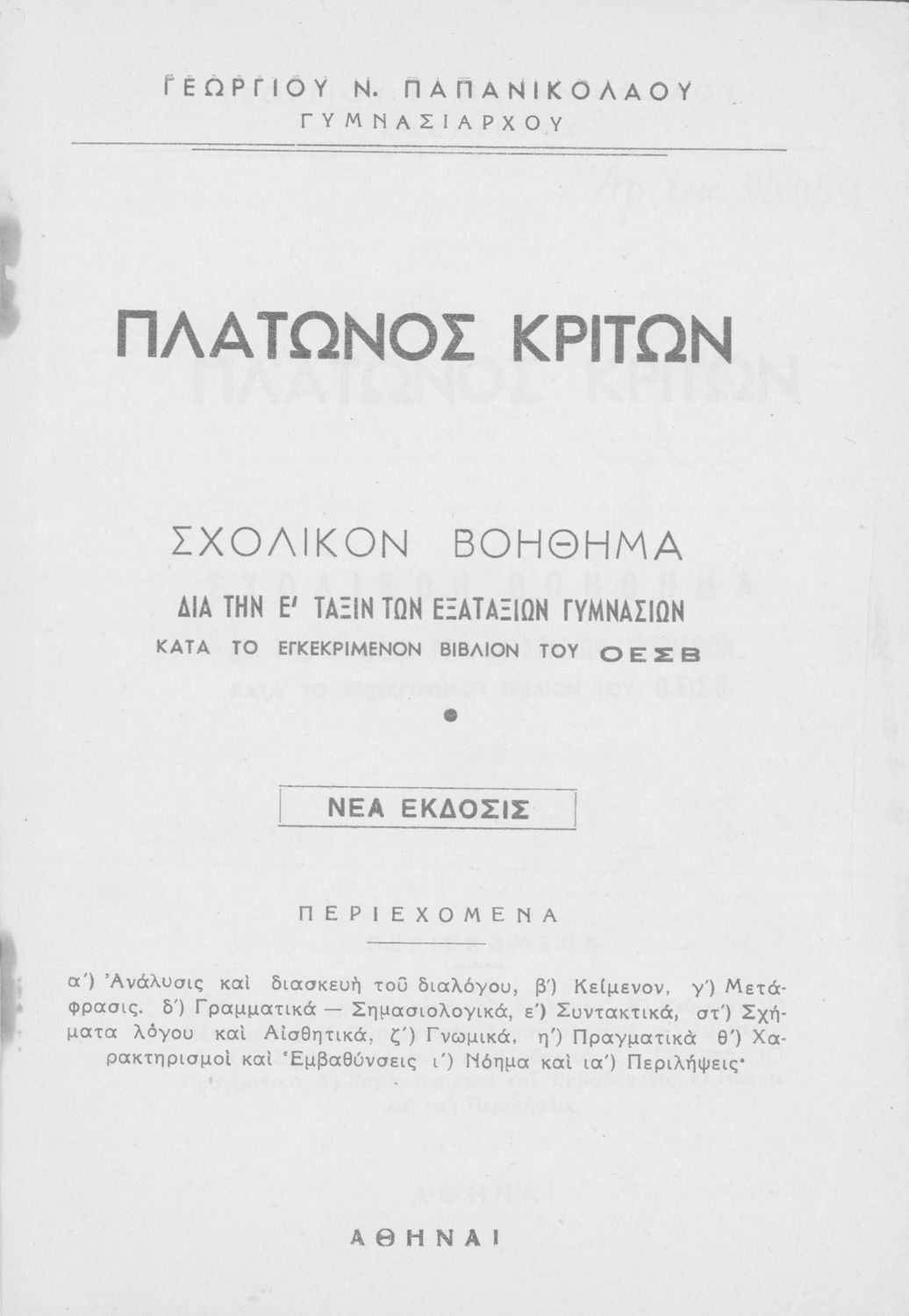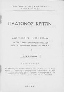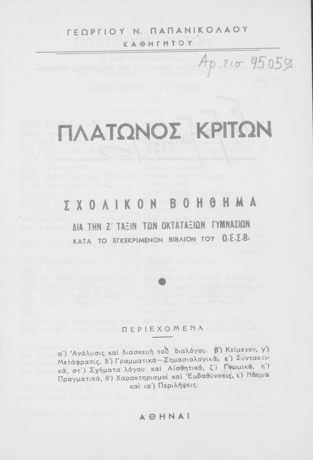 Κωδικός αναγνώρισης: 01-45059 Τίτλος: Πλάτωνος Κρίτων Συγγραφέας: Γεώργιος Ν. Παπανικολάου (σχόλια) Μέγεθος και υπόστρωμα: Μαθητικό βοήθημα, 21εκ., μαλακό εξώφυλλο, 76 σελίδες. |