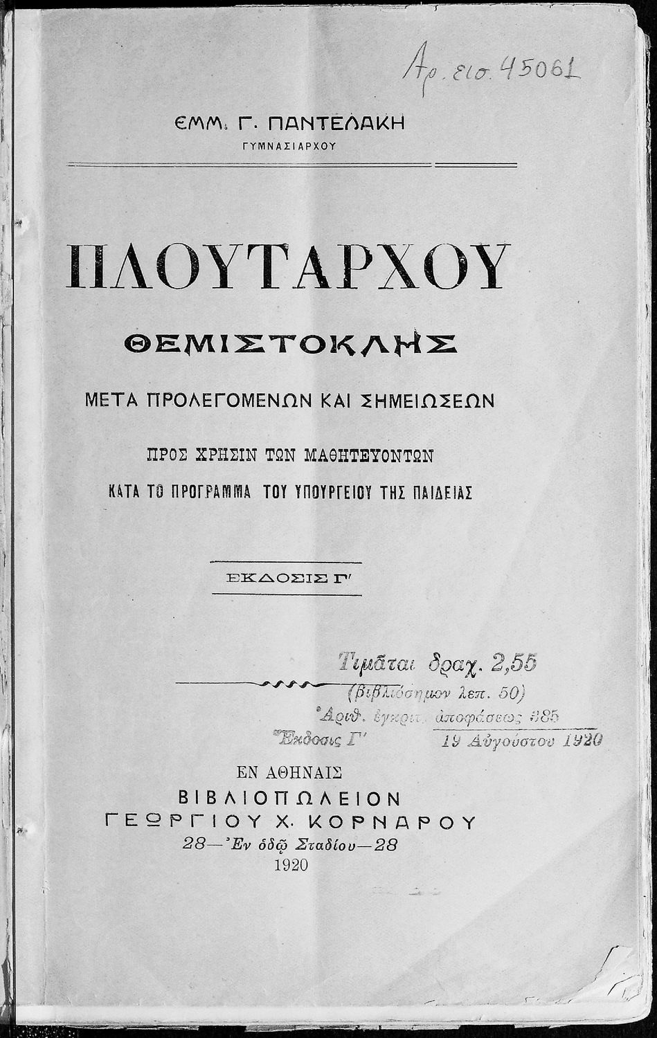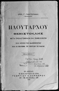Κωδικός αναγνώρισης: 01-45061 Τίτλος: Πλουτάρχου Θεμιστοκλής μετά προλεγομένων και σημειώσεων. Προς χρήσιν των μαθητευόντων κατά το πρόγραμμα του Υπουργείου της Παιδείας Συγγραφέας: Εμμ. Γ. Παντελάκης Μέγεθος και υπόστρωμα: Μαθητικό βοήθημα, μαλακό εξώφυλλο, 86 σελίδες. |