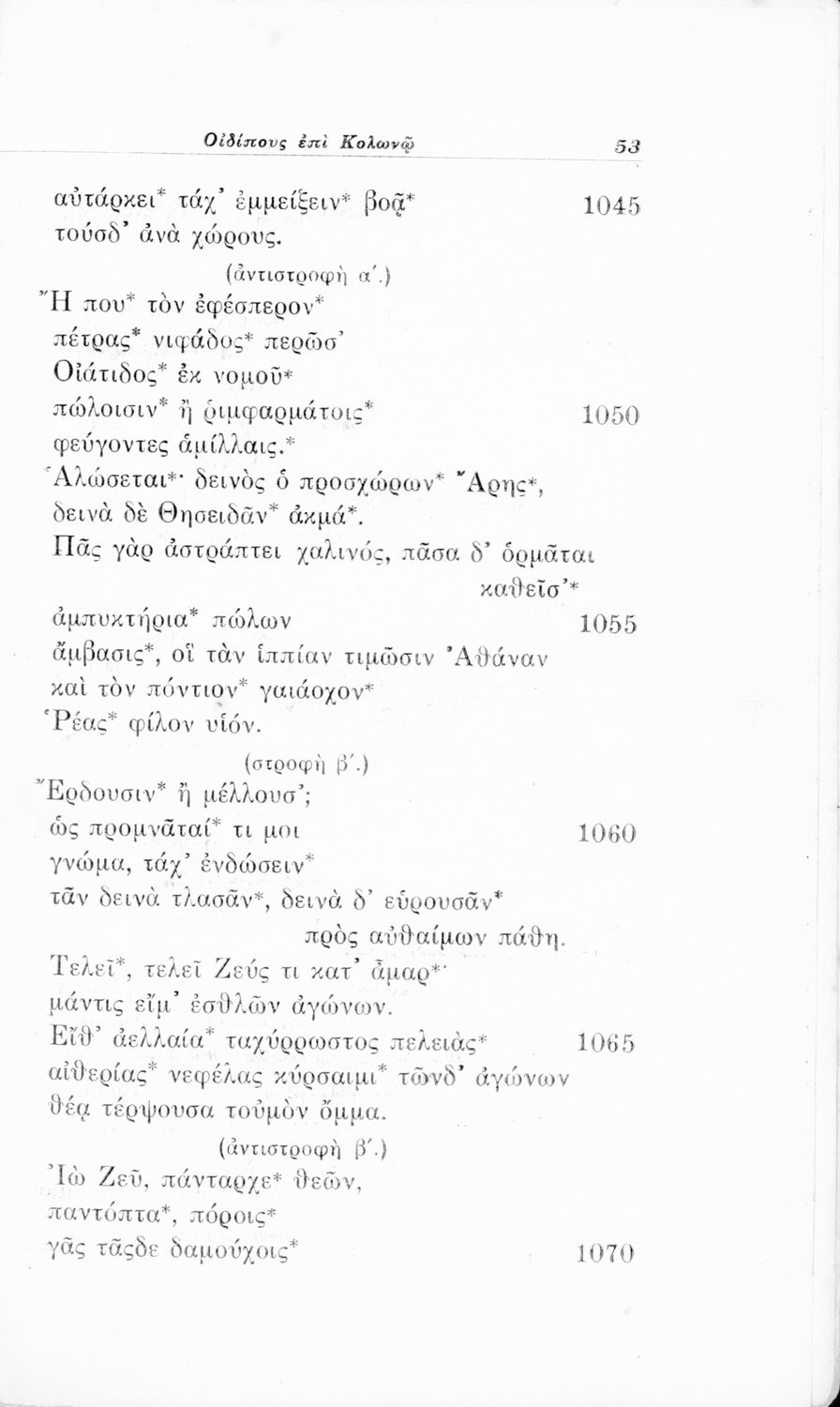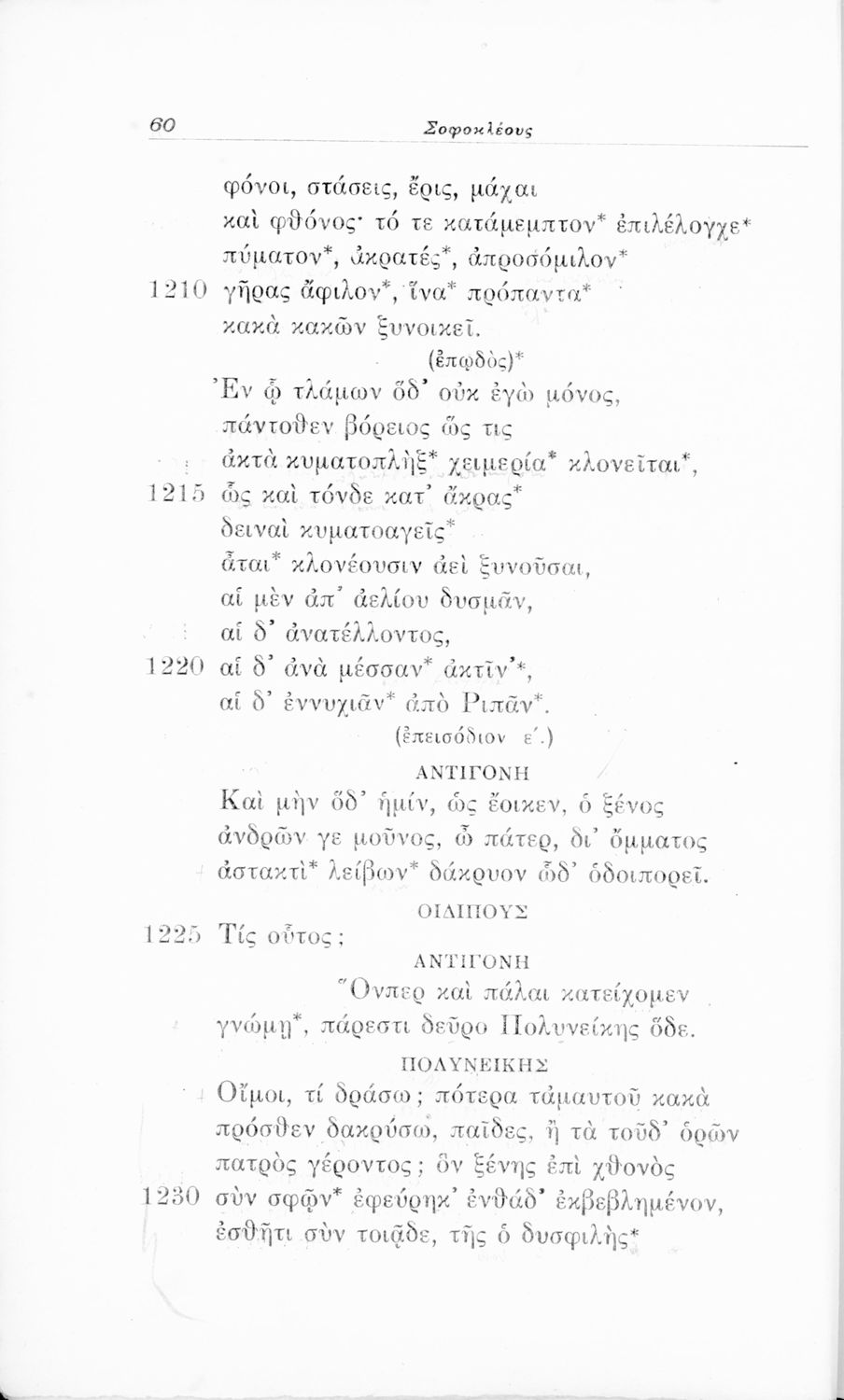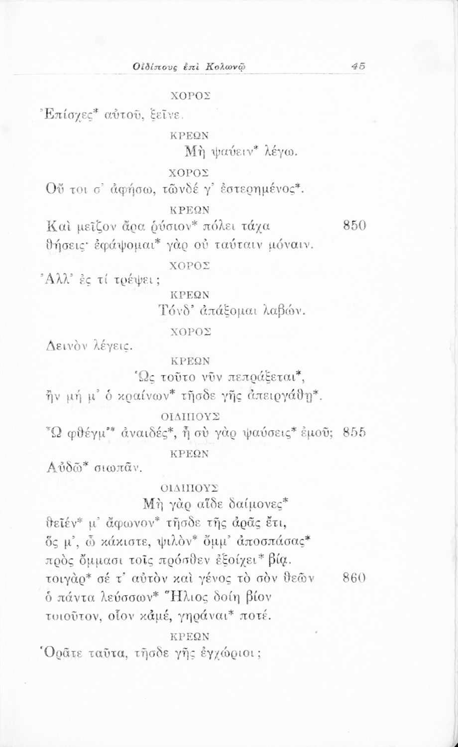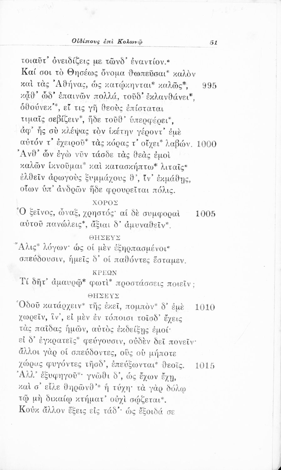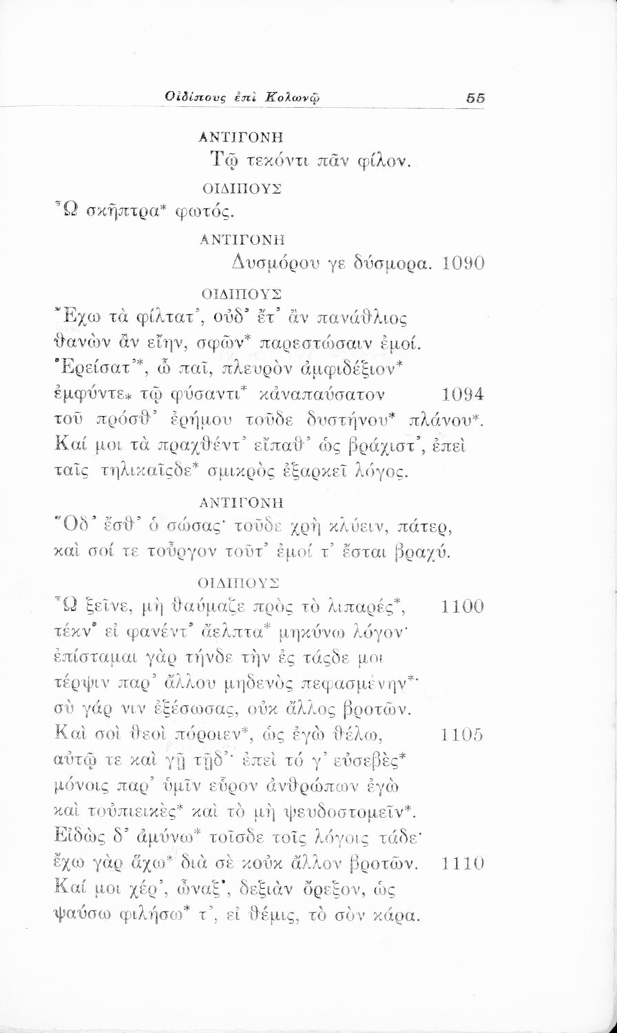 Σχολικό εγχειρίδιο της ΣΤ΄ Γυμνασίου για το μάθημα των Αρχαίων Ελληνικών. Περιλαμβάνει την τραγωδία Οιδίπους επί Κολωνώ, πραγματολογικά σχόλια και λεξιλογικές παρατηρήσεις. Ο συγγραφέας ήταν Γυμνασιάρχης.