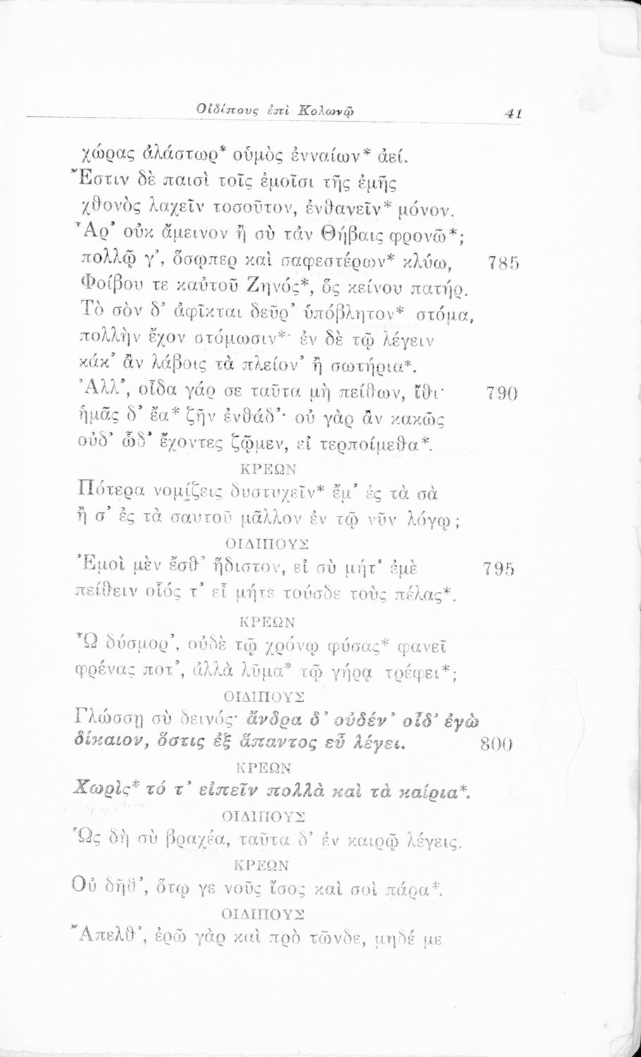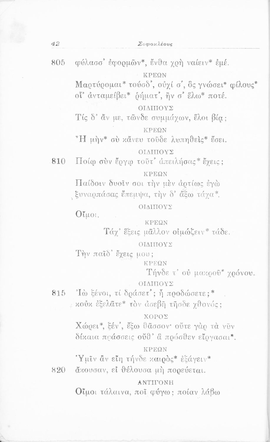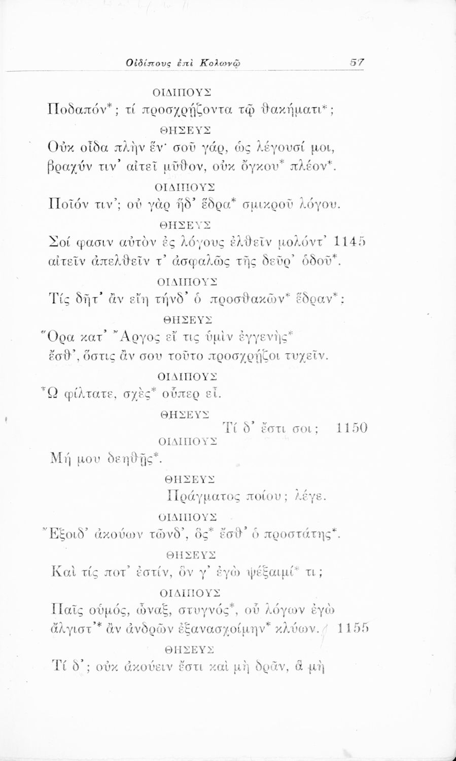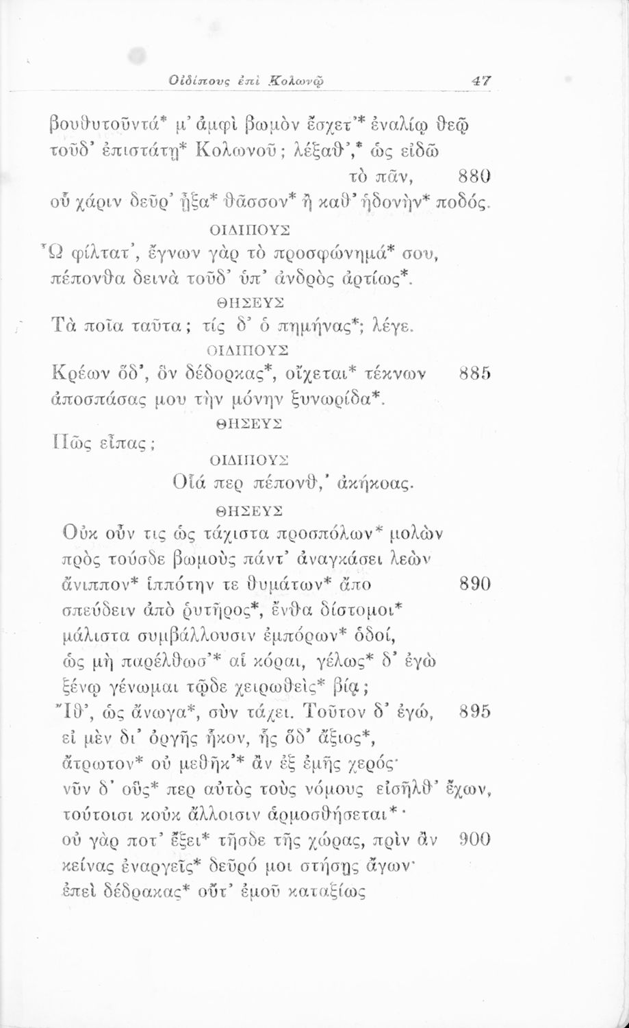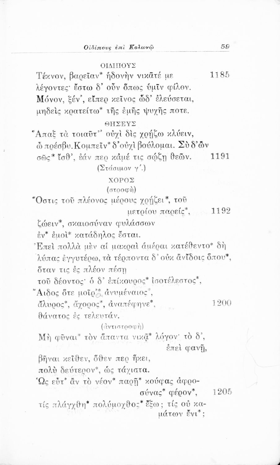 Σχολικό εγχειρίδιο της ΣΤ΄ Γυμνασίου για το μάθημα των Αρχαίων Ελληνικών. Περιλαμβάνει την τραγωδία Οιδίπους επί Κολωνώ, πραγματολογικά σχόλια και λεξιλογικές παρατηρήσεις. Ο συγγραφέας ήταν Γυμνασιάρχης.