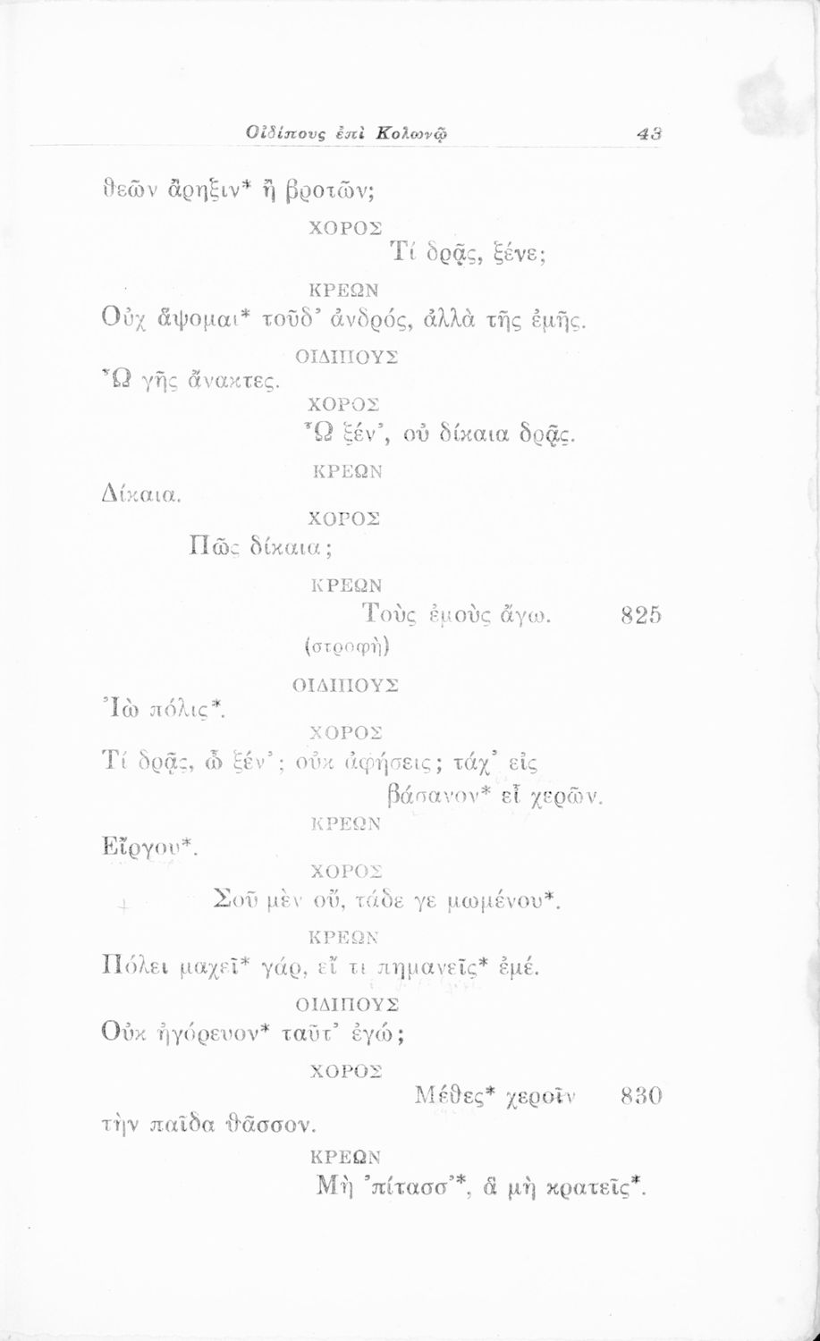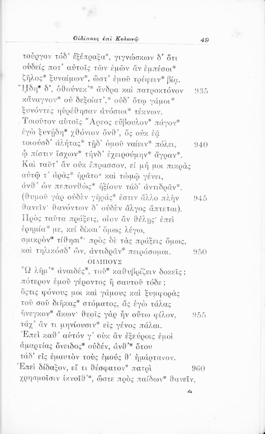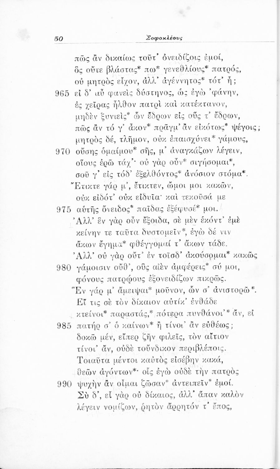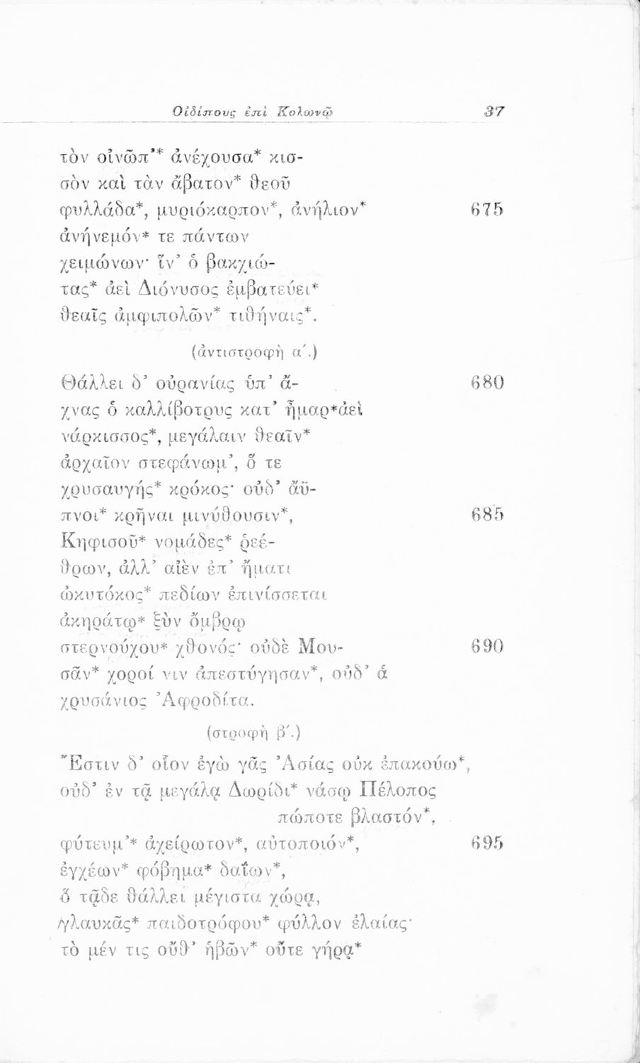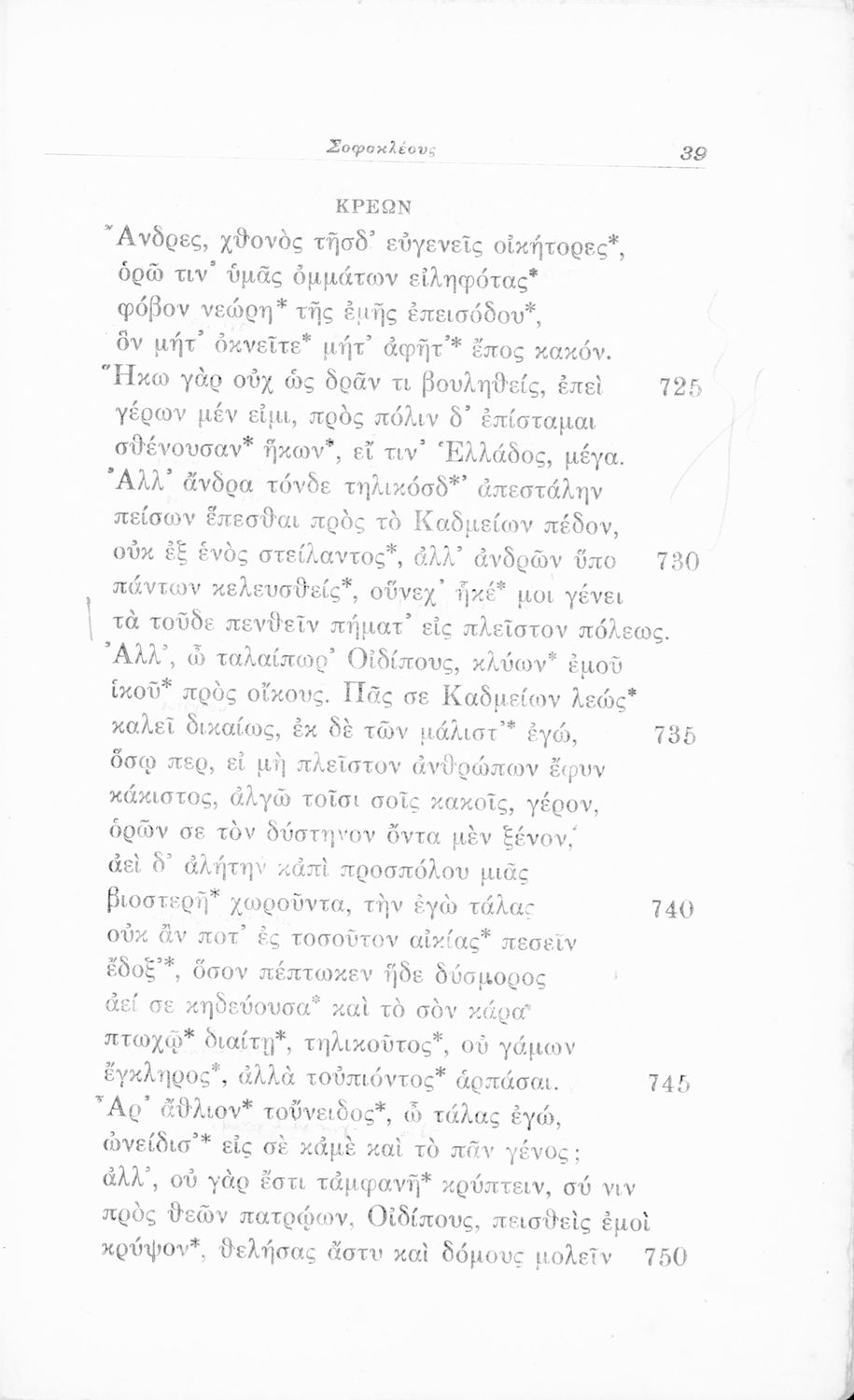 Σχολικό εγχειρίδιο της ΣΤ΄ Γυμνασίου για το μάθημα των Αρχαίων Ελληνικών. Περιλαμβάνει την τραγωδία Οιδίπους επί Κολωνώ, πραγματολογικά σχόλια και λεξιλογικές παρατηρήσεις. Ο συγγραφέας ήταν Γυμνασιάρχης.