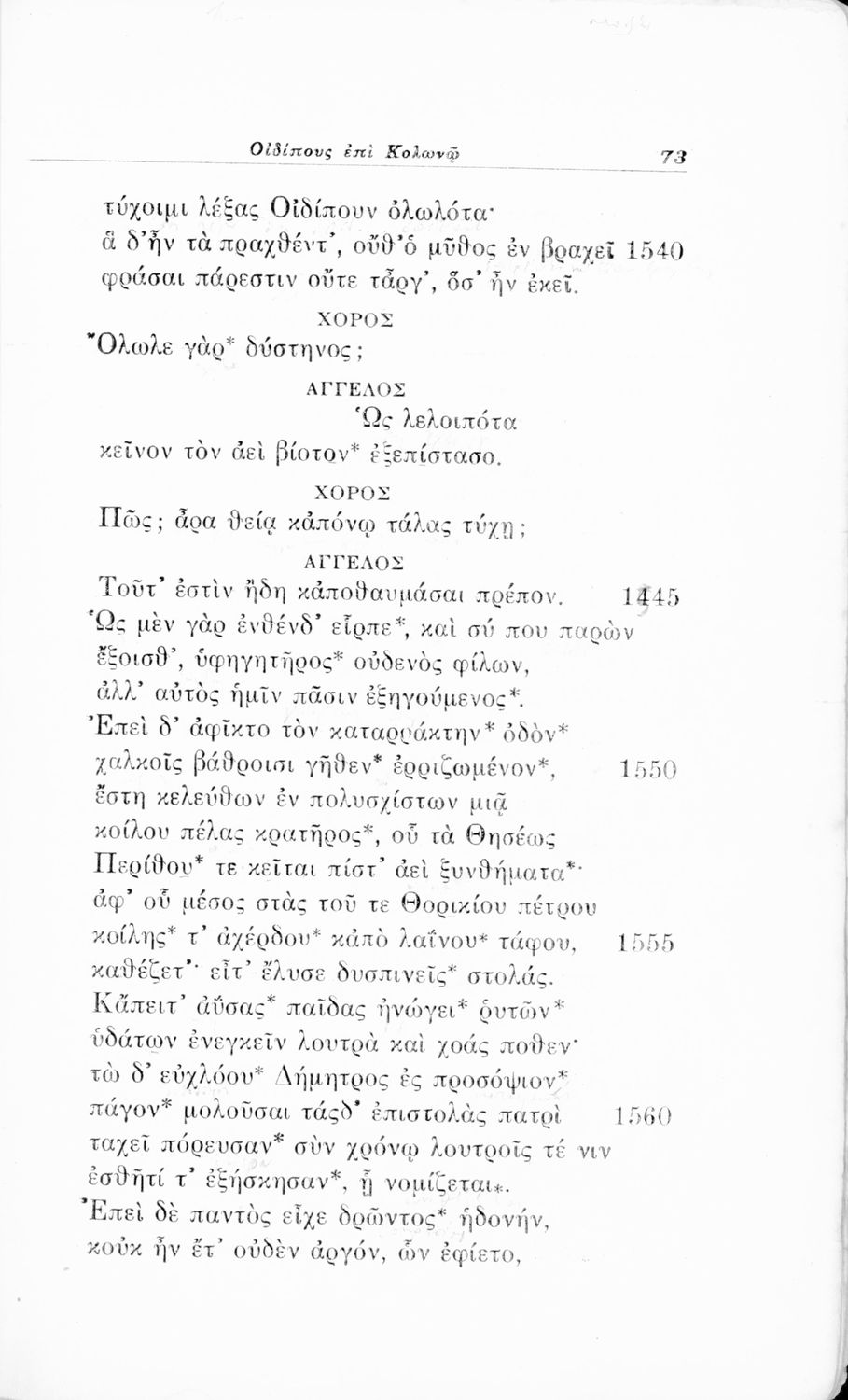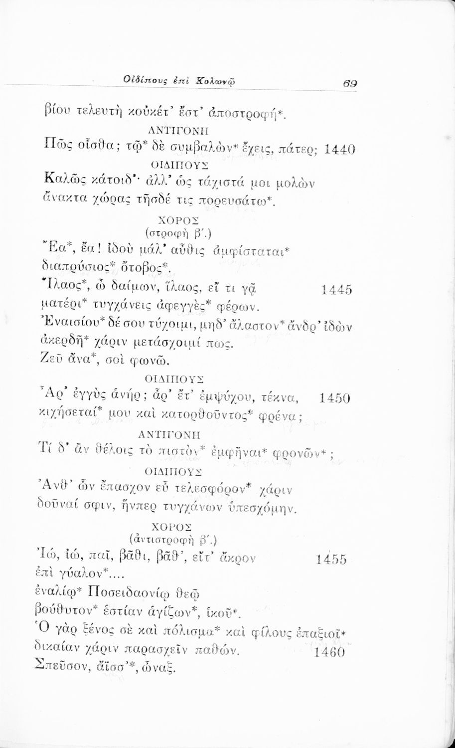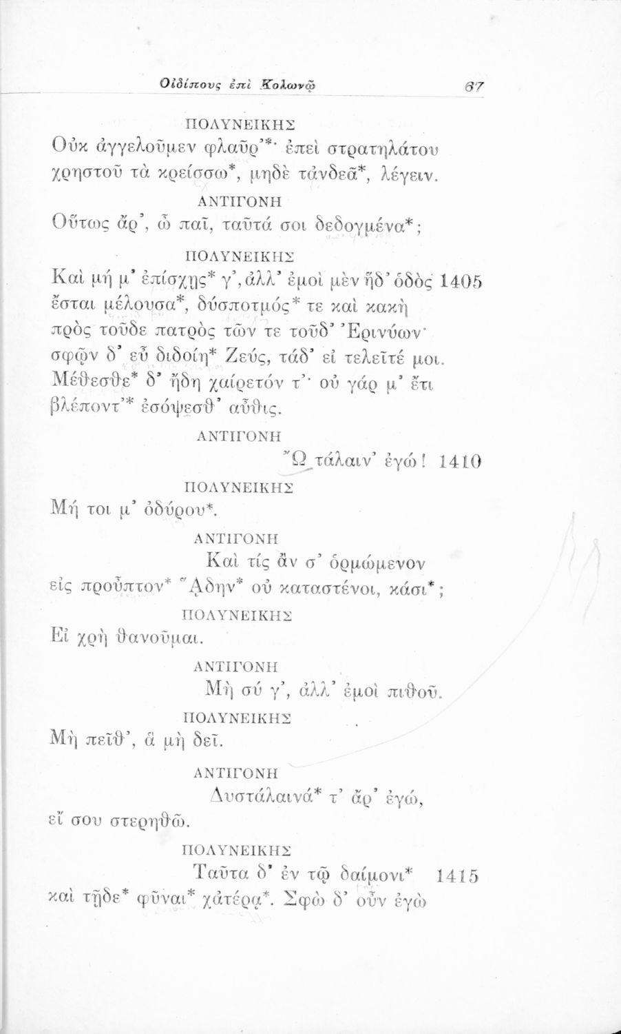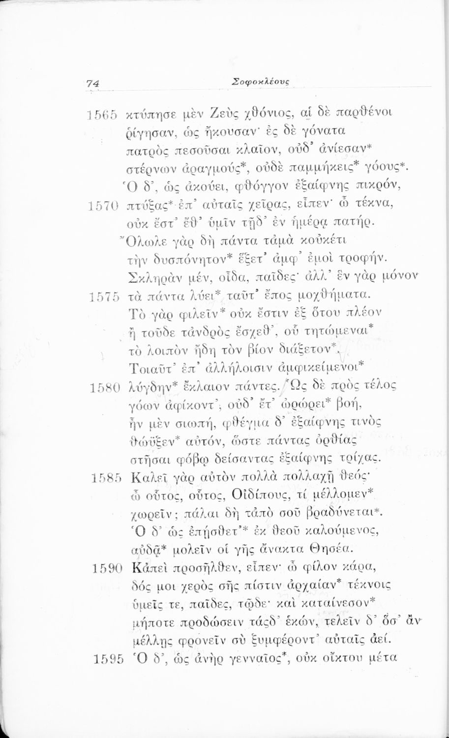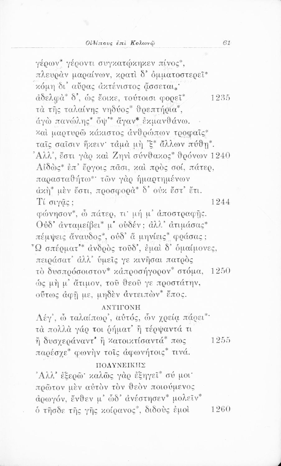 Σχολικό εγχειρίδιο της ΣΤ΄ Γυμνασίου για το μάθημα των Αρχαίων Ελληνικών. Περιλαμβάνει την τραγωδία Οιδίπους επί Κολωνώ, πραγματολογικά σχόλια και λεξιλογικές παρατηρήσεις. Ο συγγραφέας ήταν Γυμνασιάρχης.