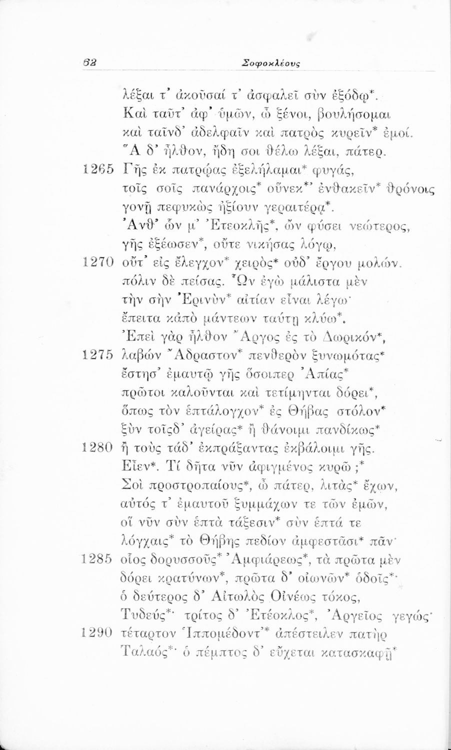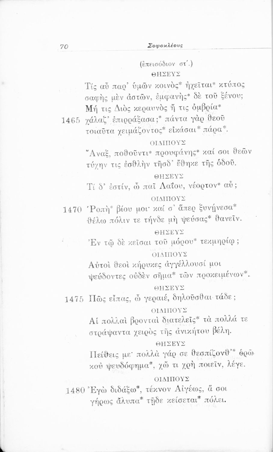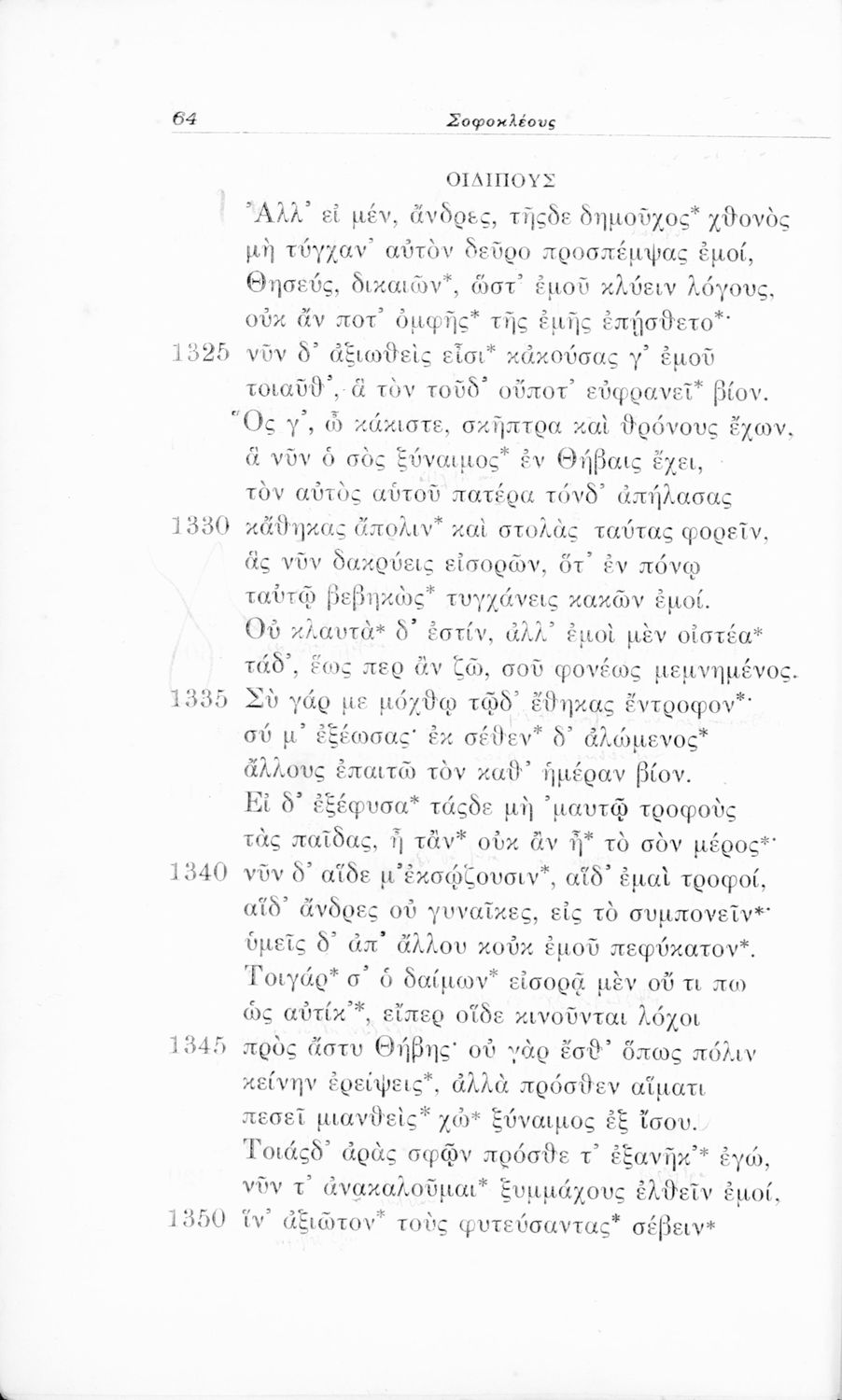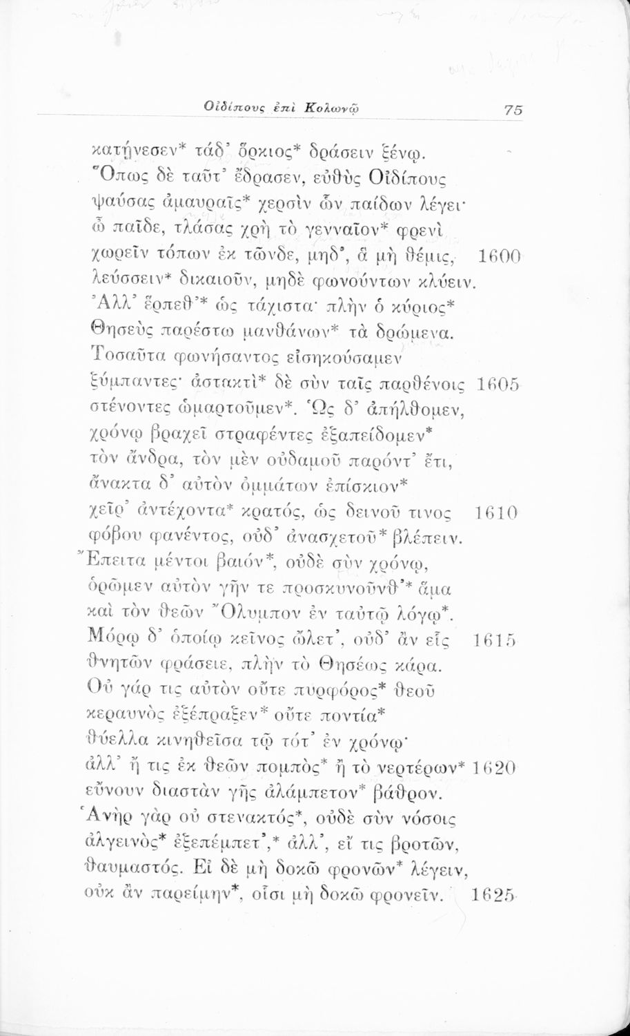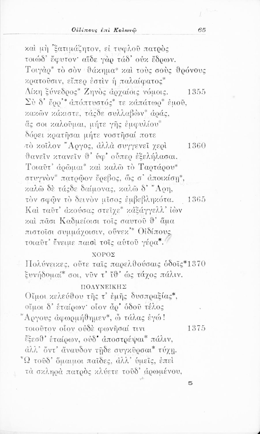 Σχολικό εγχειρίδιο της ΣΤ΄ Γυμνασίου για το μάθημα των Αρχαίων Ελληνικών. Περιλαμβάνει την τραγωδία Οιδίπους επί Κολωνώ, πραγματολογικά σχόλια και λεξιλογικές παρατηρήσεις. Ο συγγραφέας ήταν Γυμνασιάρχης.