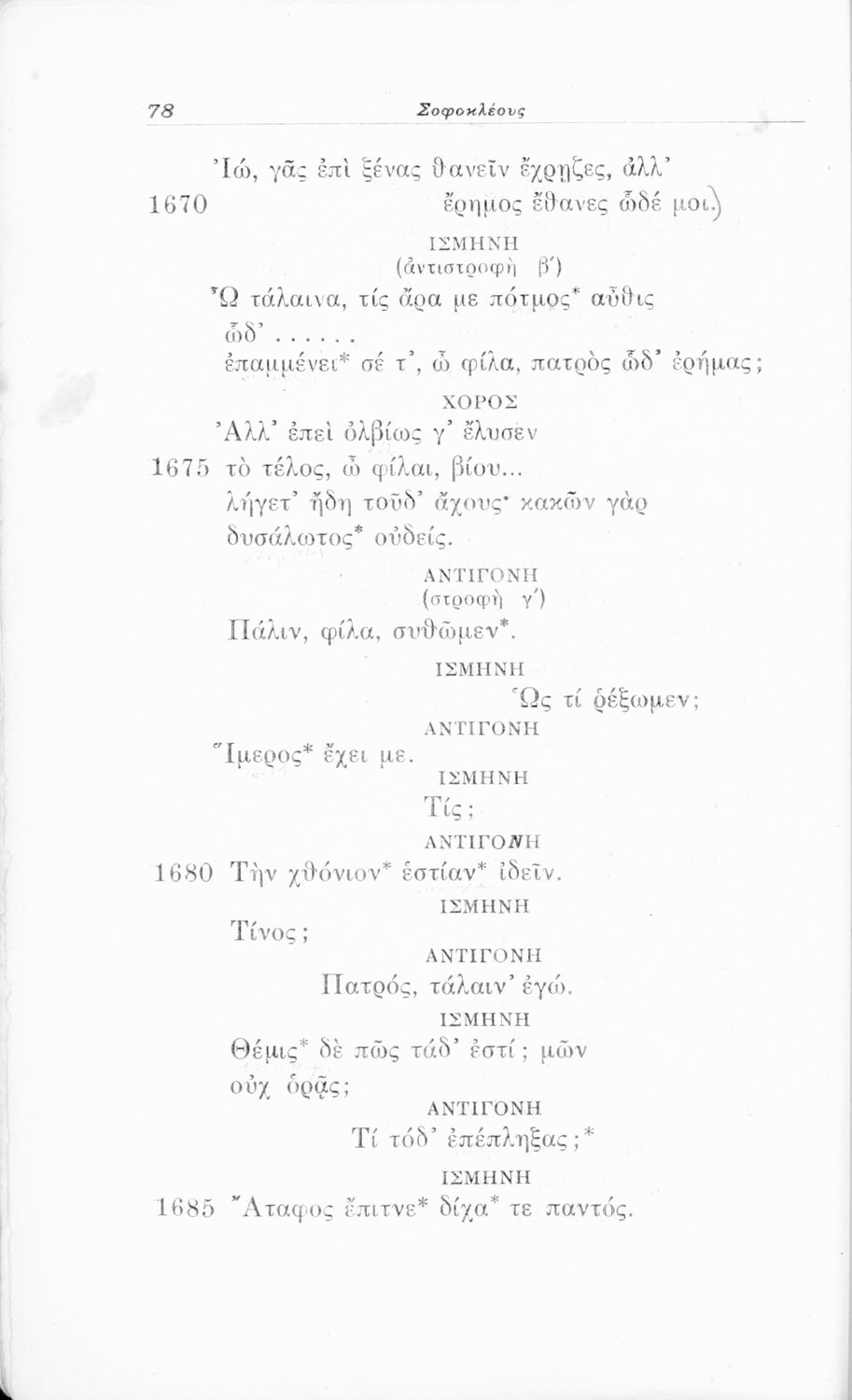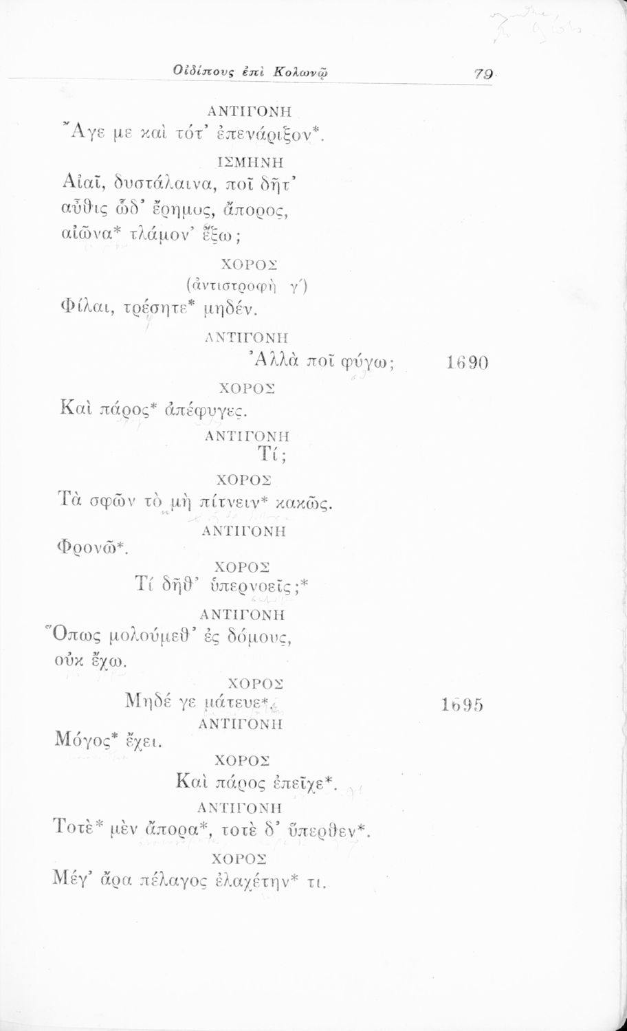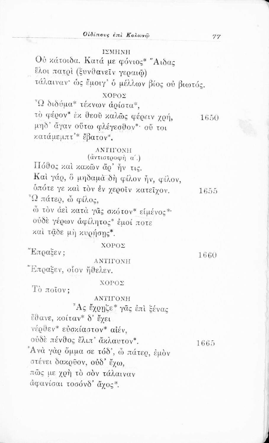 Σχολικό εγχειρίδιο της ΣΤ΄ Γυμνασίου για το μάθημα των Αρχαίων Ελληνικών. Περιλαμβάνει την τραγωδία Οιδίπους επί Κολωνώ, πραγματολογικά σχόλια και λεξιλογικές παρατηρήσεις. Ο συγγραφέας ήταν Γυμνασιάρχης.