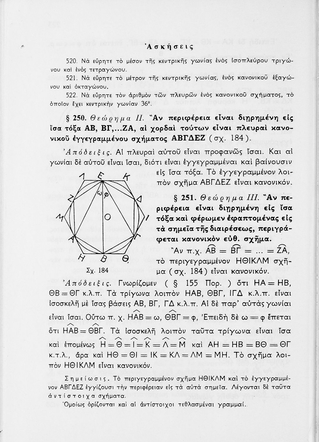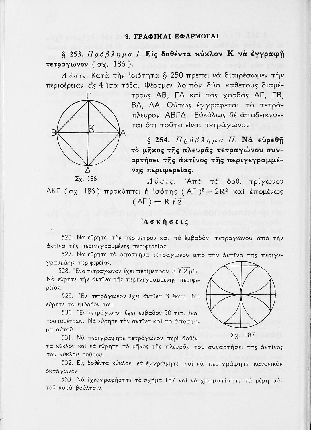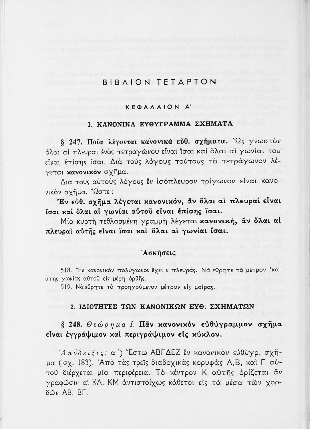 Σχολικό εγχειρίδιο Γεωμετρίας για τις Γ΄, Δ΄, Ε΄, ΣΤ΄ Γυμνασίου που περιλαμβάνει θεωρία και ασκήσεις και είναι χωρισμένο σε Επιπεδομετρία και Στερεομετρία. Φέρει το σύμβολο της δικτατορίας.