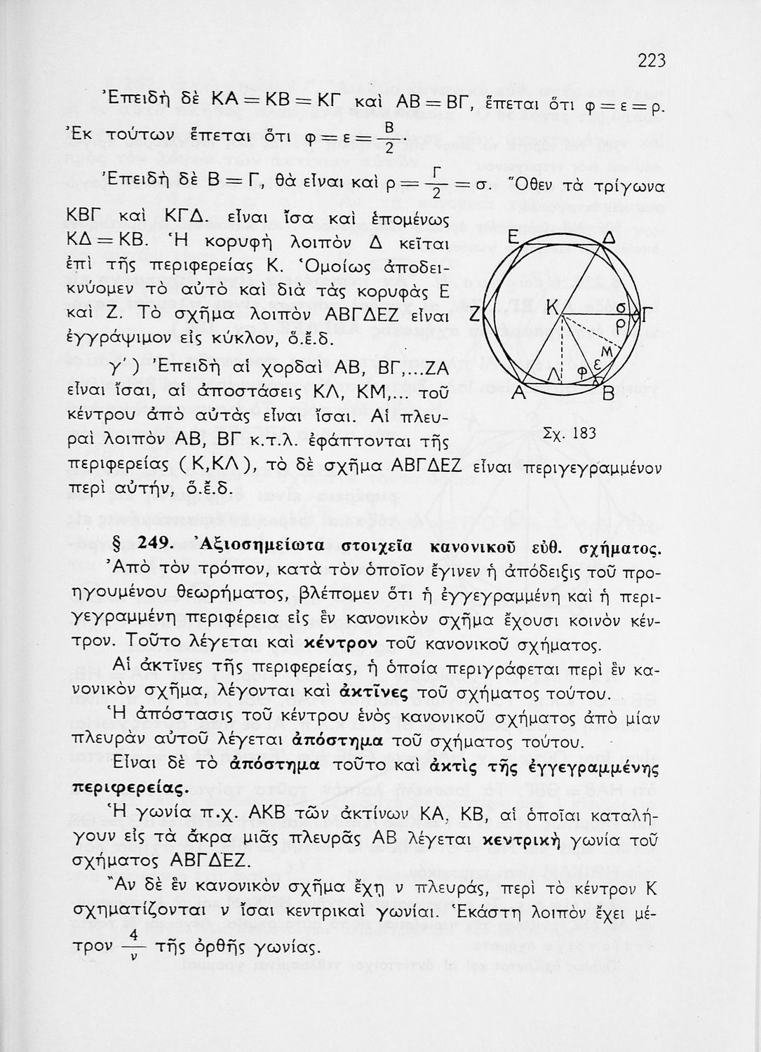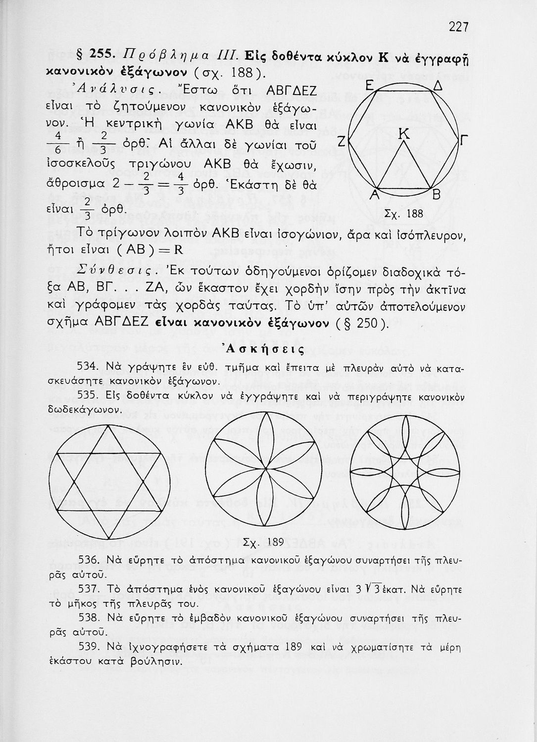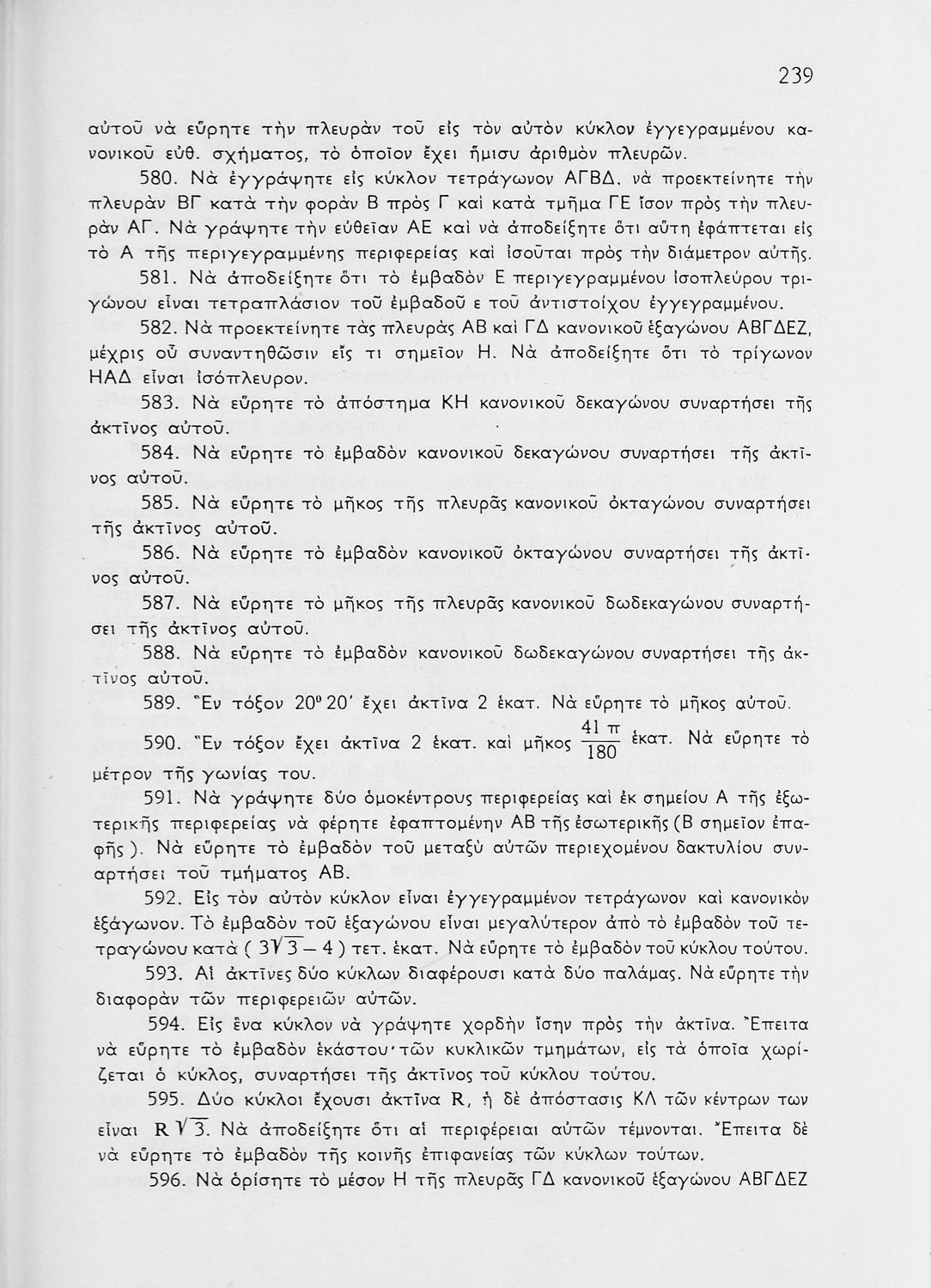 Σχολικό εγχειρίδιο Γεωμετρίας για τις Γ΄, Δ΄, Ε΄, ΣΤ΄ Γυμνασίου που περιλαμβάνει θεωρία και ασκήσεις και είναι χωρισμένο σε Επιπεδομετρία και Στερεομετρία. Φέρει το σύμβολο της δικτατορίας.
