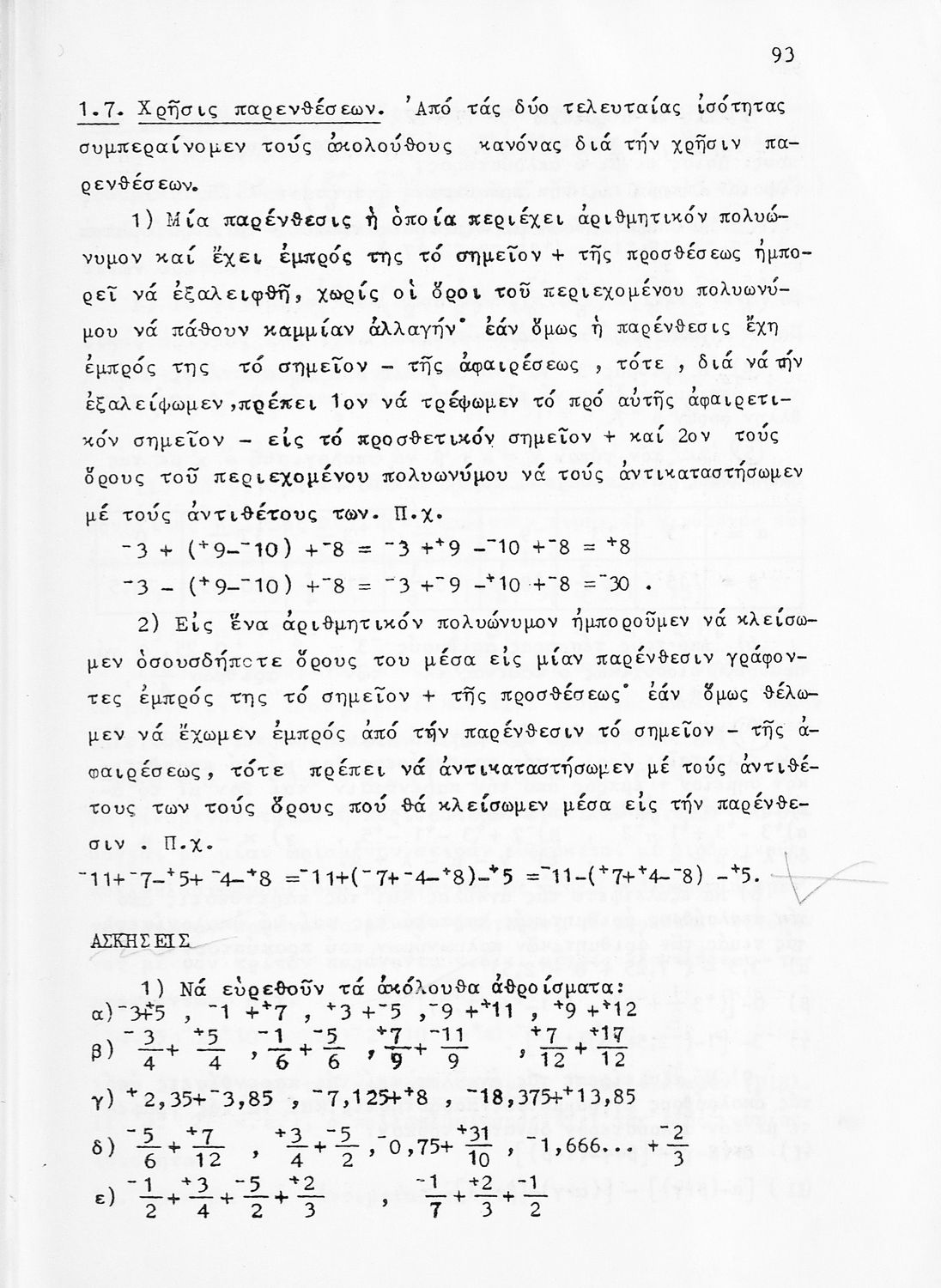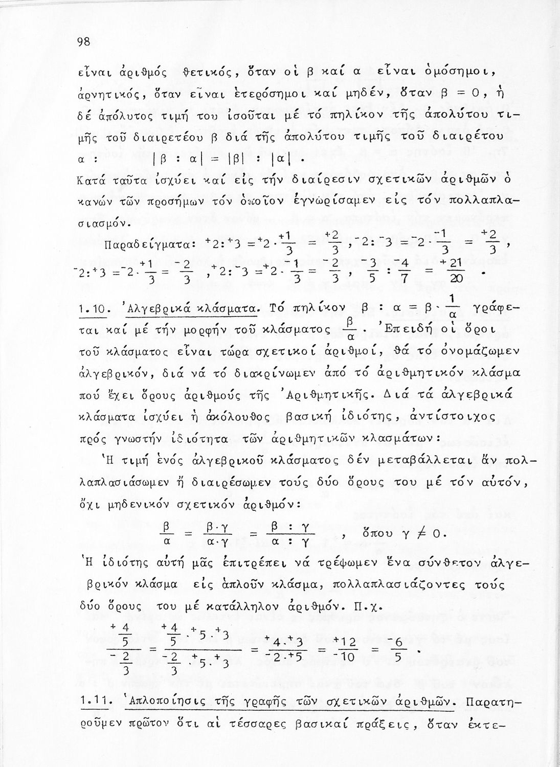 Σχολικό εγχειρίδιο Αριθμητικής για τις Α΄, Β΄, Γ΄ Γυμνασίου και τα Ανώτερα Παρθεναγωγεία που είναι χωρισμένο σε θεωρία και ασκήσεις και εστιάζει στις αριθμητικές πράξεις με κλάσματα και ακέραιους και συμμιγείς