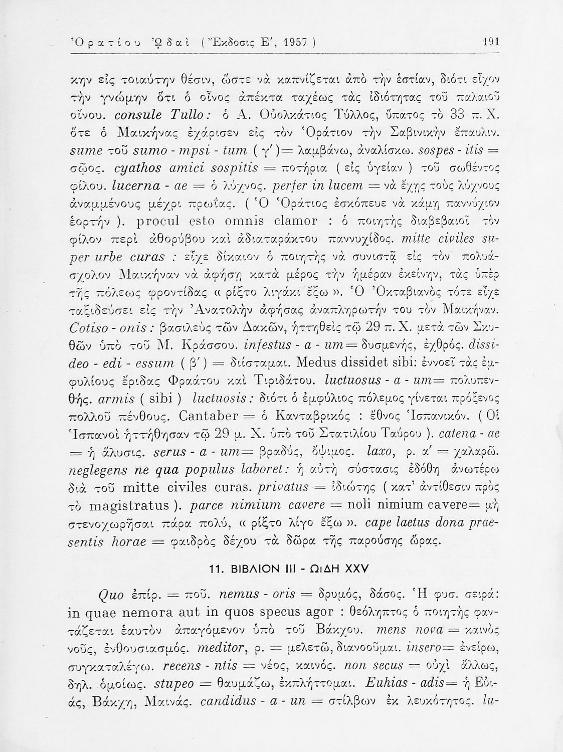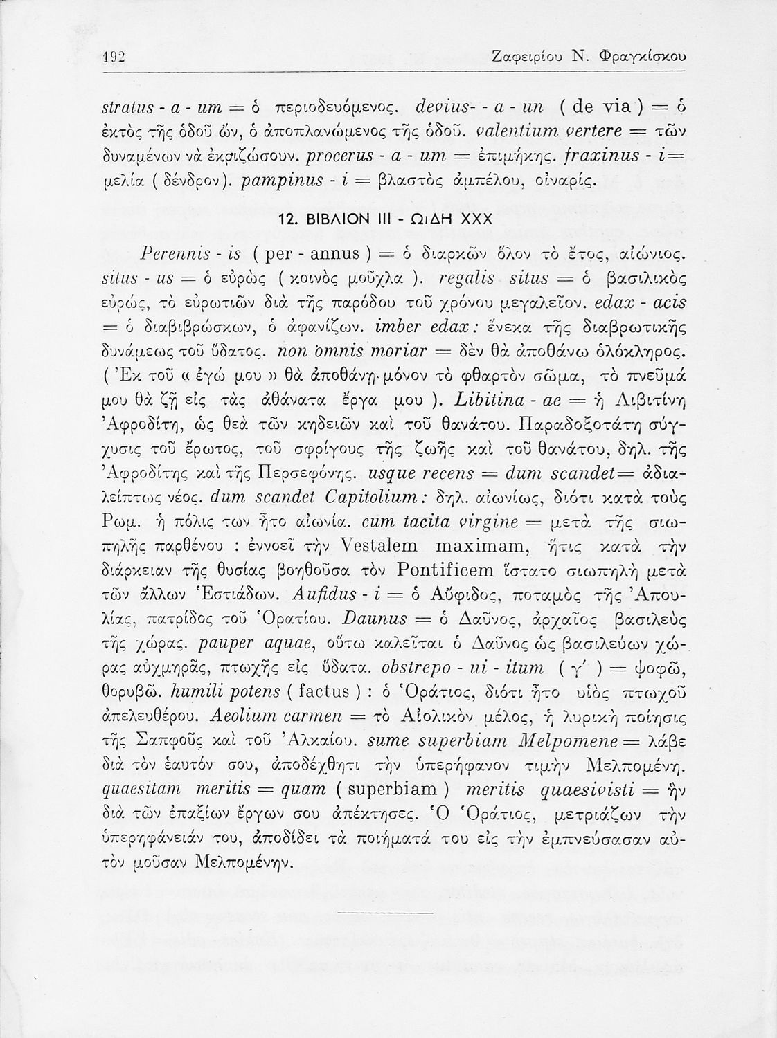 Βαθμίδα εκπαίδευσης: Δευτεροβάθμια Μάθημα: Λατινικά Γλώσσα: Απλή καθαρεύουσα Παρουσίαση περιεχομένου: Σχολικό εγχειρίδιο Λατινικών που περιέχει αποσπάσματα από έργα τριών Λατίνων συγγραφέων, βιογραφικά σημειώματα των συγγραφέων, εισαγωγικά σχόλια, και ερμηνευτικές παρατηρήσεις. |