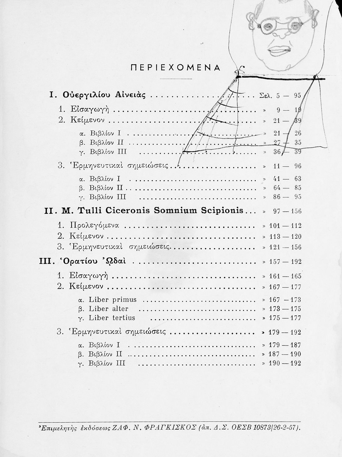 Σχολικό εγχειρίδιο Λατινικών που περιέχει αποσπάσματα από έργα τριών Λατίνων συγγραφέων, βιογραφικά σημειώματα των συγγραφέων, εισαγωγικά σχόλια, και ερμηνευτικές παρατηρήσεις.